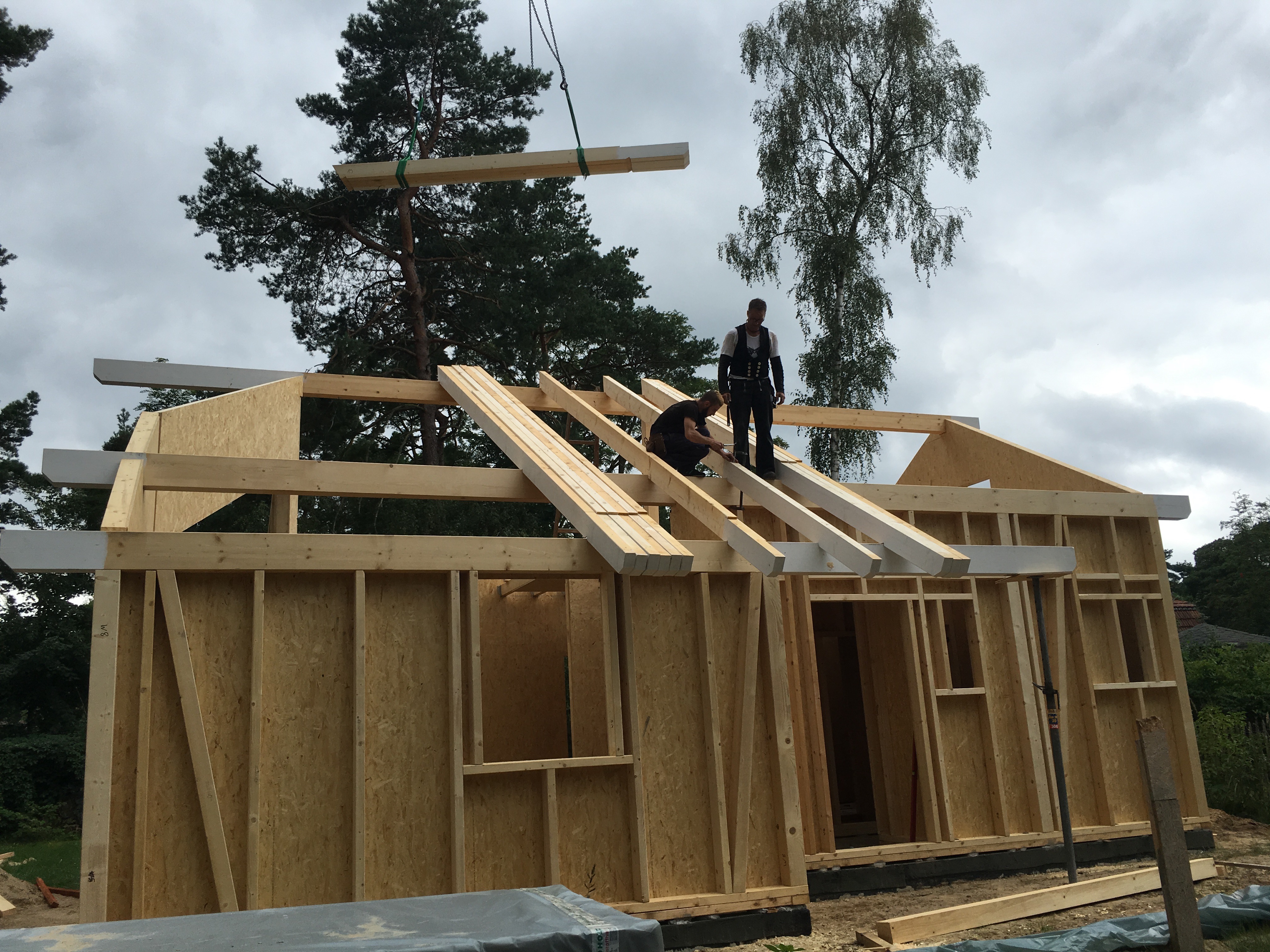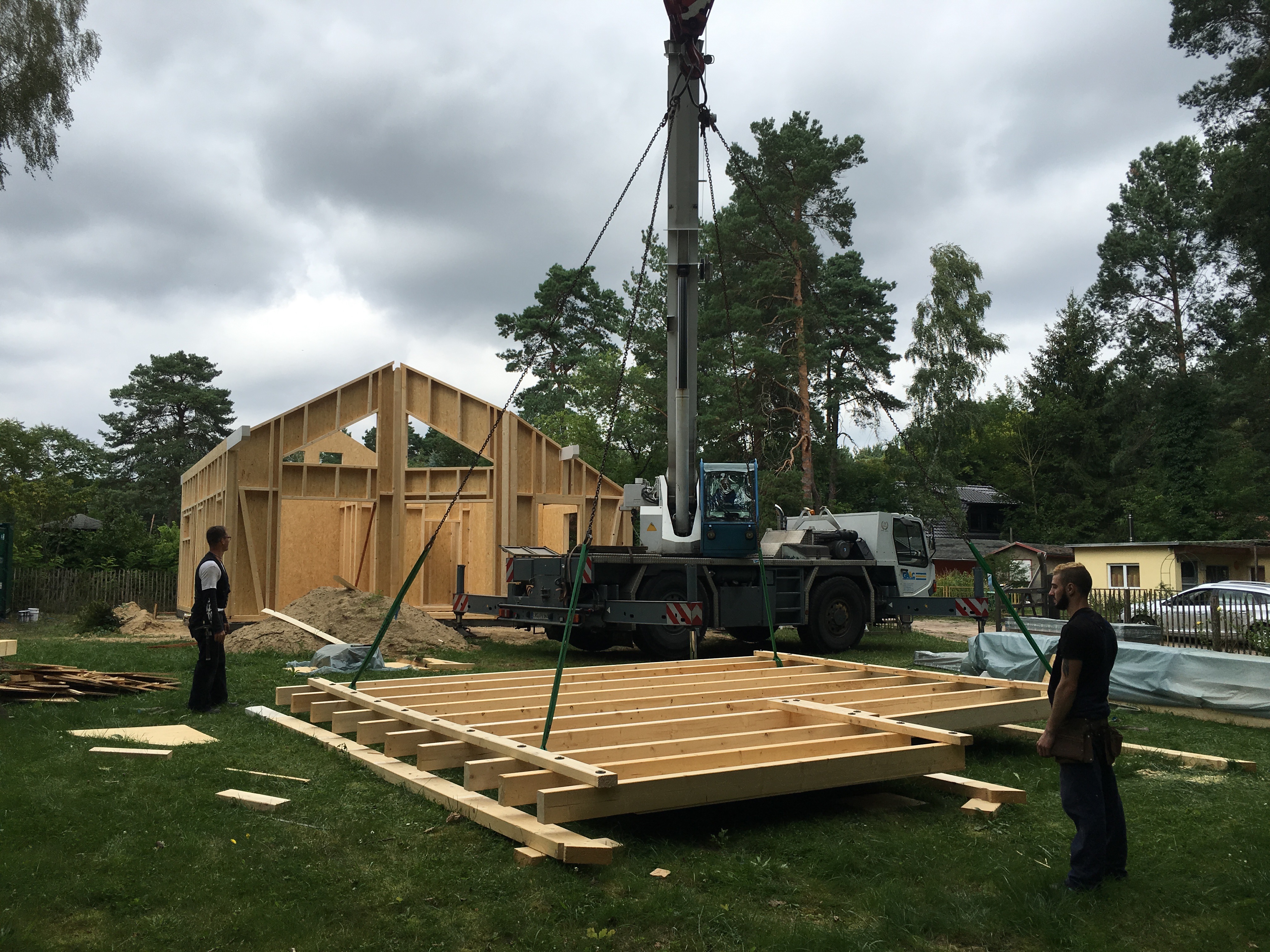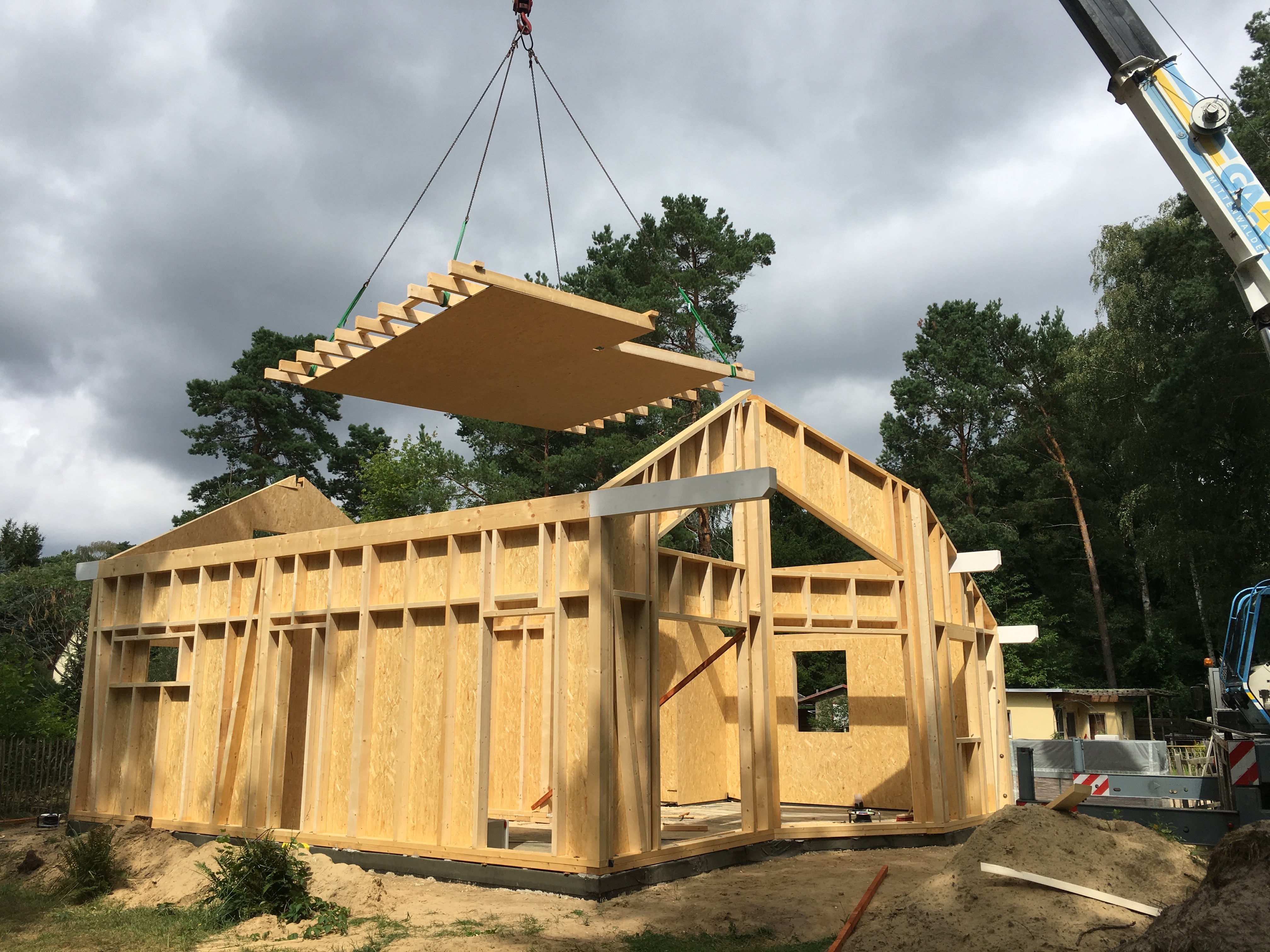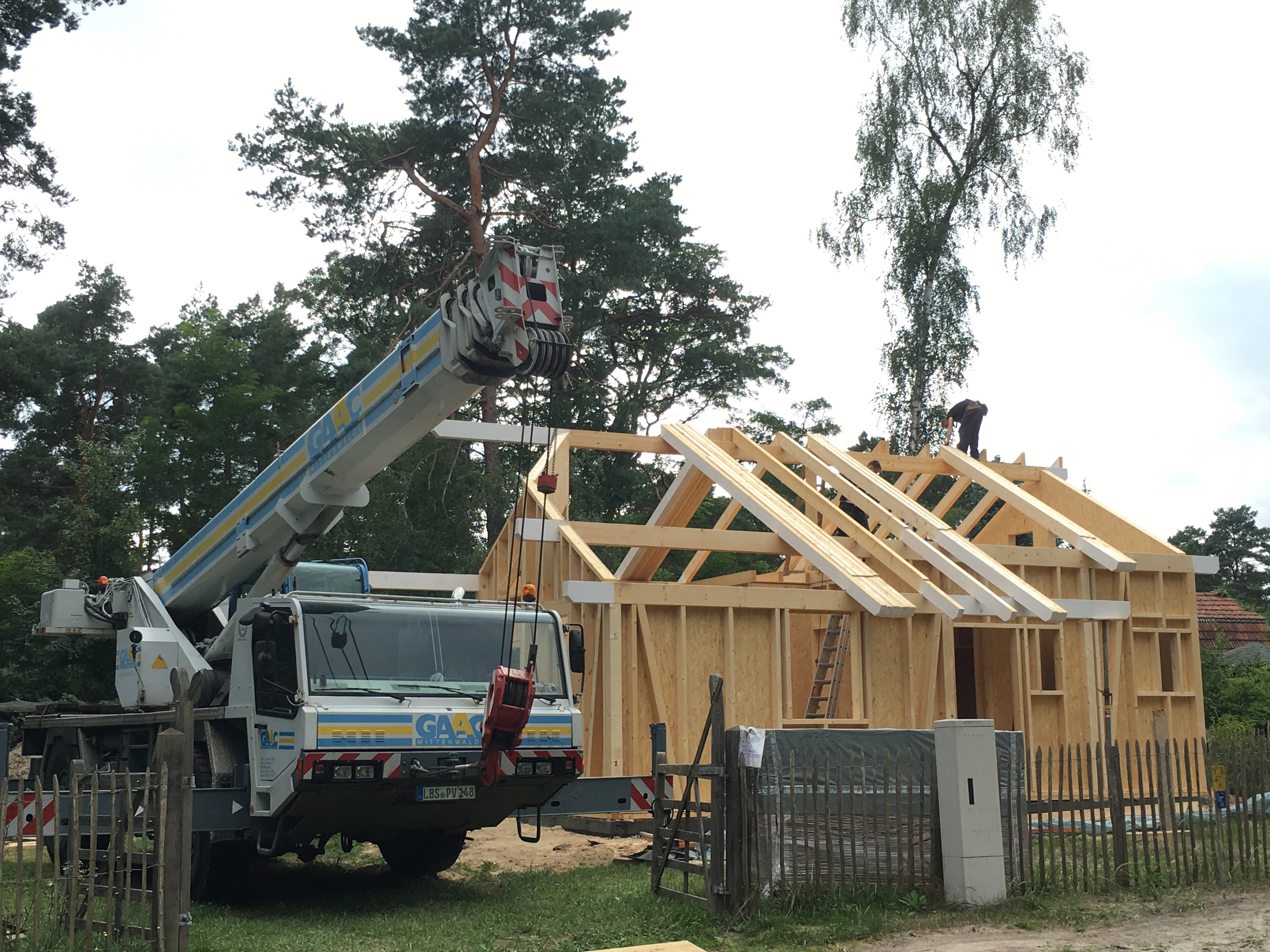 Ich bin so gegen 13:30 vom Büro direkt nach Bestensee gefahren. Schon als ich in die Straße eingebogen bin, konnte ich den Kran sehen…die Spannung stieg…und da stand ein Haus !!!