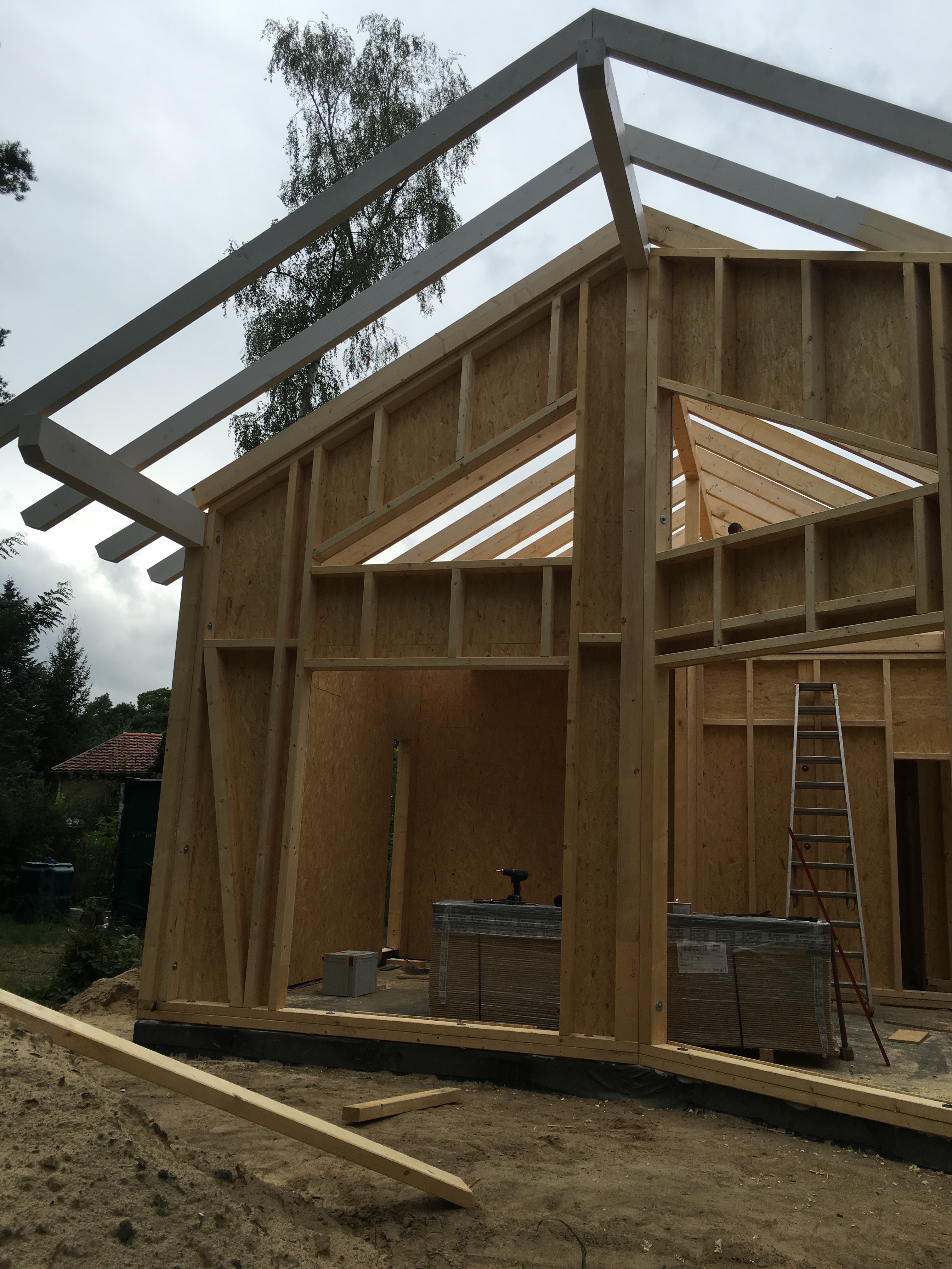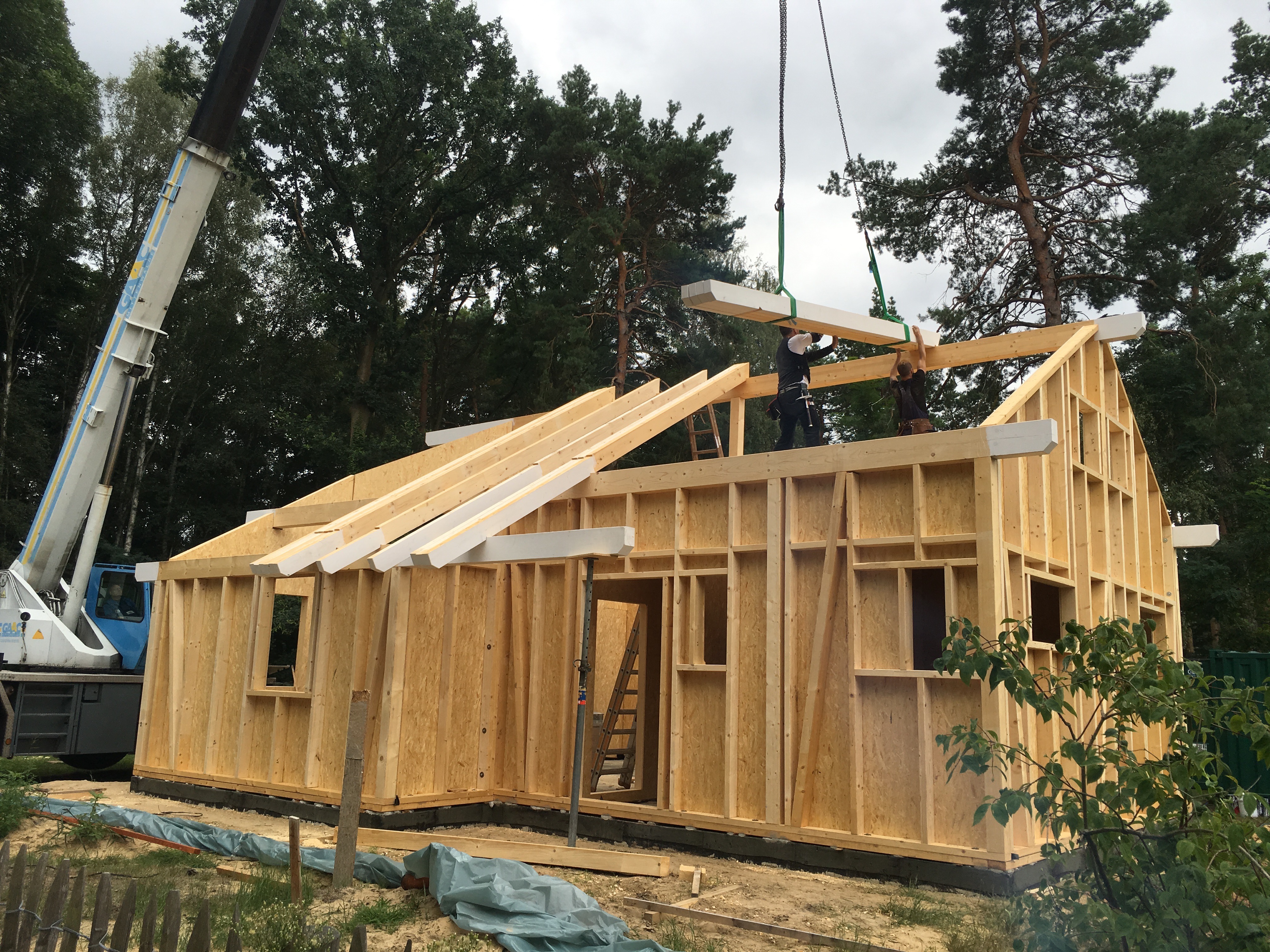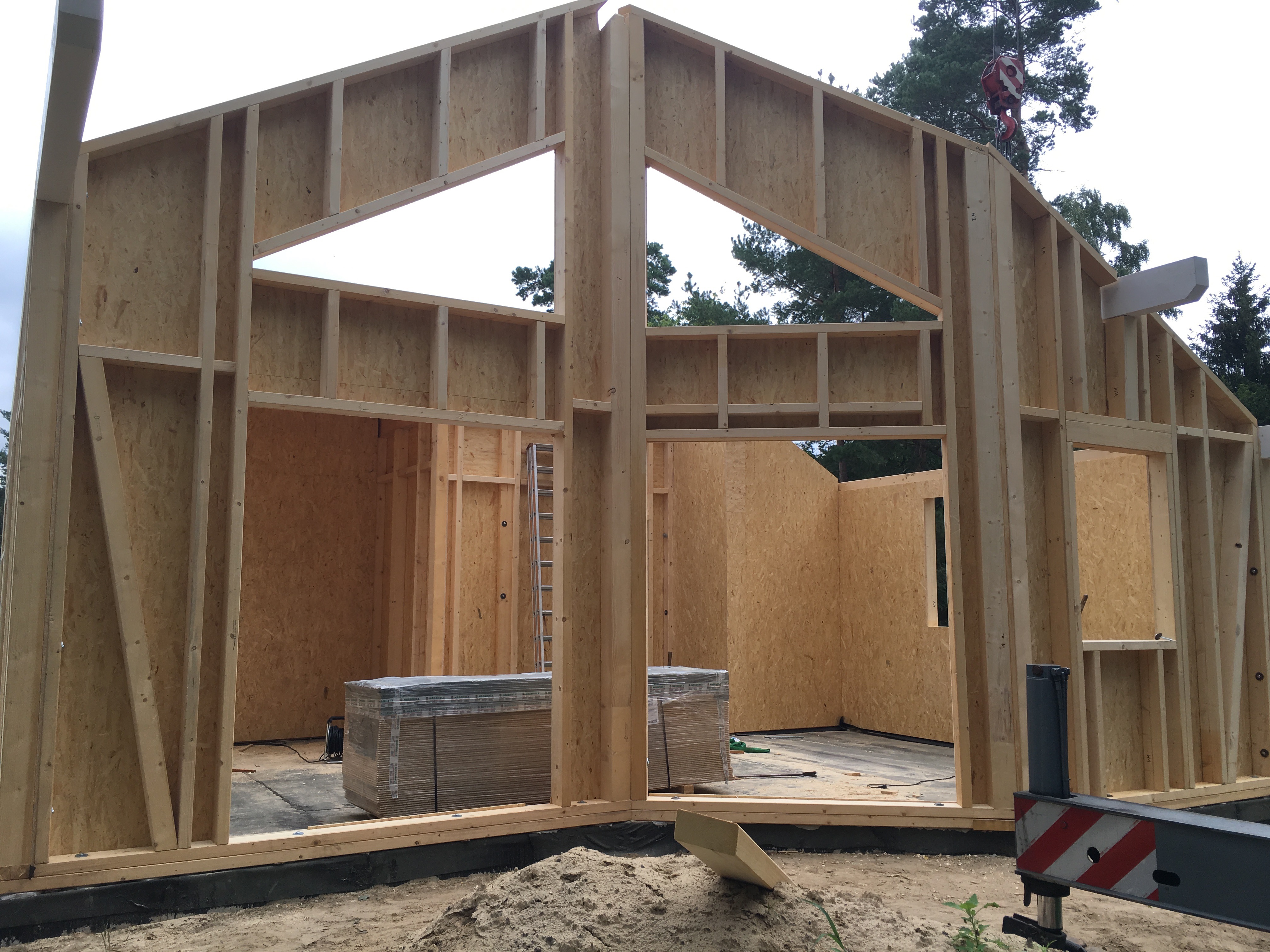 Ich bin so gegen 13:30 vom Büro direkt nach Bestensee gefahren. Schon als ich in die Straße eingebogen bin, konnte ich den Kran sehen…die Spannung stieg…und da stand ein Haus !!!