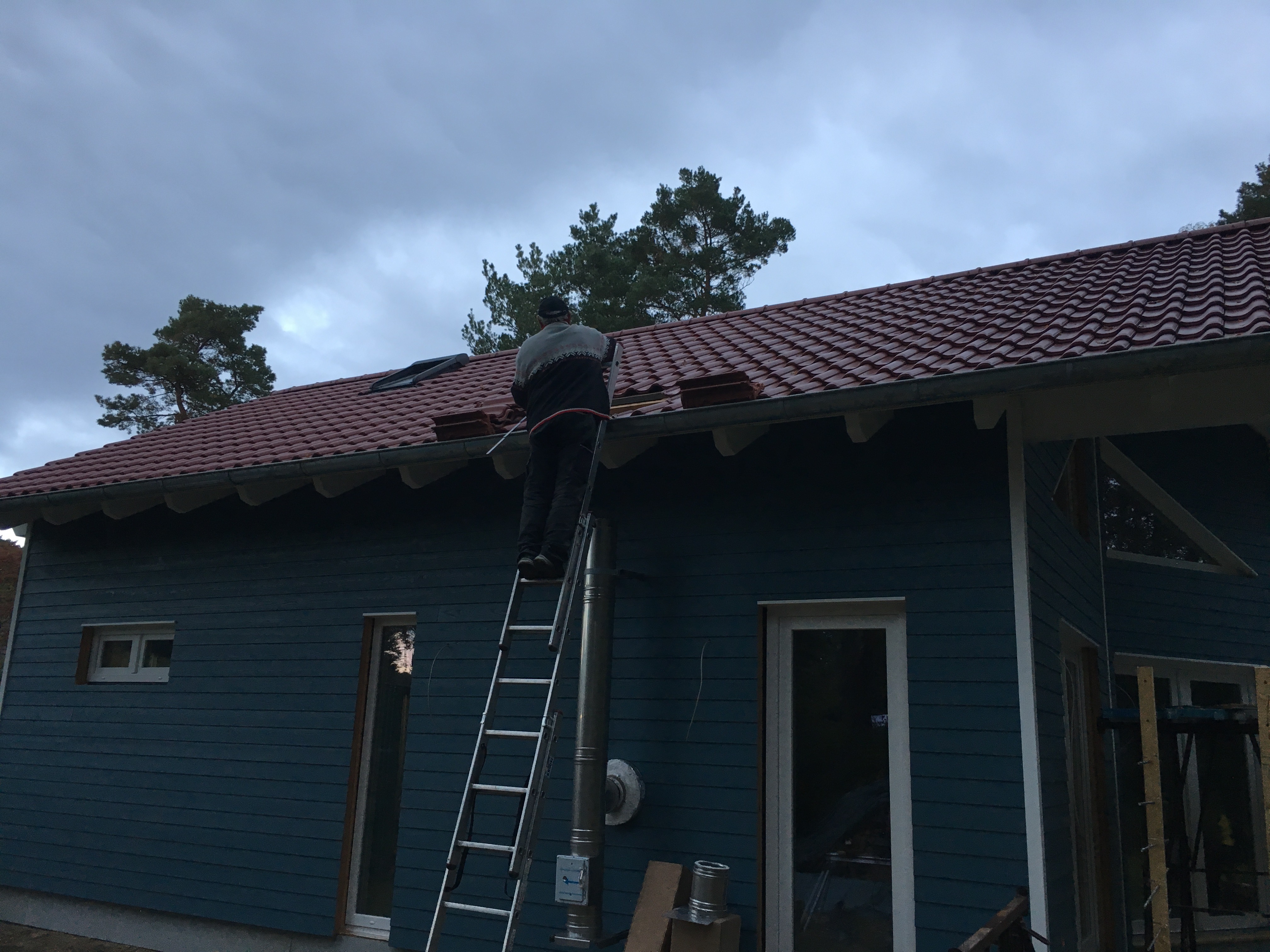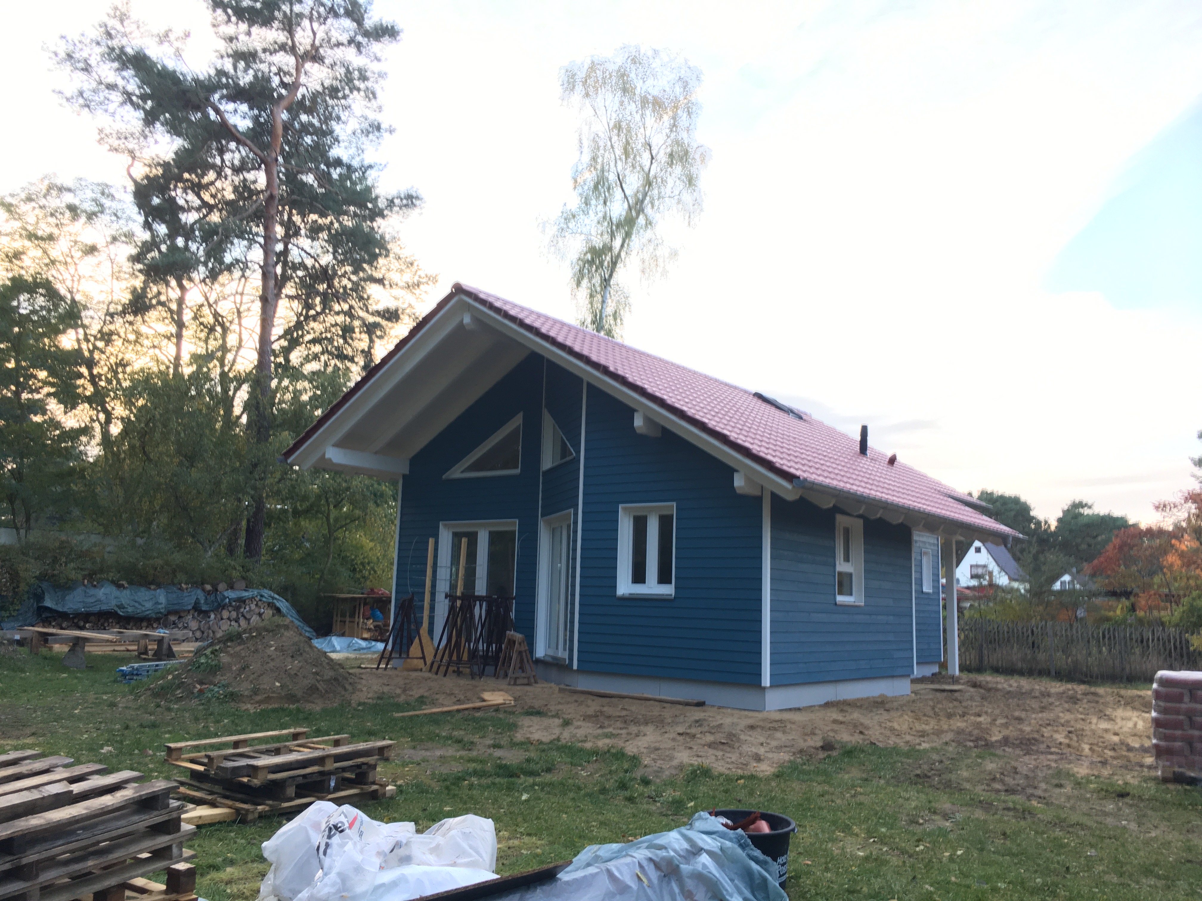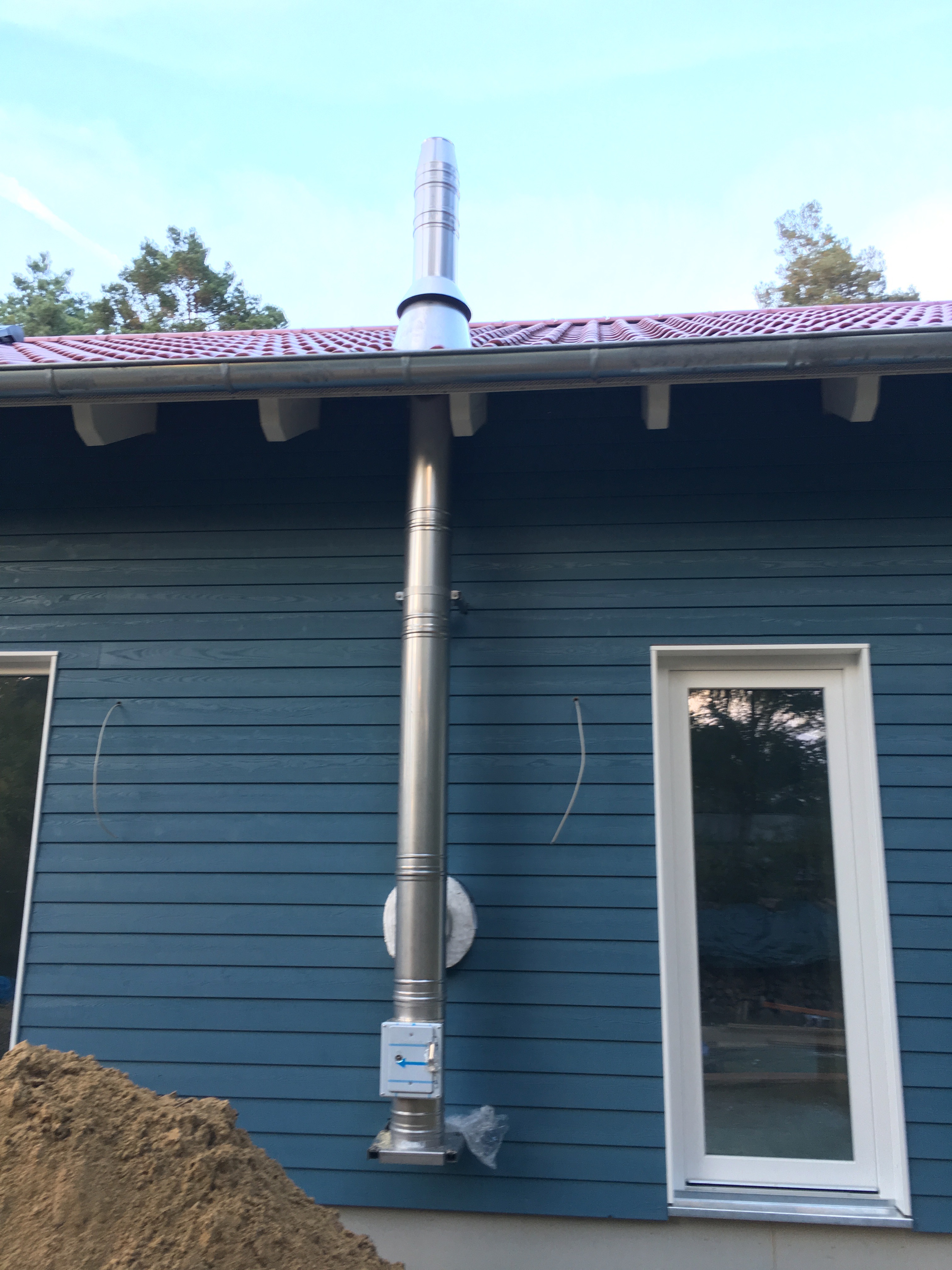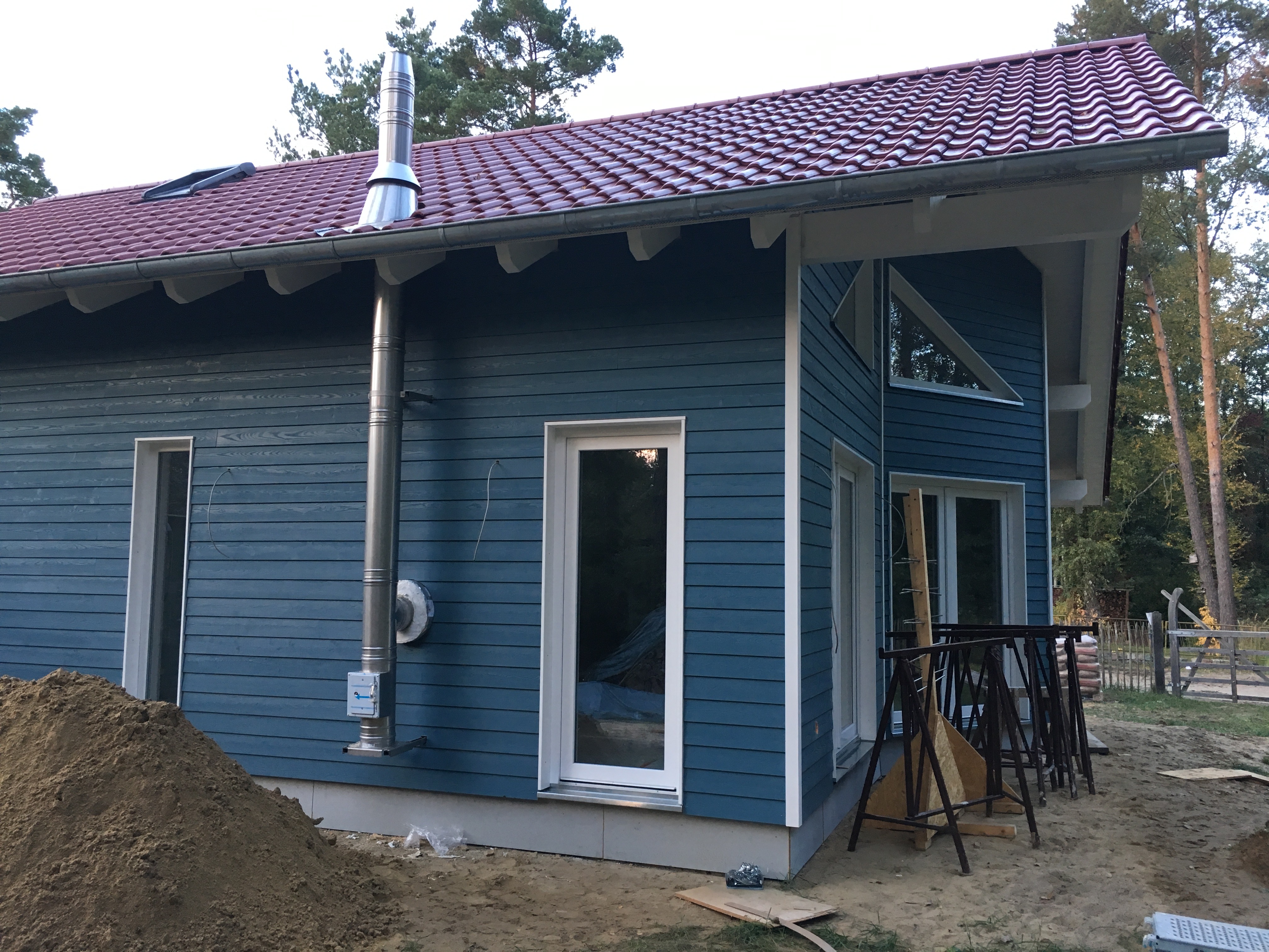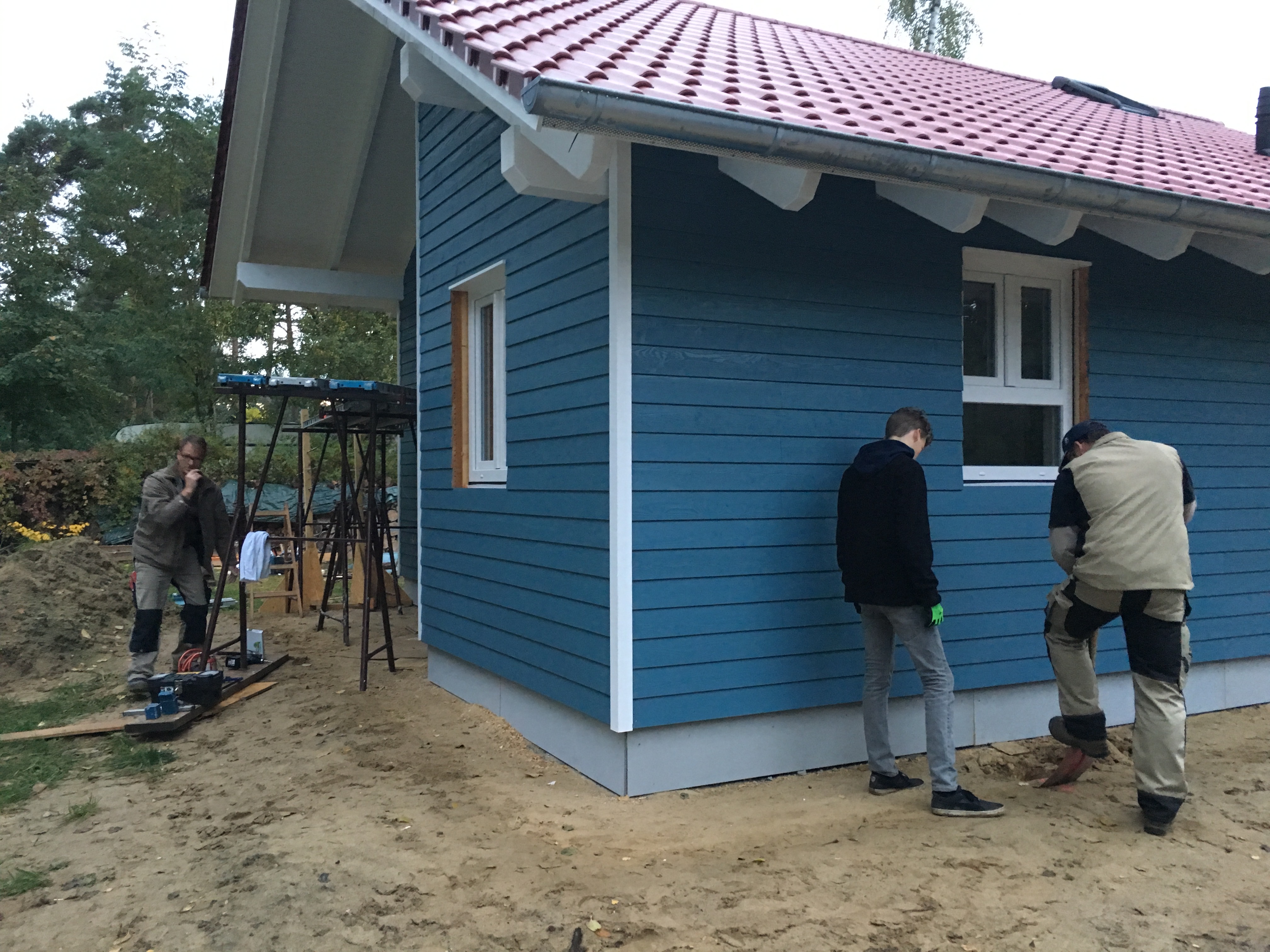 Heute war Großeinsatz ! Fa. Kammin ist endlich da und macht die Dachdurchführung des Schornsteins – Heiko 1 war da und hat mit seinem Kollegen alle Fenster und Türensimse gebaut und der Kanalbauer war da um den Kanalschacht zu setzen und die Abwasserleitungen anzuschliessen ….und da tauchten noch die Straßenbauer auf und wollten anfangen…was schwerlich ging, da die ganze Straße mit Handwerkerautos zugeparkt war….