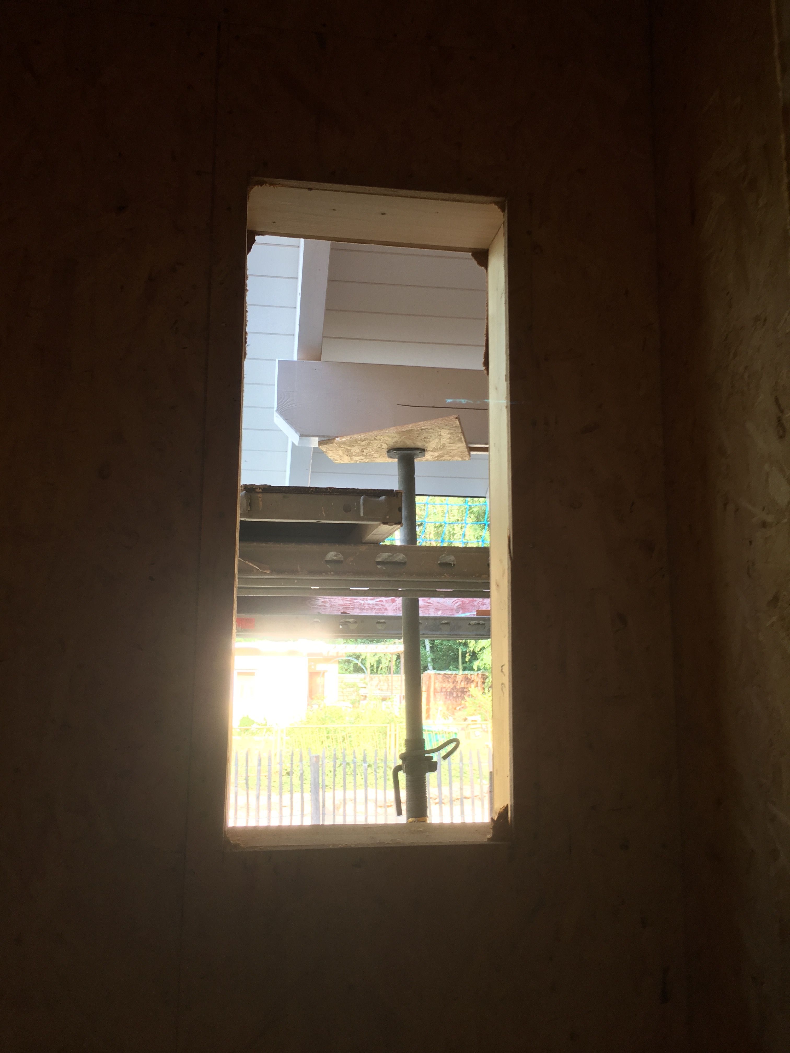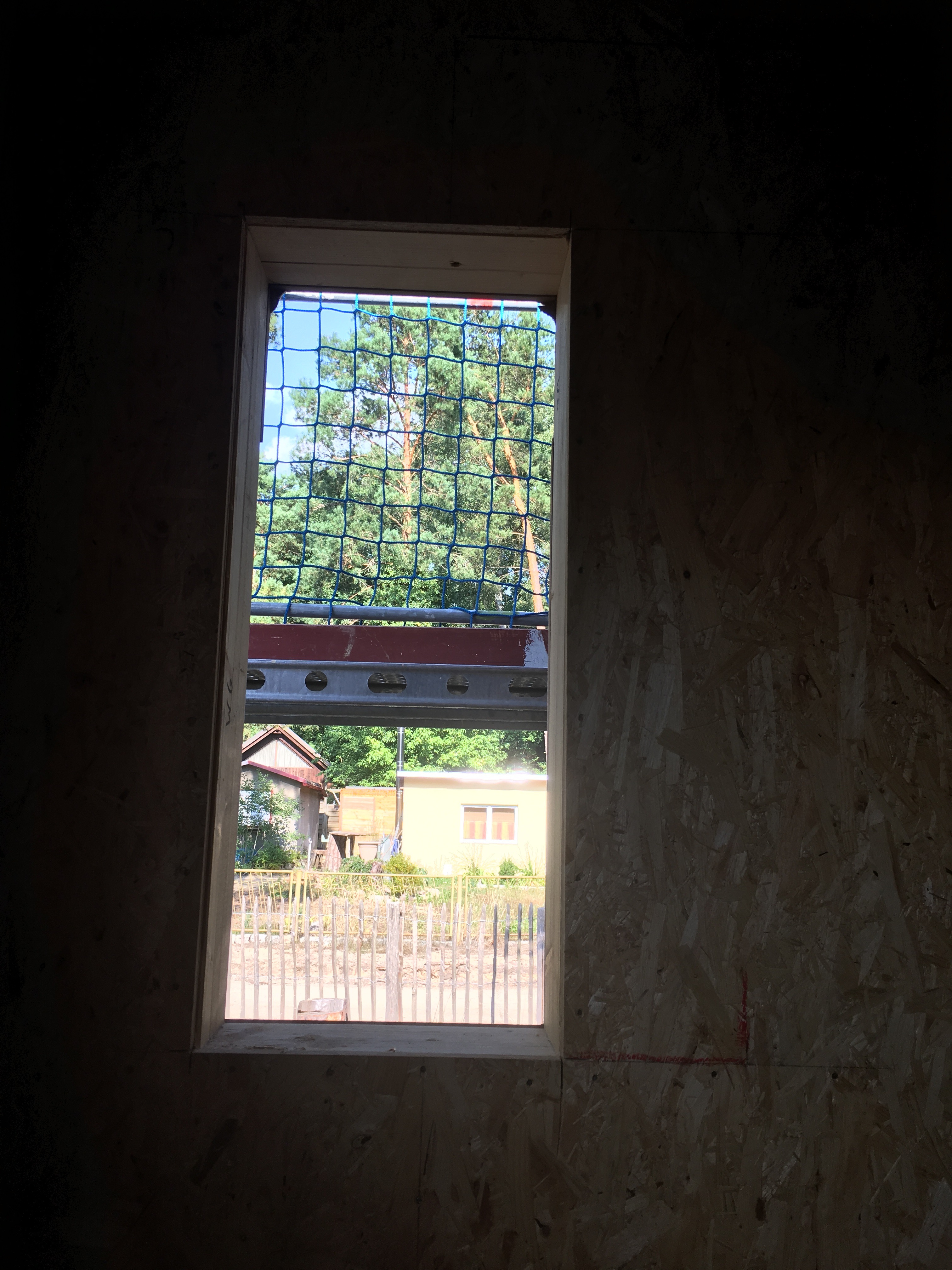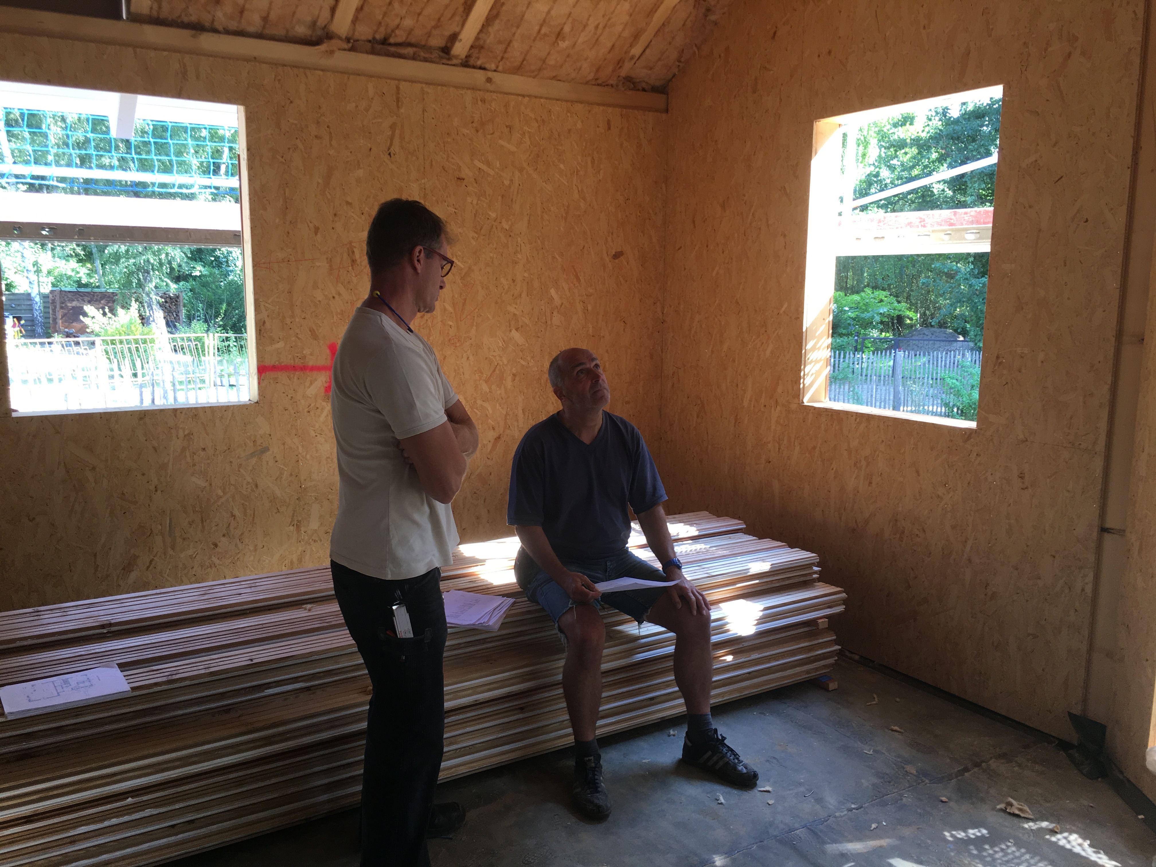 Die Heiko´s im Gespräch und beim Fachsimpeln ….Das Küchenfenster hinter den Herren muss nach rechts …siehe Pfeil. Das Fenster vor der Stütze entfällt und das schmale Fenster im Bad wird nun größer …habe das neue Mass von 50 x 83 dummer Weise im Holzbau-Plan bei 30 x 83 belassen…nun ja …es gibt Schlimmeres.