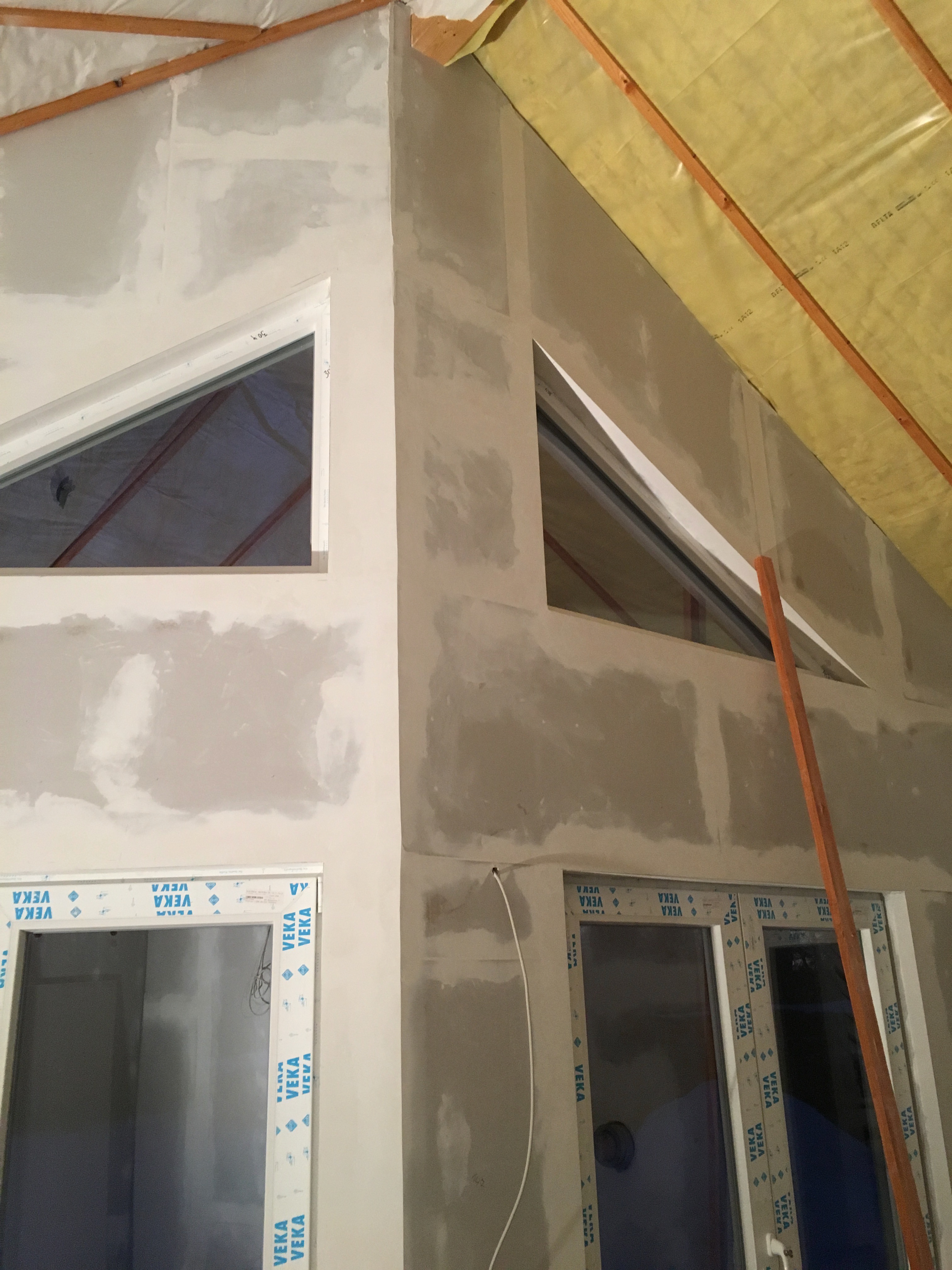 Heute wurden die Trockenbauarbeiten fast vollständig abgeschlossen….es gibt noch ein Thema mit der Wand zwischen den großen Glastüren Richtung Süden…die Kante ist eher suboptimal….angeblich gibt es nur 90 bzw. 135 ° Eckschutzleisten …ne ne ne …hab im Internet geschaut und da gibt es sogar Eckschutzleisten für Rundbögen im Trockenbau 🙂  Heiko2 meinte…ja das wäre eine Option 🙂