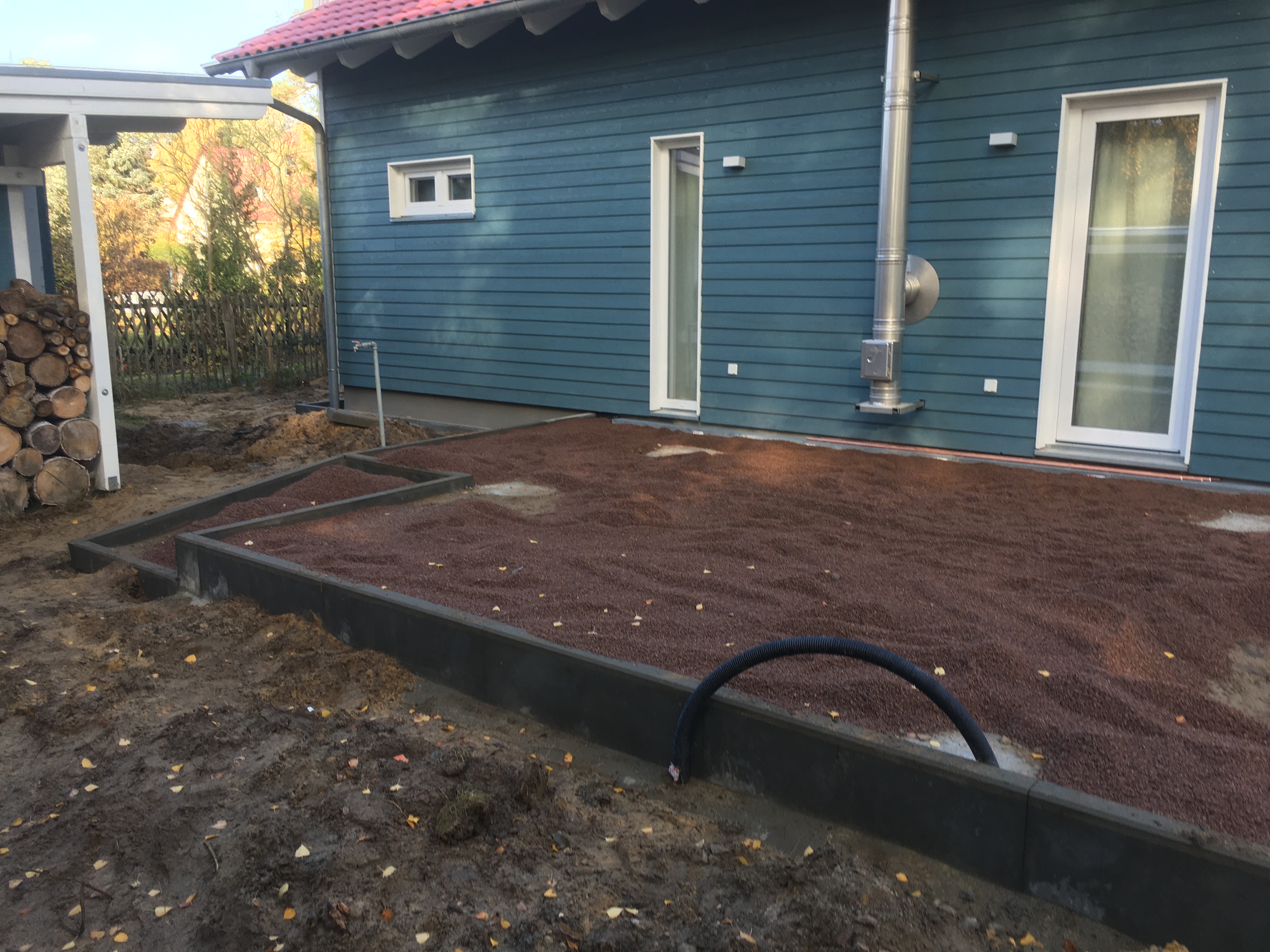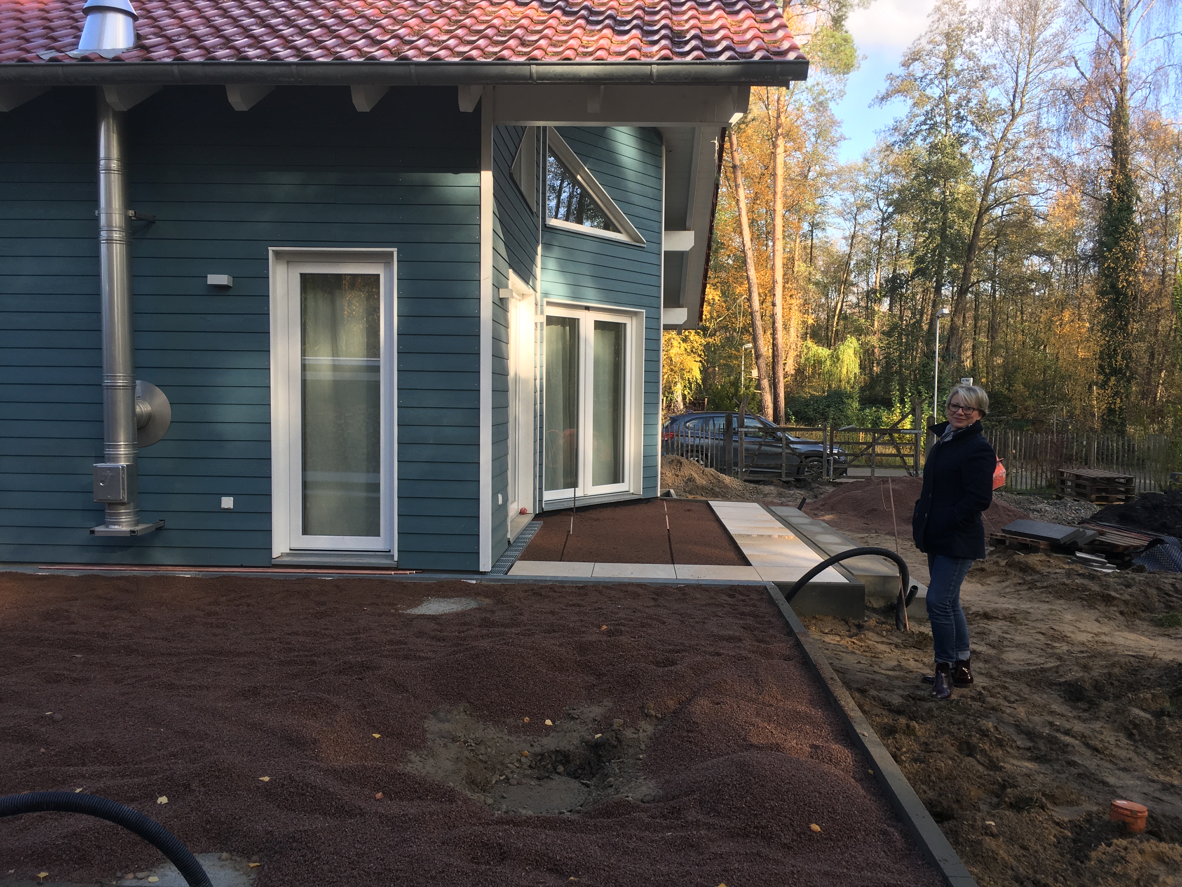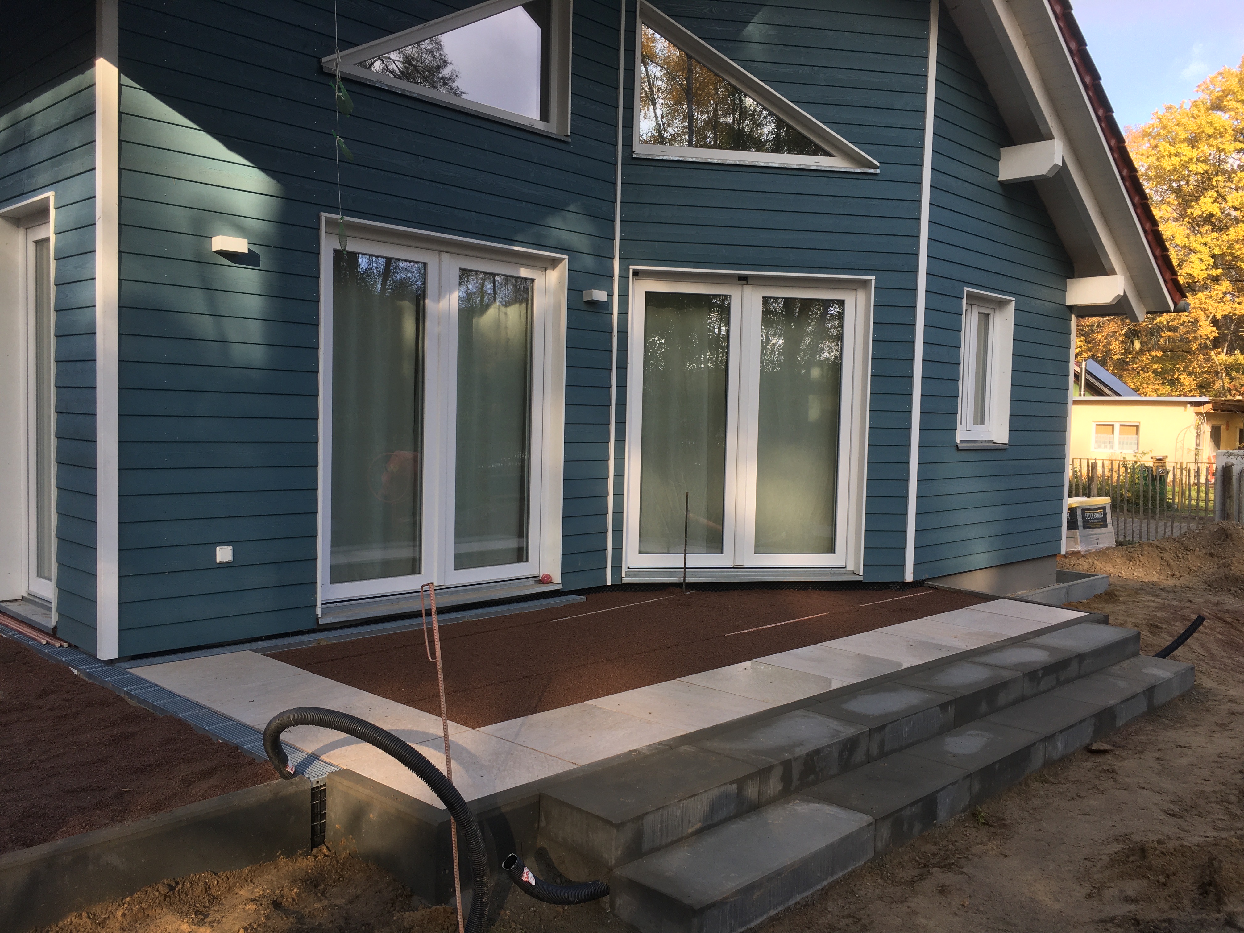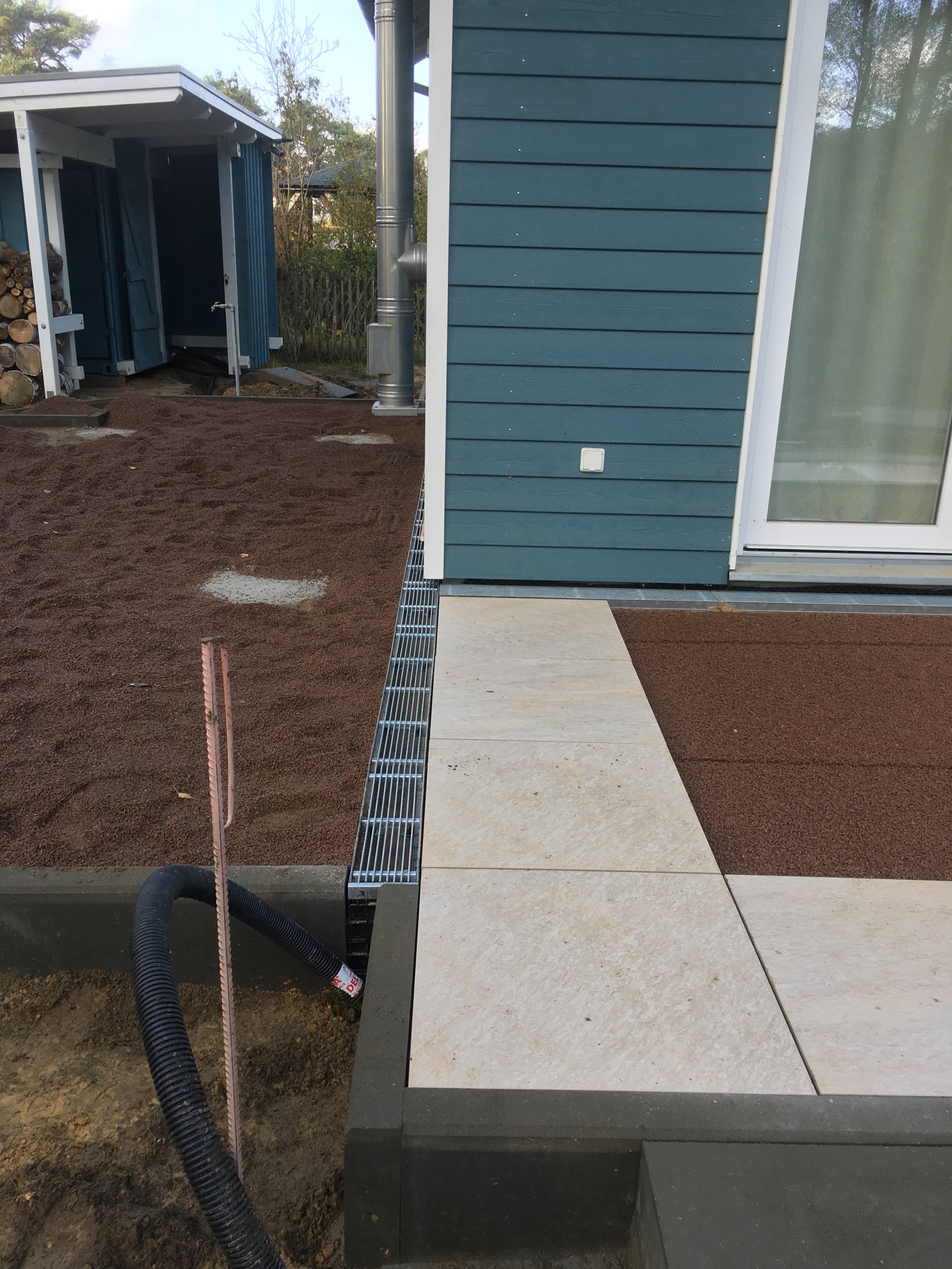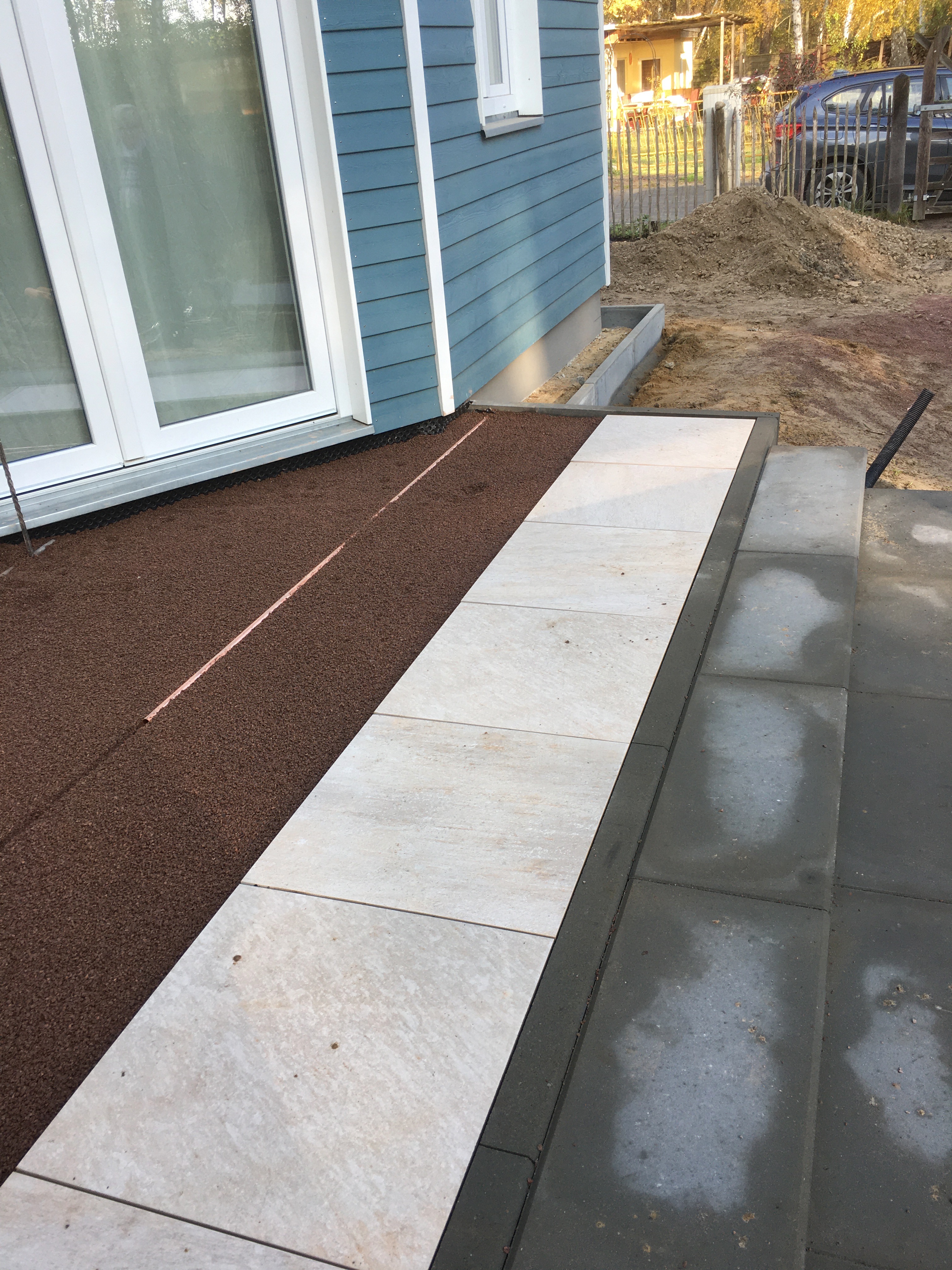 Der Hauseingang ist sehr schön geworden, doch auf der hinteren Terrasse gibt es nun doch Zwischenräume bei der Rinne am Haus und rechts am Abschluss an die Stellkanten. Hätte nicht sein müssen, wenn die Jungs richtig gemessen hätten. Nun gilt es die richtig Lösung zu finden. An der ACO-Rinne evtl. ausbetonieren und an der Stellkannte nachschneiden. Wir werden sehen.