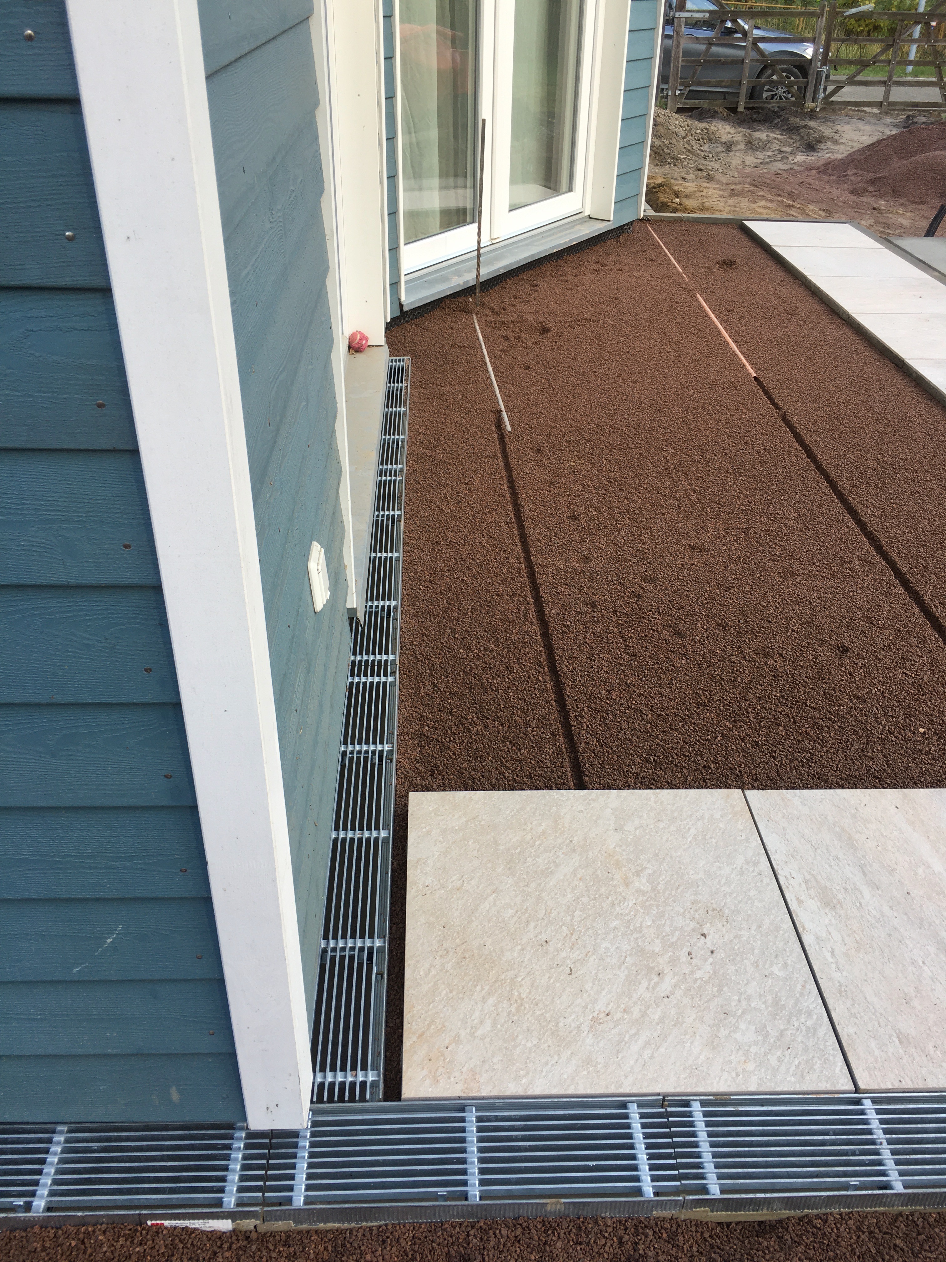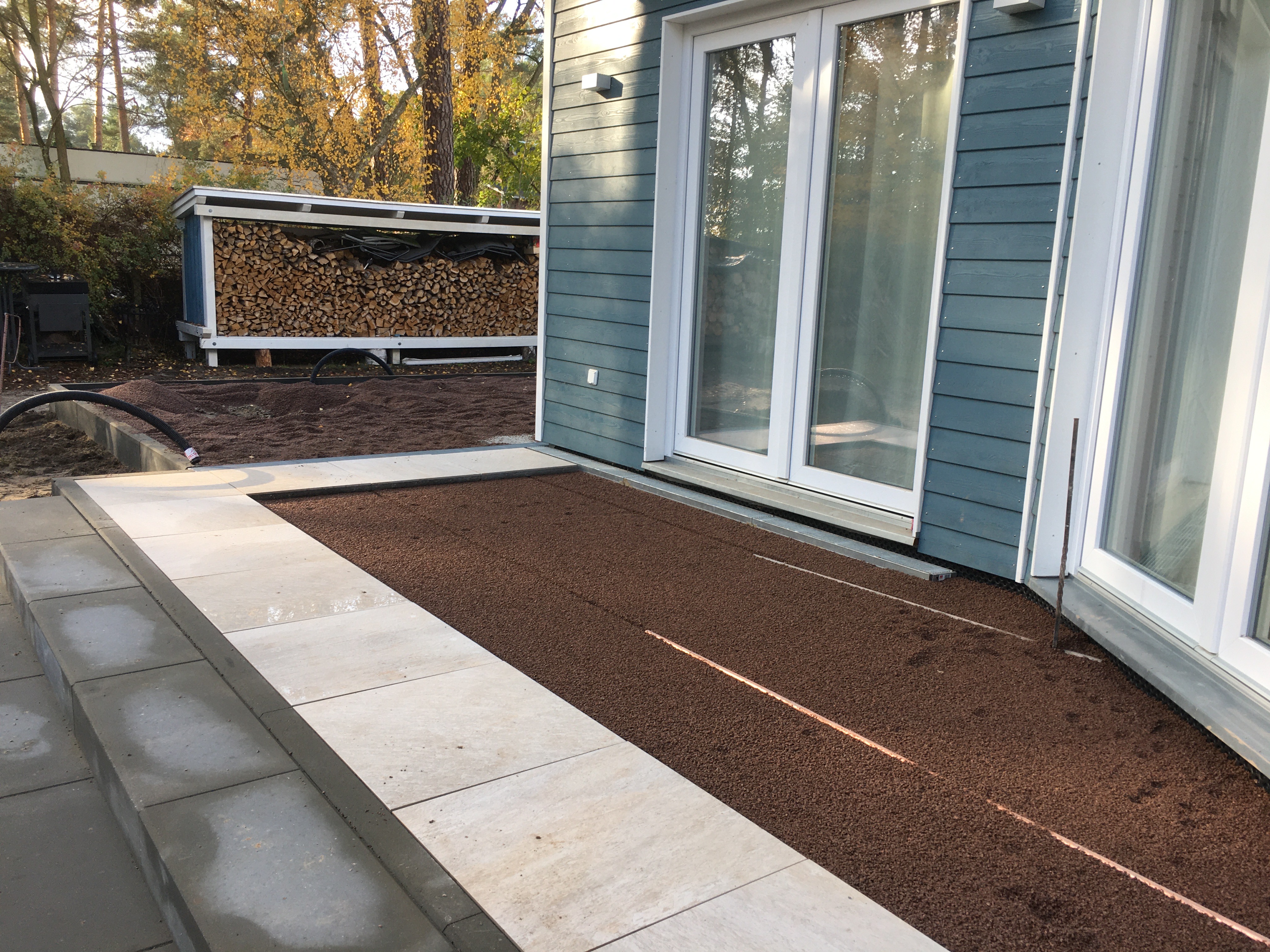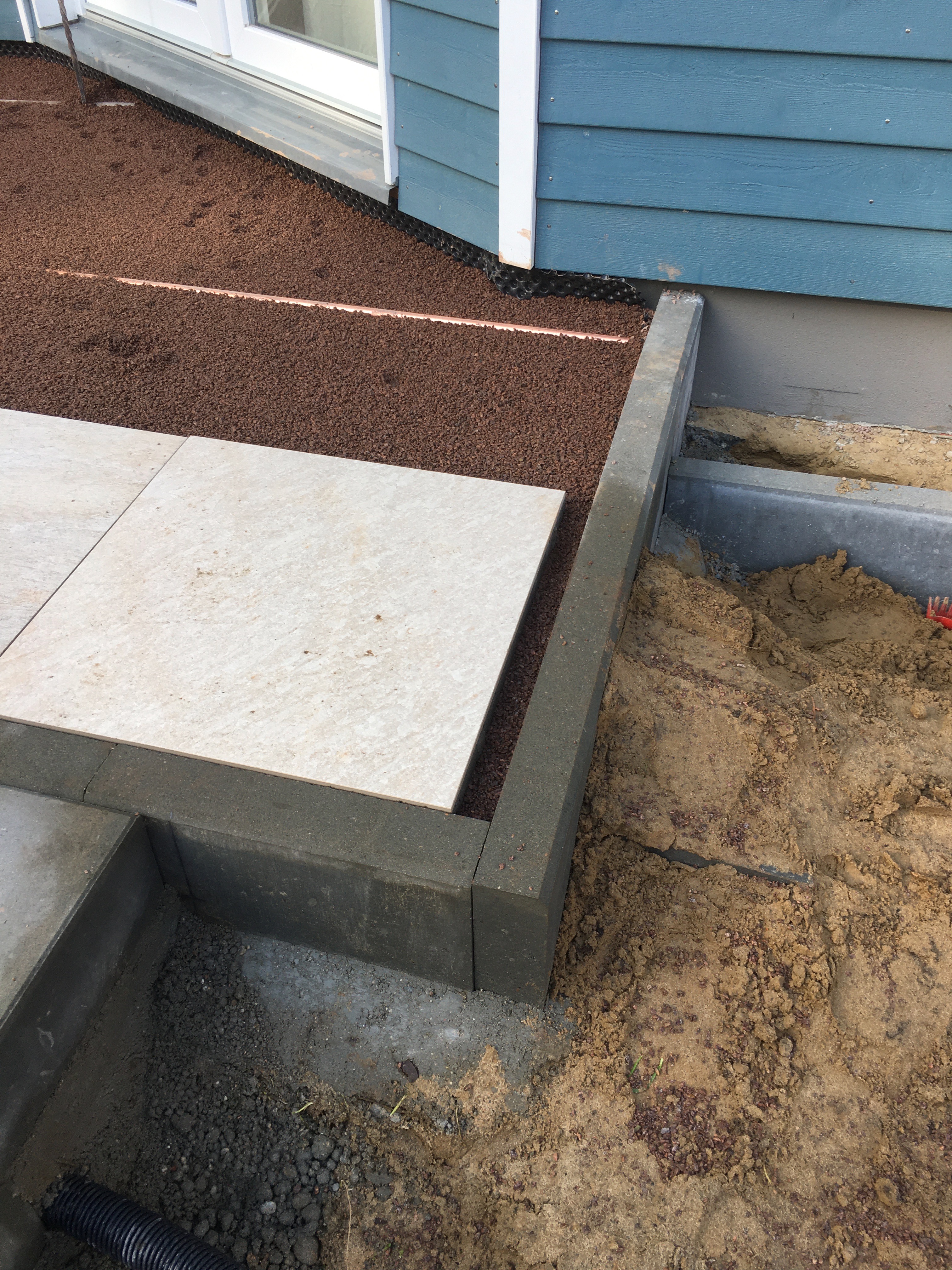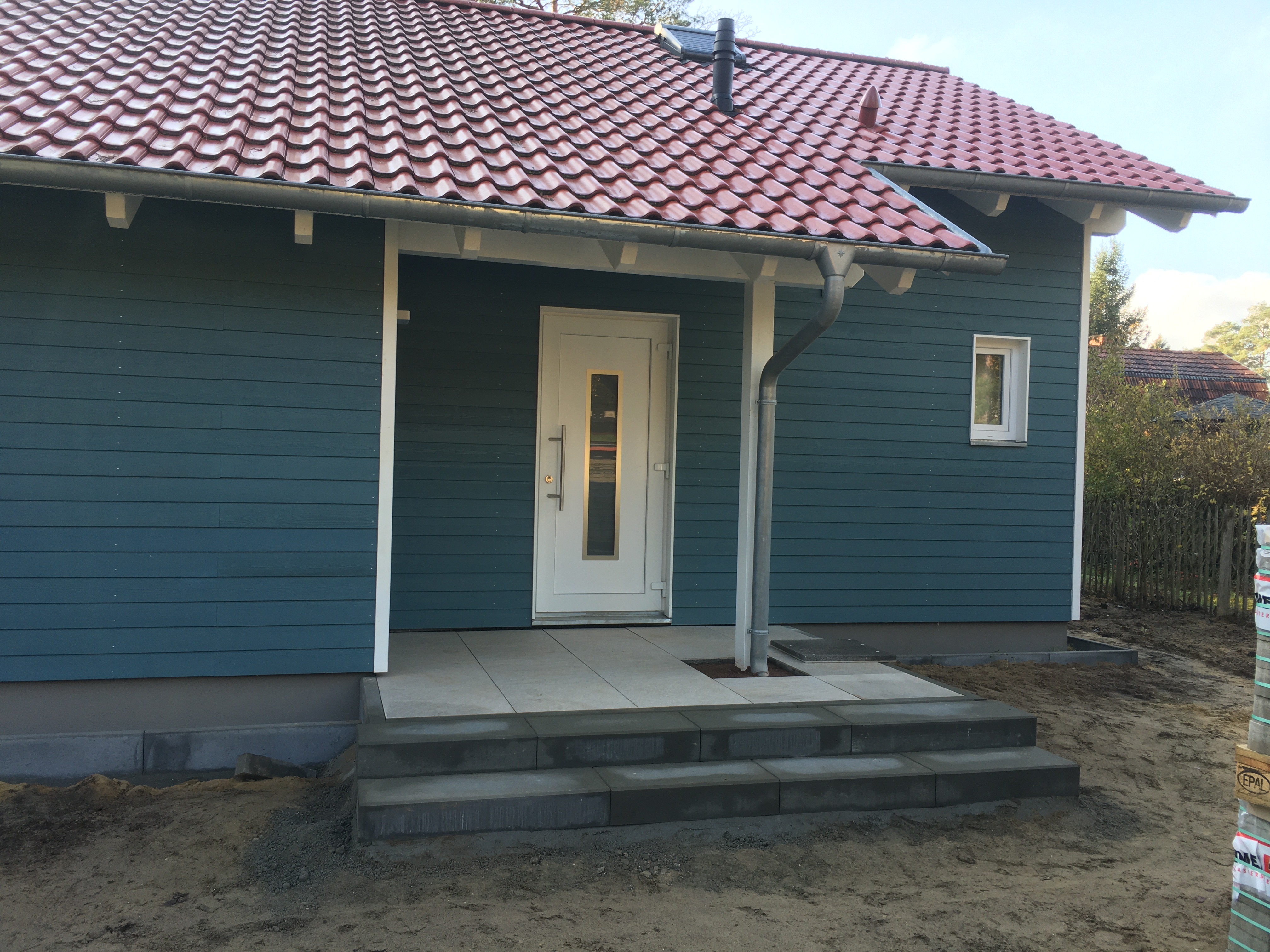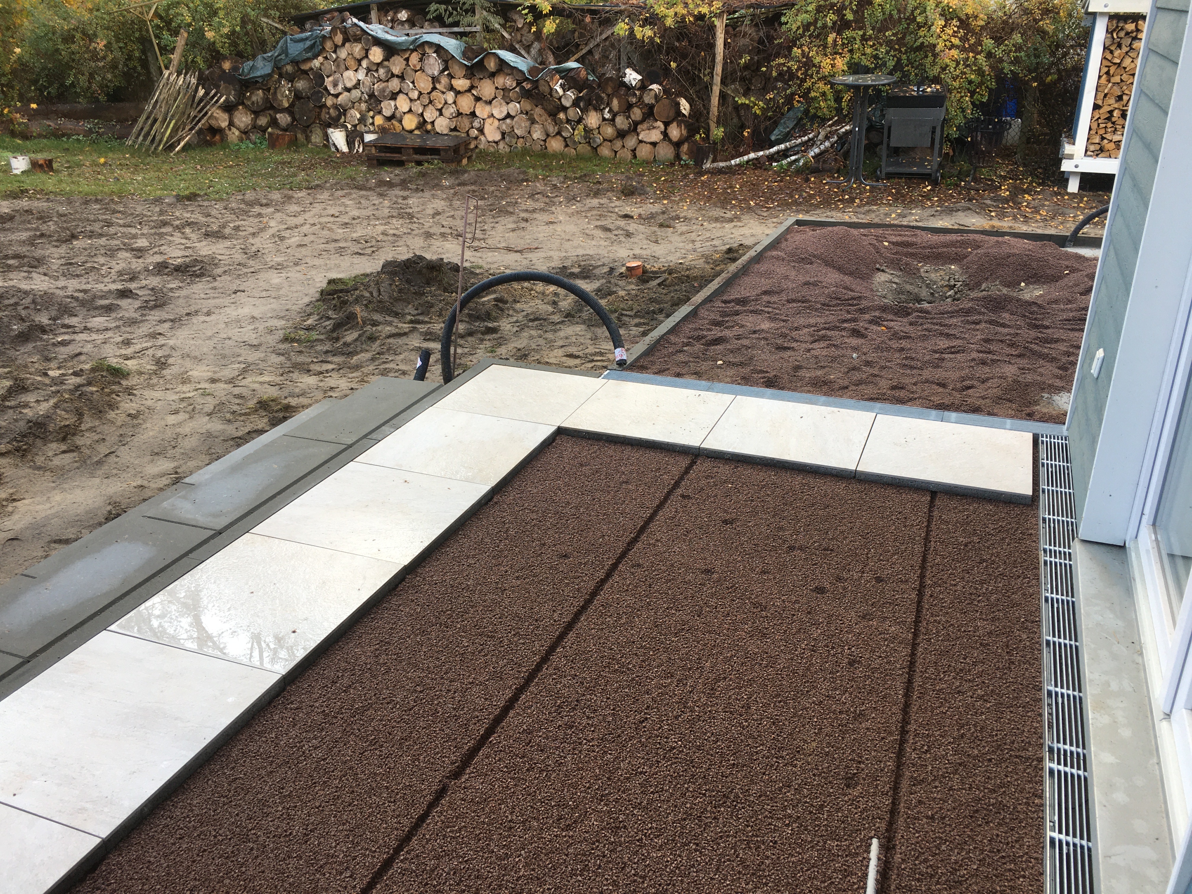 Der Hauseingang ist sehr schön geworden, doch auf der hinteren Terrasse gibt es nun doch Zwischenräume bei der Rinne am Haus und rechts am Abschluss an die Stellkanten. Hätte nicht sein müssen, wenn die Jungs richtig gemessen hätten. Nun gilt es die richtig Lösung zu finden. An der ACO-Rinne evtl. ausbetonieren und an der Stellkannte nachschneiden. Wir werden sehen.
