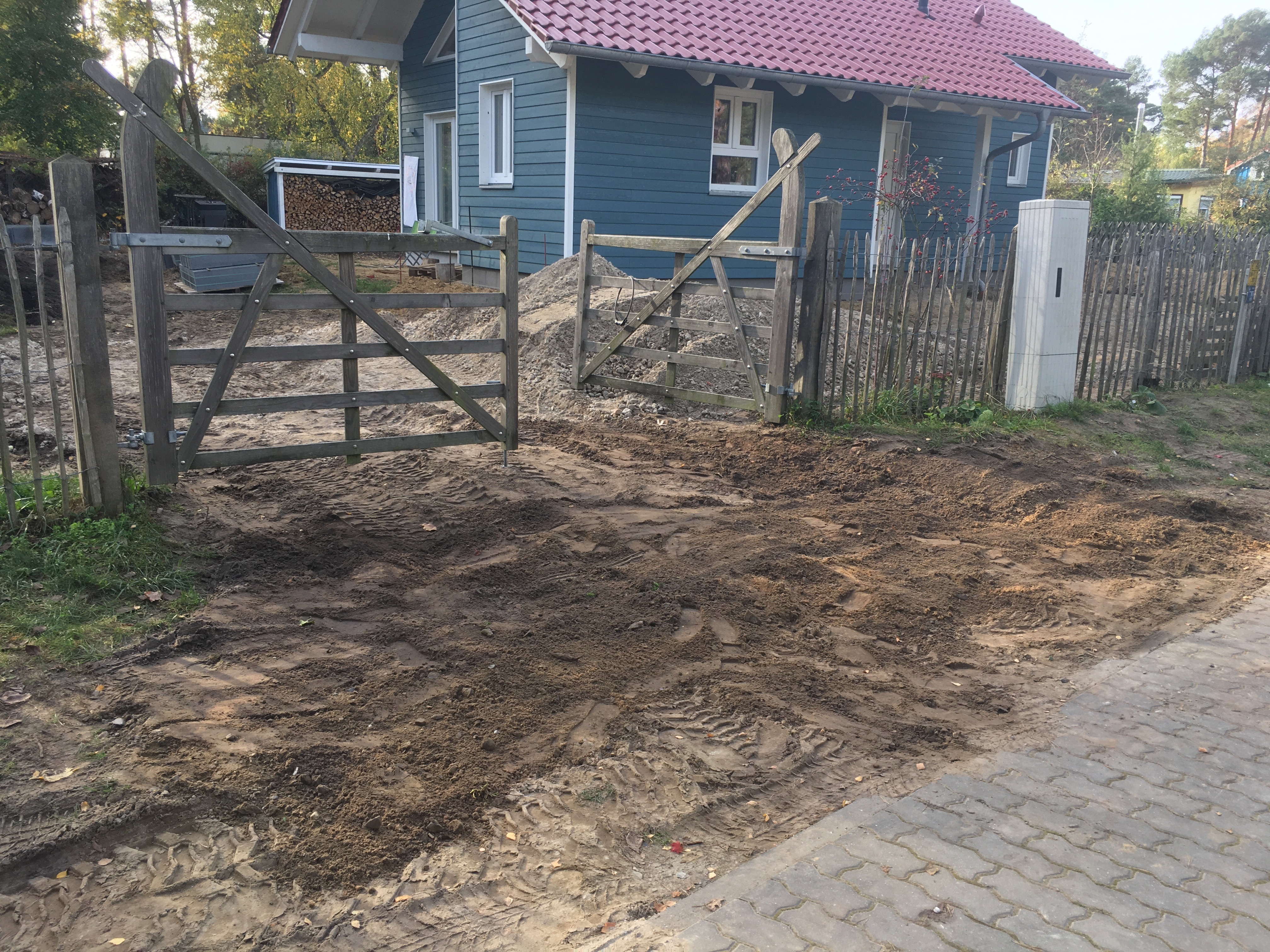 Hatte gestern ein heftiges Telefonat mit Herrn Metzendorff ….der Landschaftsbauer …nun zwischen Aussage und Wahrheit liegen halt Welten…bin heute nachmittag nochmals nach Bestensee gefahren ..nun die Zufahrt immer noch desaströs…musste das selbst Hand anlegen und nun sind wenigsten die 40er und 25er Stellplatten angeliefert worden…doch immer noch fehlt die ACO-Rinne die ja angeblich heute auch schon dasein sollte.