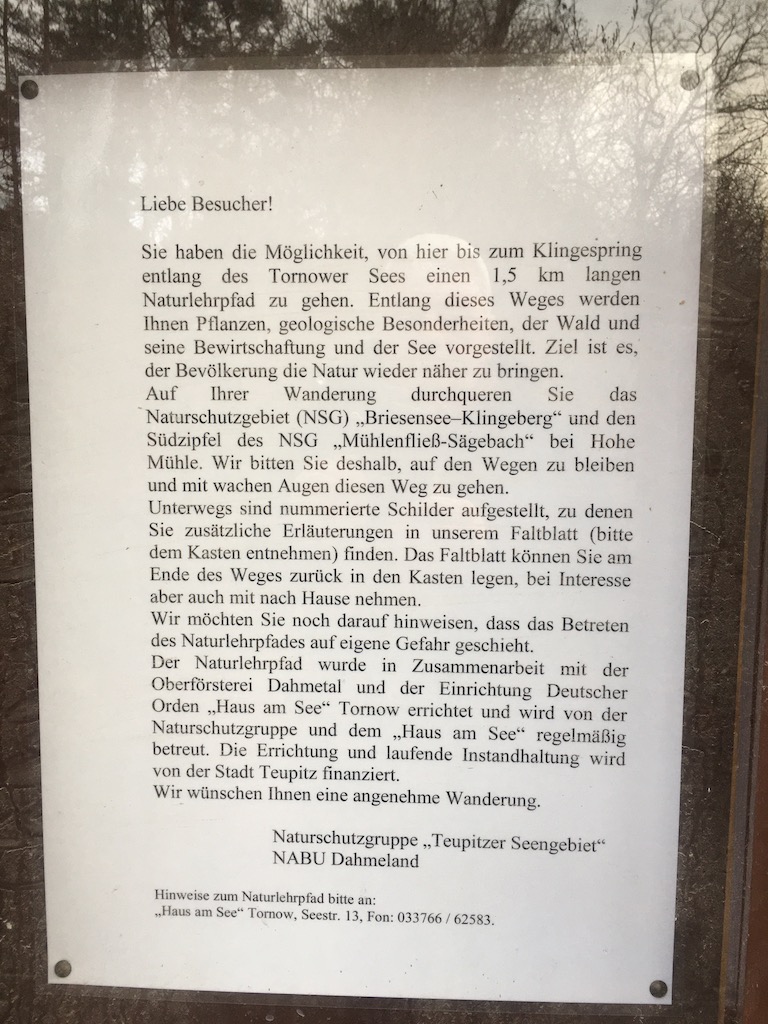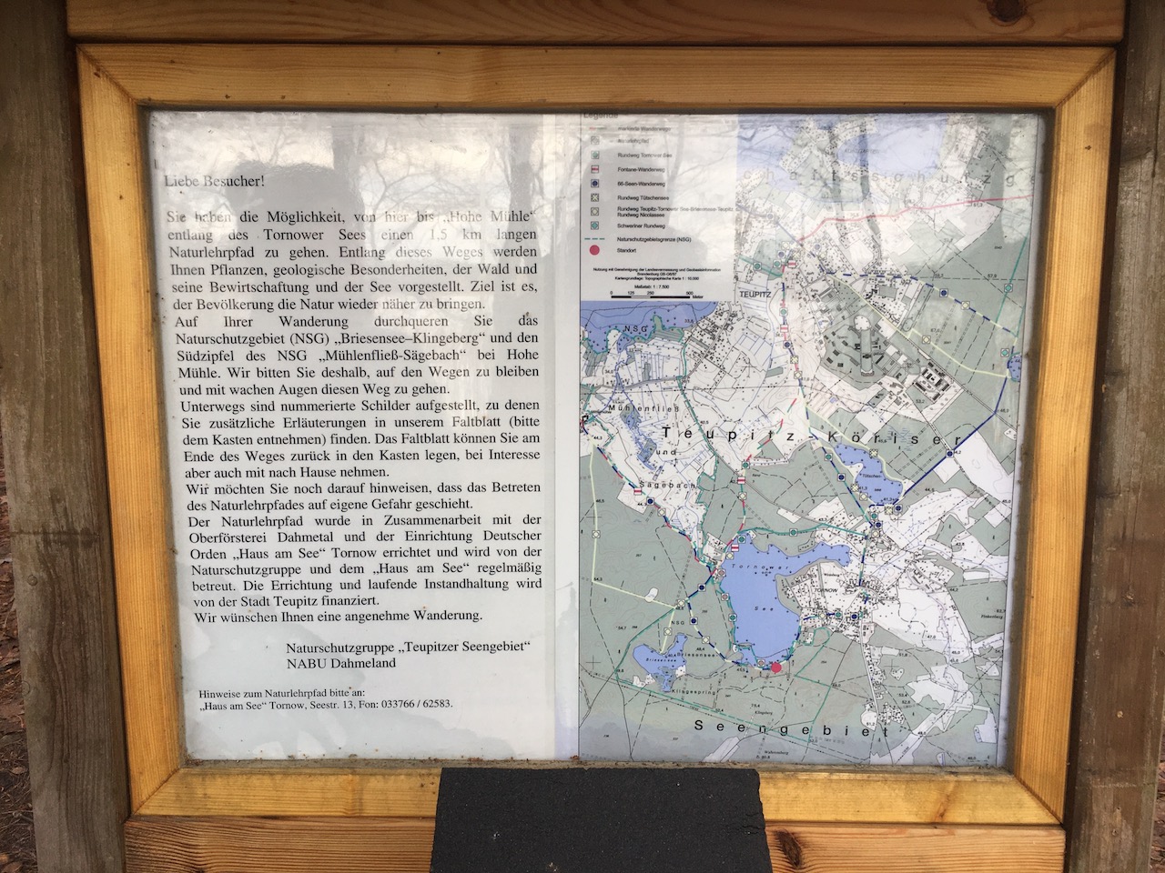 auf der Westseite vom Tornower See gab es sogar eine Waldlehrpfad und eine ehemalige Mühle mit einem Mühlbach. Dann ging es quer durch Kiefernwäldchen zurück nach Teupitz – zum Schluss lachte sogar noch die Sonne – ein toller Ausflug.