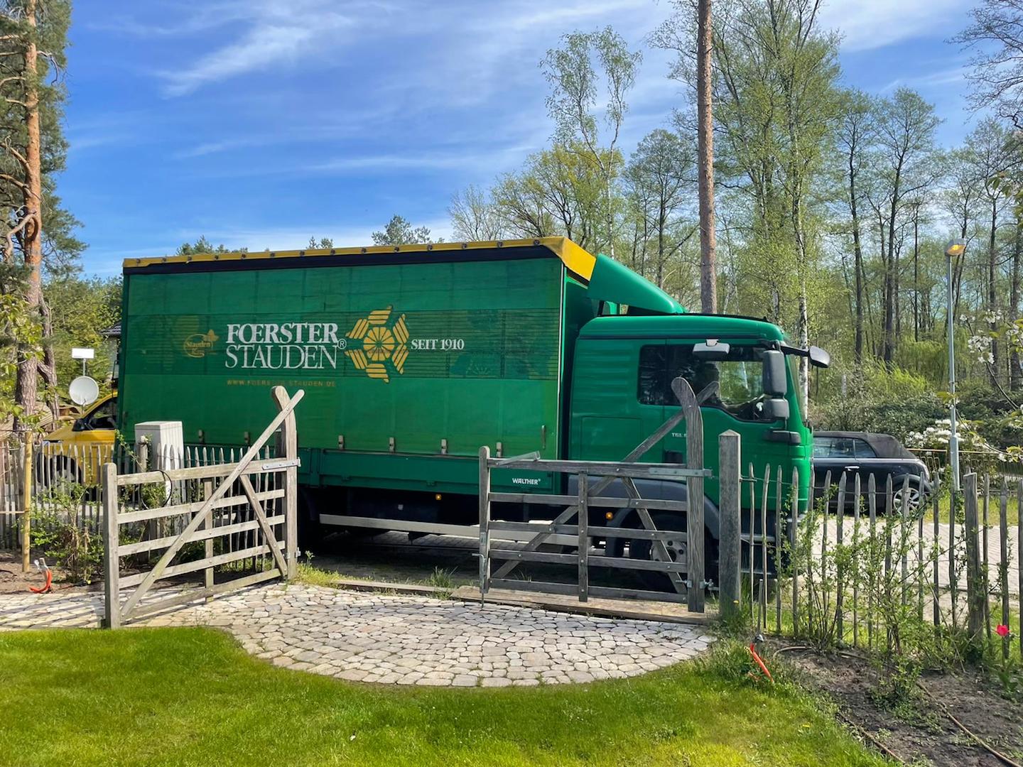 Nun es hieß Sie fahren um 8:00 Uhr los…das war die Aussage der Disponentin… also dachten wir, Sie sind so um 9:00 Uhr bei uns – Wir waren so gespannt es wurde 10:00 Uhr. Der Fahrer war supercool…meinte…Ihre Gärtner sind ja wohl noch nicht da ? – Ich sagte doch …die stehen vor Ihnen :-)…Er meinte, na die nächste Lieferung geht zum Bundespräsidenten …ich Dachte so …na der hat bestimmt seine Gärtner. Es waren insgesamt 3 Paletten mit 40 Kisten …total Irre. Na das kann lustig werden. Die Vorbeigehenden meinte schon…ob wir eine Gärtnerei aufmachen wollen ?
