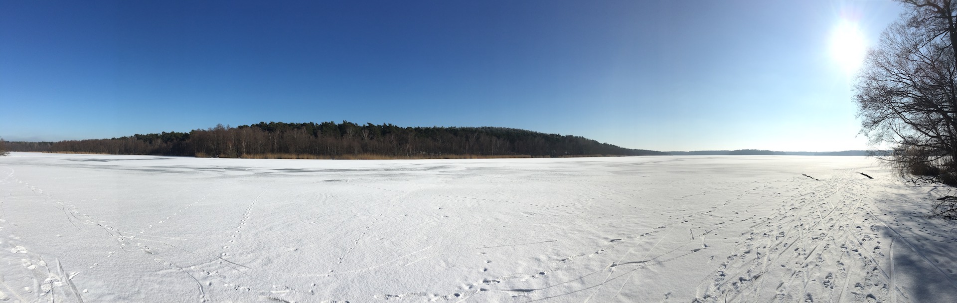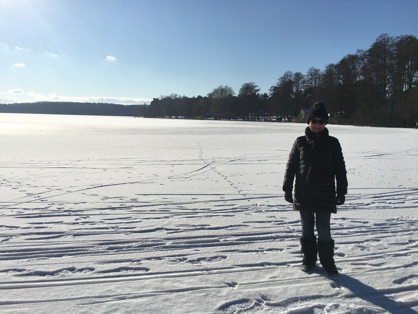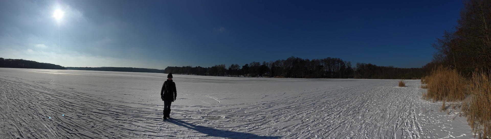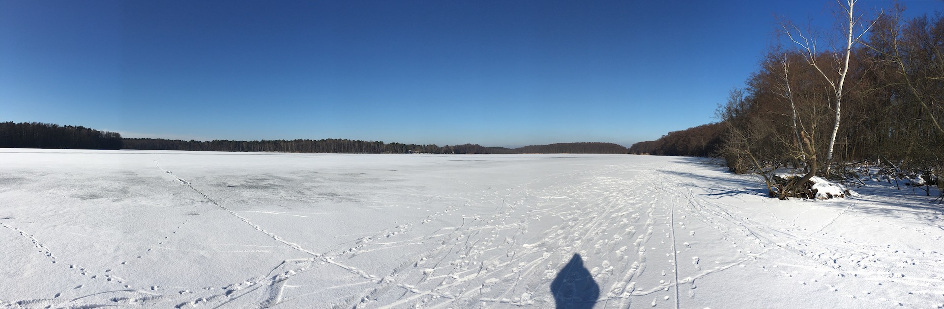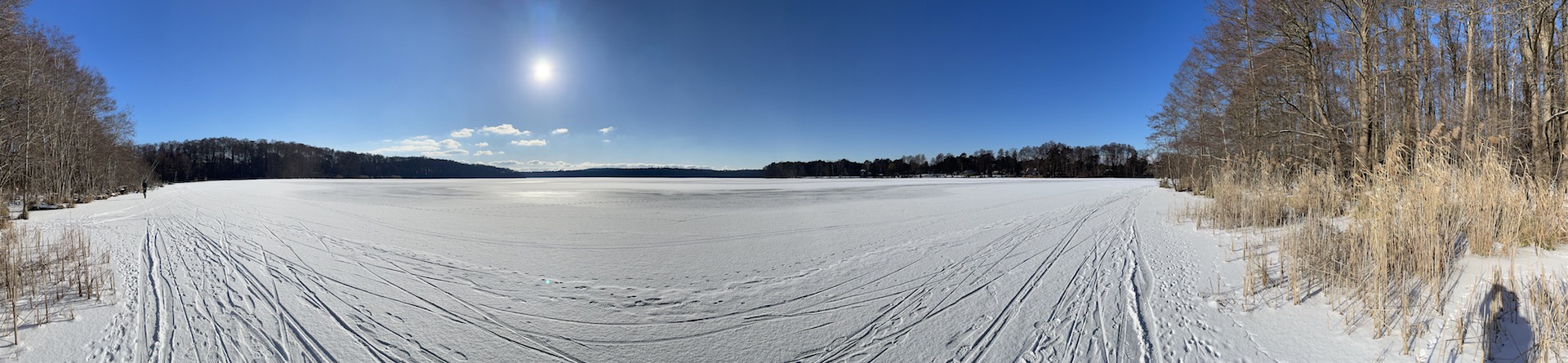 Am Samstag hatten wir den Mut das erste Mal aufs Eis zu gehen. Der See lag mit einem dünnen weißen Mantel vor uns. Wir sind über unseren Steg bis zum Durchlass an der Insel gelaufen. Genau am Durchlass hatte es dann zu Knacken angefangen – Antje meinte wegen meiner Schwerhörigkeit würde ich das bestimmt nicht gehört haben – doch sehr wohl :-). Wir waren ja nur wenige Meter weg vom Ufer sind dann jedoch besser wieder zurück und entlang der Promenade am Vereinsgebäude entlang. Da waren wir nicht Alleine, sonder viele Familien mit Ihren Kindern auf dem Eis.