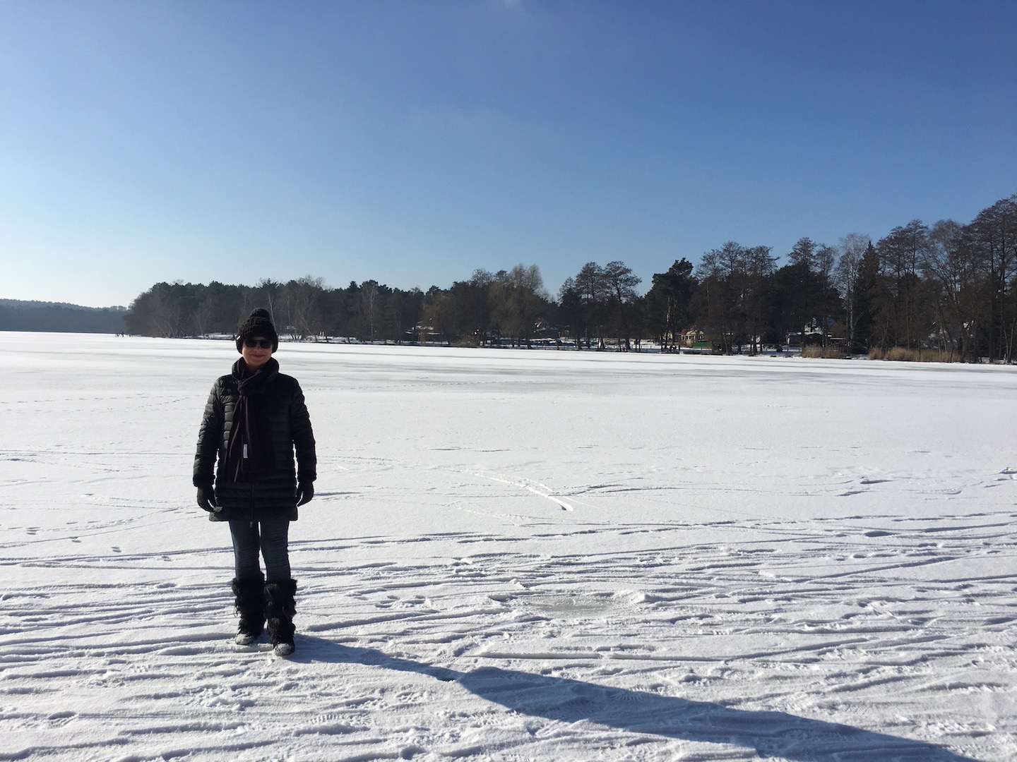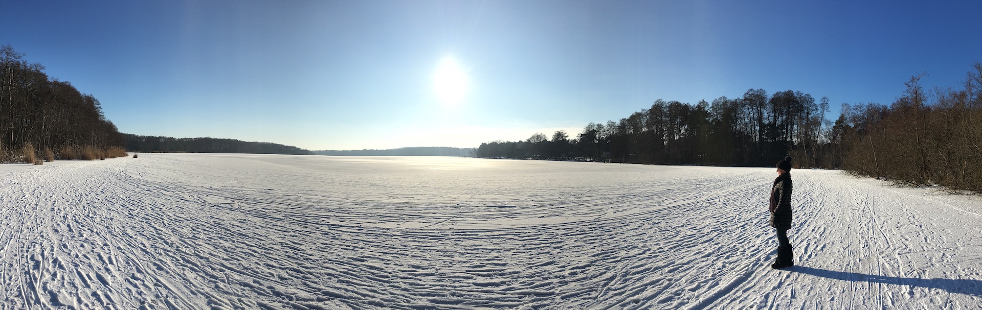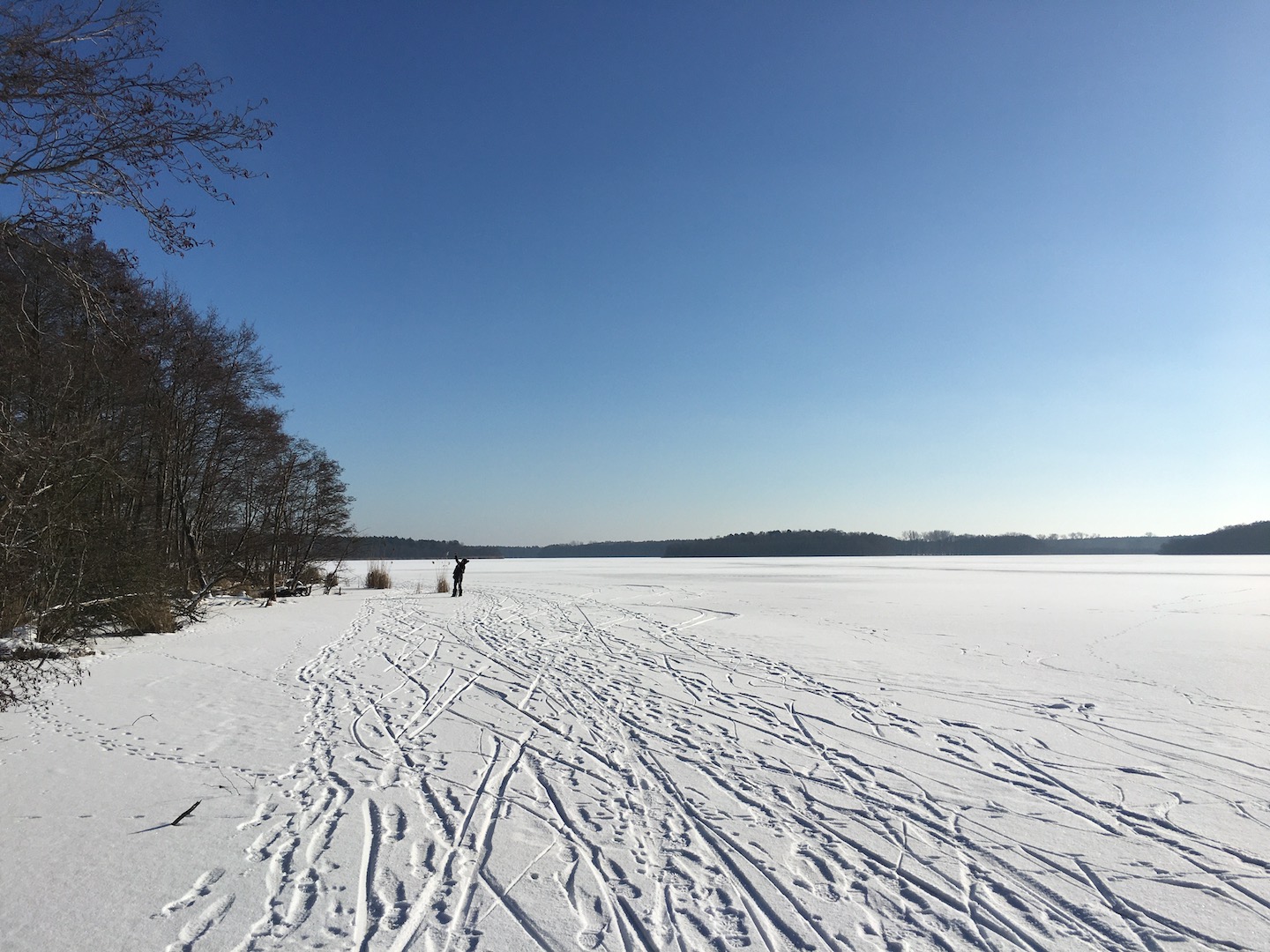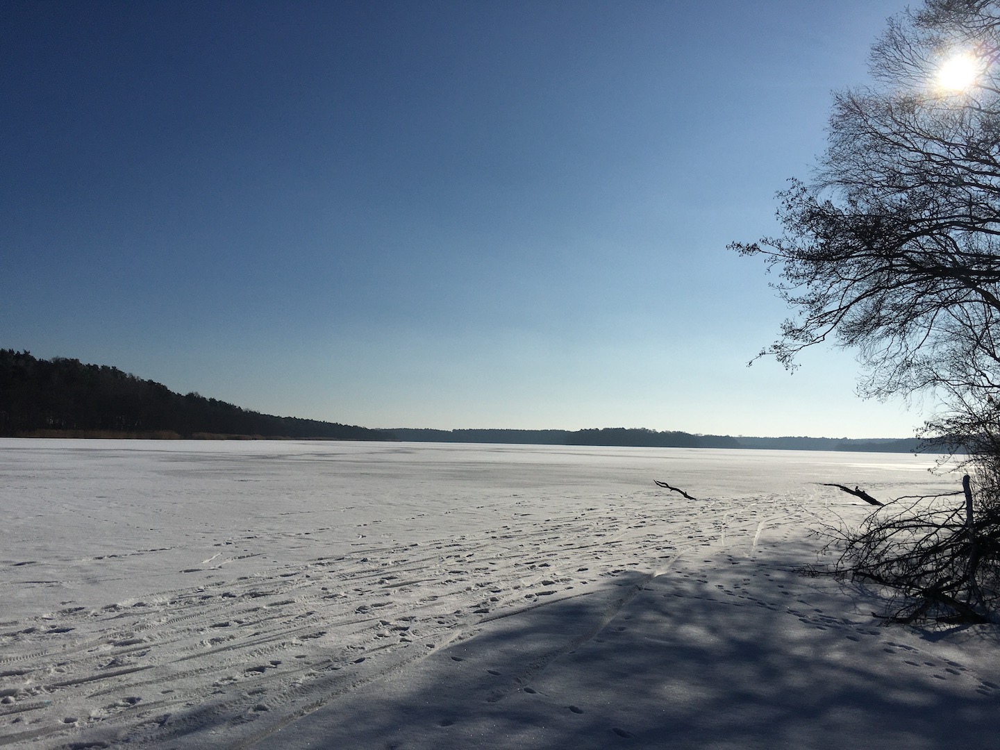 Am Samstag hatten wir den Mut das erste Mal aufs Eis zu gehen. Der See lag mit einem dünnen weißen Mantel vor uns. Wir sind über unseren Steg bis zum Durchlass an der Insel gelaufen. Genau am Durchlass hatte es dann zu Knacken angefangen – Antje meinte wegen meiner Schwerhörigkeit würde ich das bestimmt nicht gehört haben – doch sehr wohl :-). Wir waren ja nur wenige Meter weg vom Ufer sind dann jedoch besser wieder zurück und entlang der Promenade am Vereinsgebäude entlang. Da waren wir nicht Alleine, sonder viele Familien mit Ihren Kindern auf dem Eis.