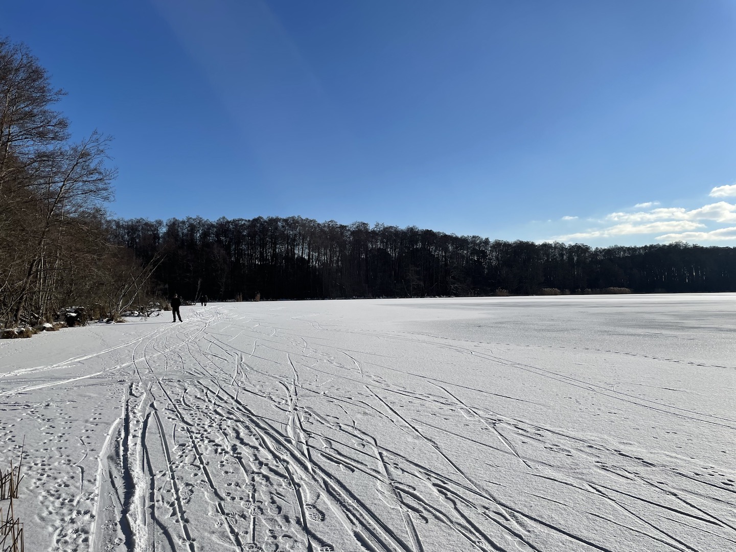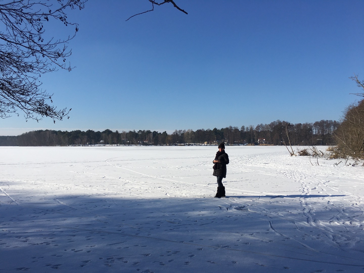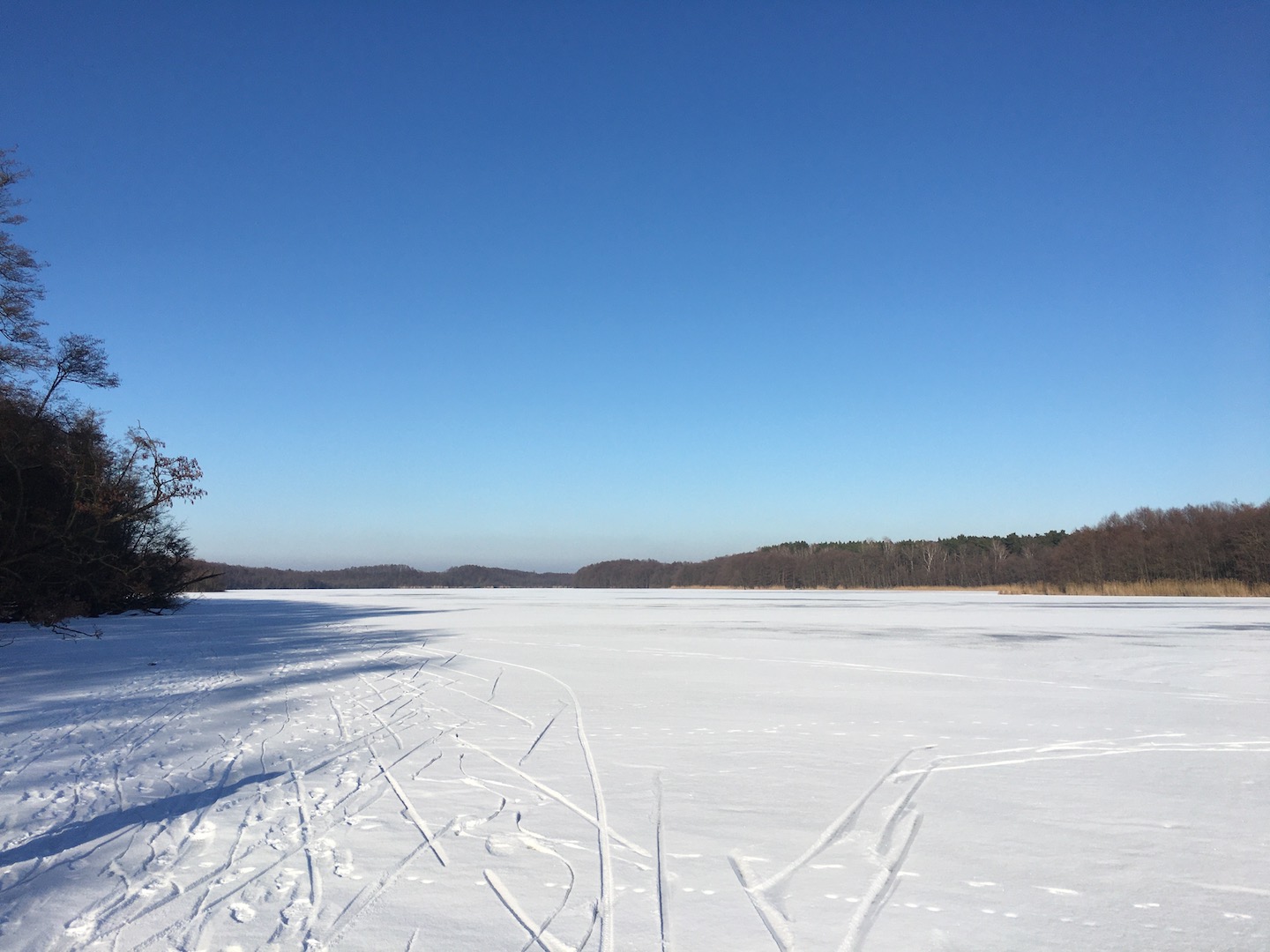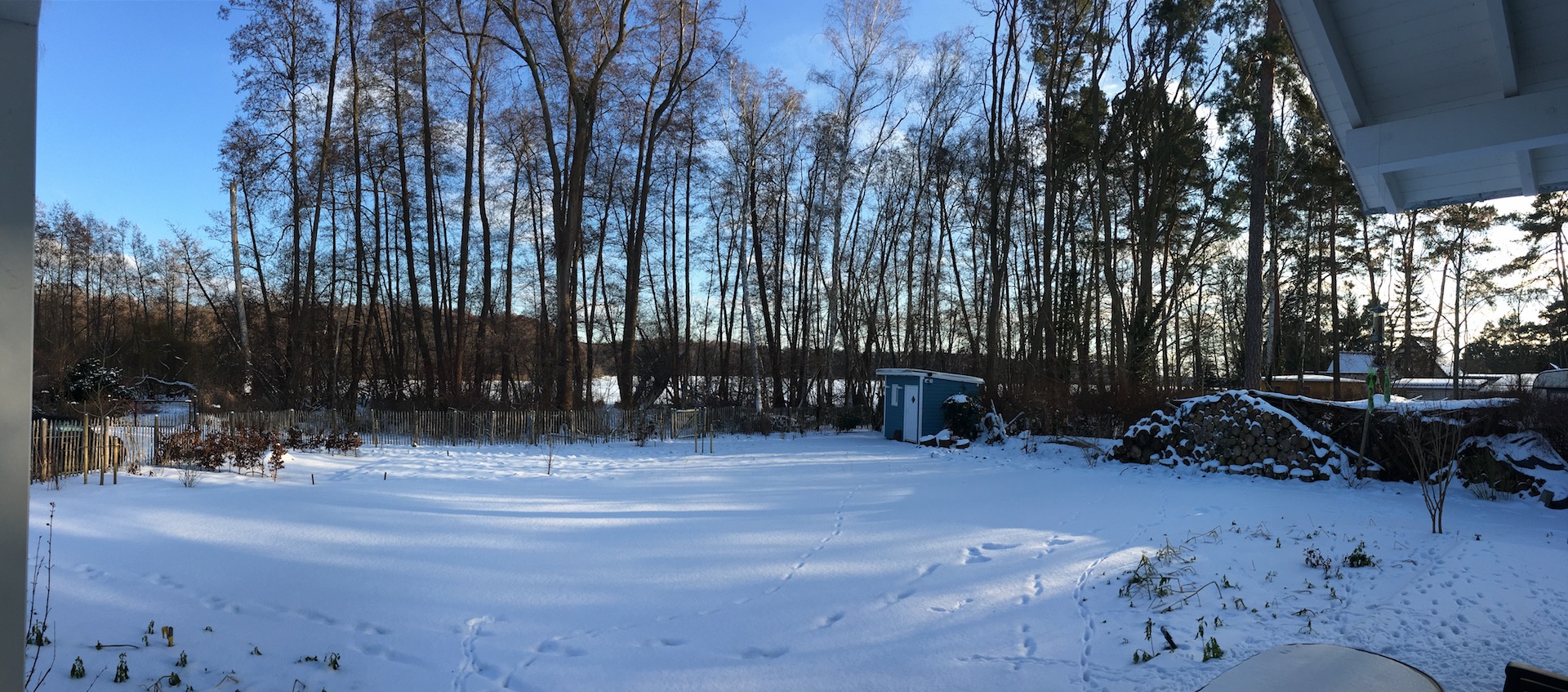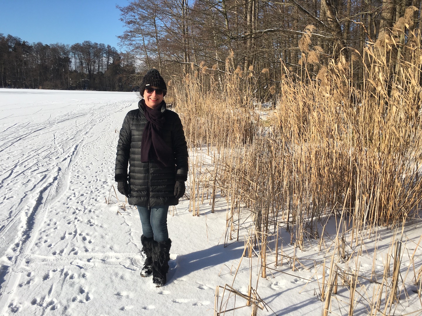 Am Samstag hatten wir den Mut das erste Mal aufs Eis zu gehen. Der See lag mit einem dünnen weißen Mantel vor uns. Wir sind über unseren Steg bis zum Durchlass an der Insel gelaufen. Genau am Durchlass hatte es dann zu Knacken angefangen – Antje meinte wegen meiner Schwerhörigkeit würde ich das bestimmt nicht gehört haben – doch sehr wohl :-). Wir waren ja nur wenige Meter weg vom Ufer sind dann jedoch besser wieder zurück und entlang der Promenade am Vereinsgebäude entlang. Da waren wir nicht Alleine, sonder viele Familien mit Ihren Kindern auf dem Eis.