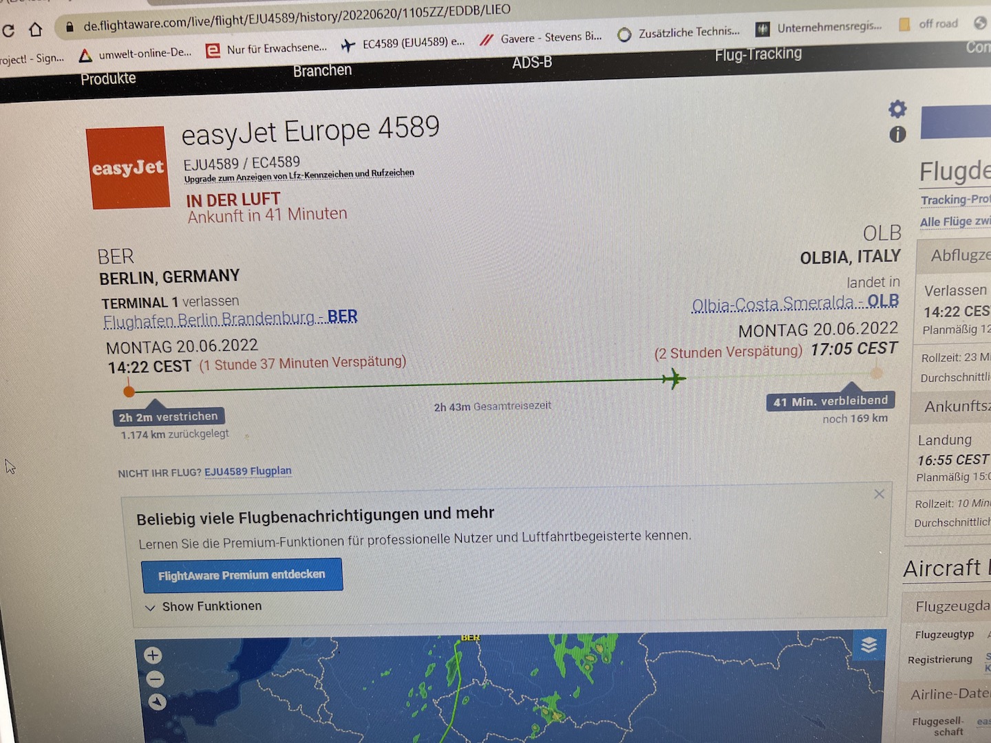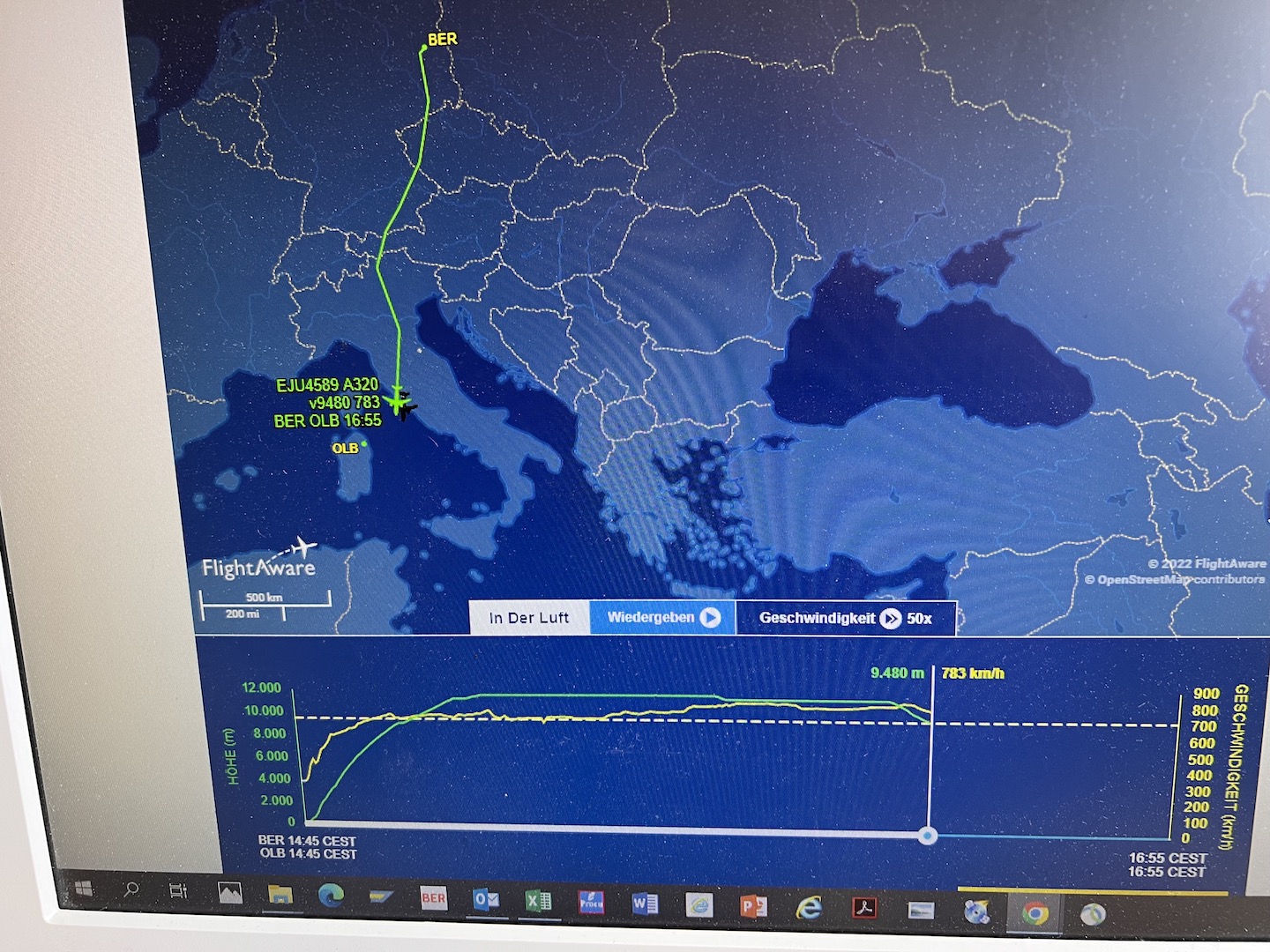 Am Montag ging es nach Sardinien vom BER – hab da mal den Flug verfolgt – leider wie gesagt mit heftiger Verspätung, doch überhaupt !