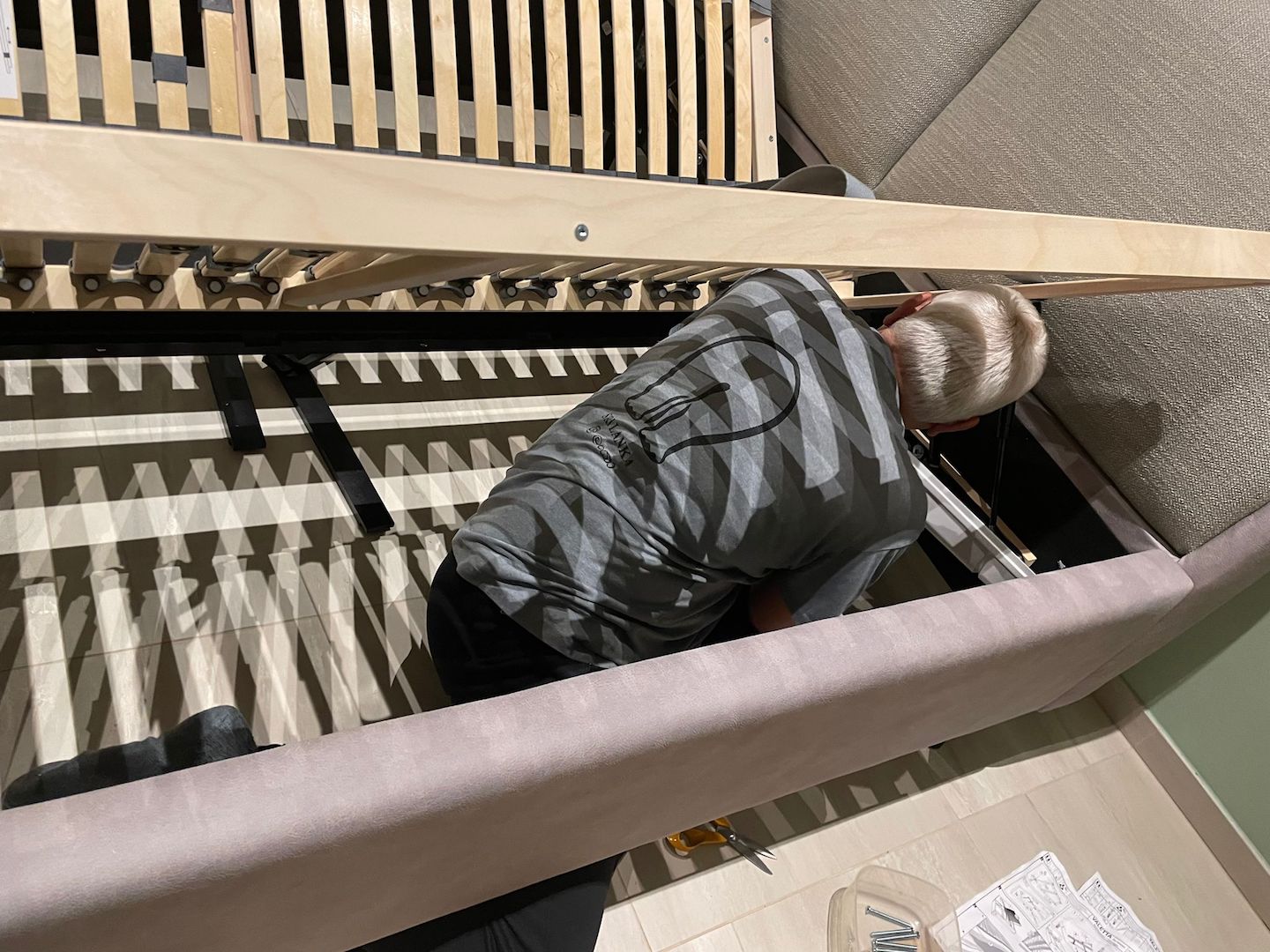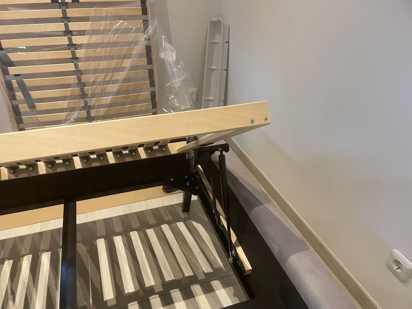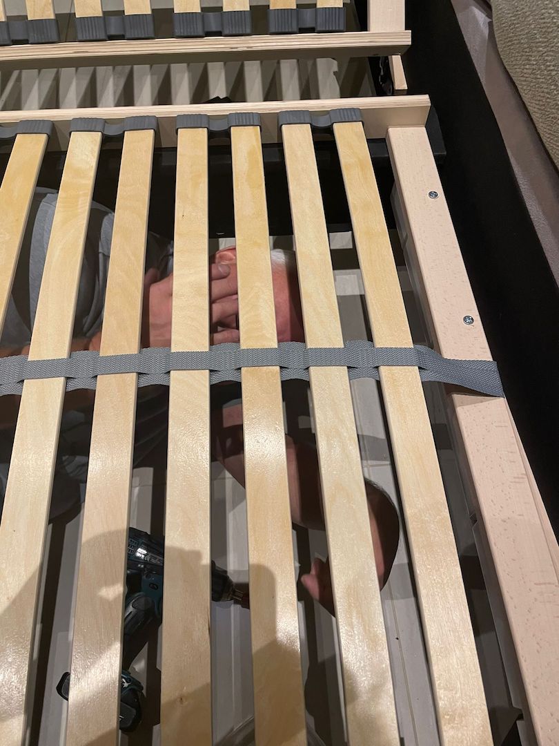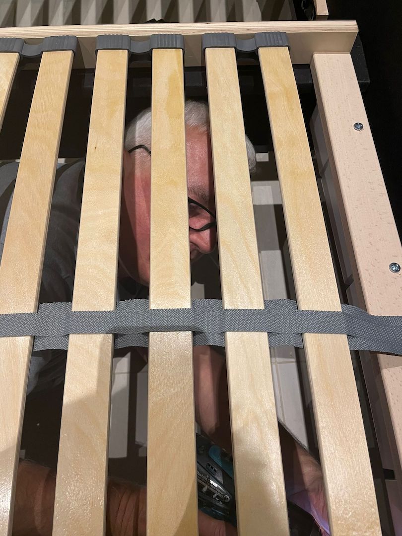 Samstag…lag so im Bett und dachte…der Mist im Wohnzimmer muss weg…Also raus aus den alten Federn…das alte Bett demontiert 🙁 was für eine Plackerei…wusste ja noch nichts vom Neuen…alles geschafft…Antje hat die Reste unterm Bett beseitigt…ein ganz schön dolles Flusenmeer schafft so ein Boxspringbett mit kaum Abstand zum Boden..Antje war Tapfer und alles sauber..nun gings los..zuerst der Rahmen .. war OK..auch alle Schrauben waren da :-)…die Härte warwn die hydraulischen Heber der Roste 3x Angebaut dann war alles richtig :-)… der Schutz der Teile …war der Hammer Plastikschalen nur Anzuschrauben als Fakier mit Jogalizenz…seht sebst