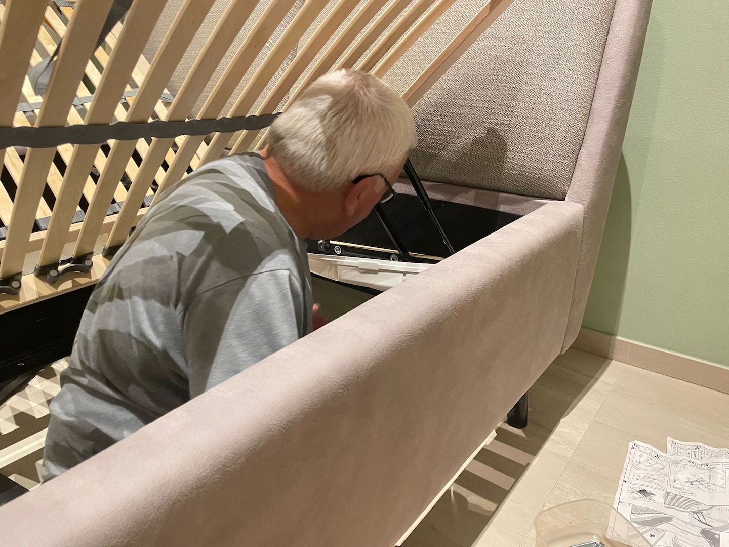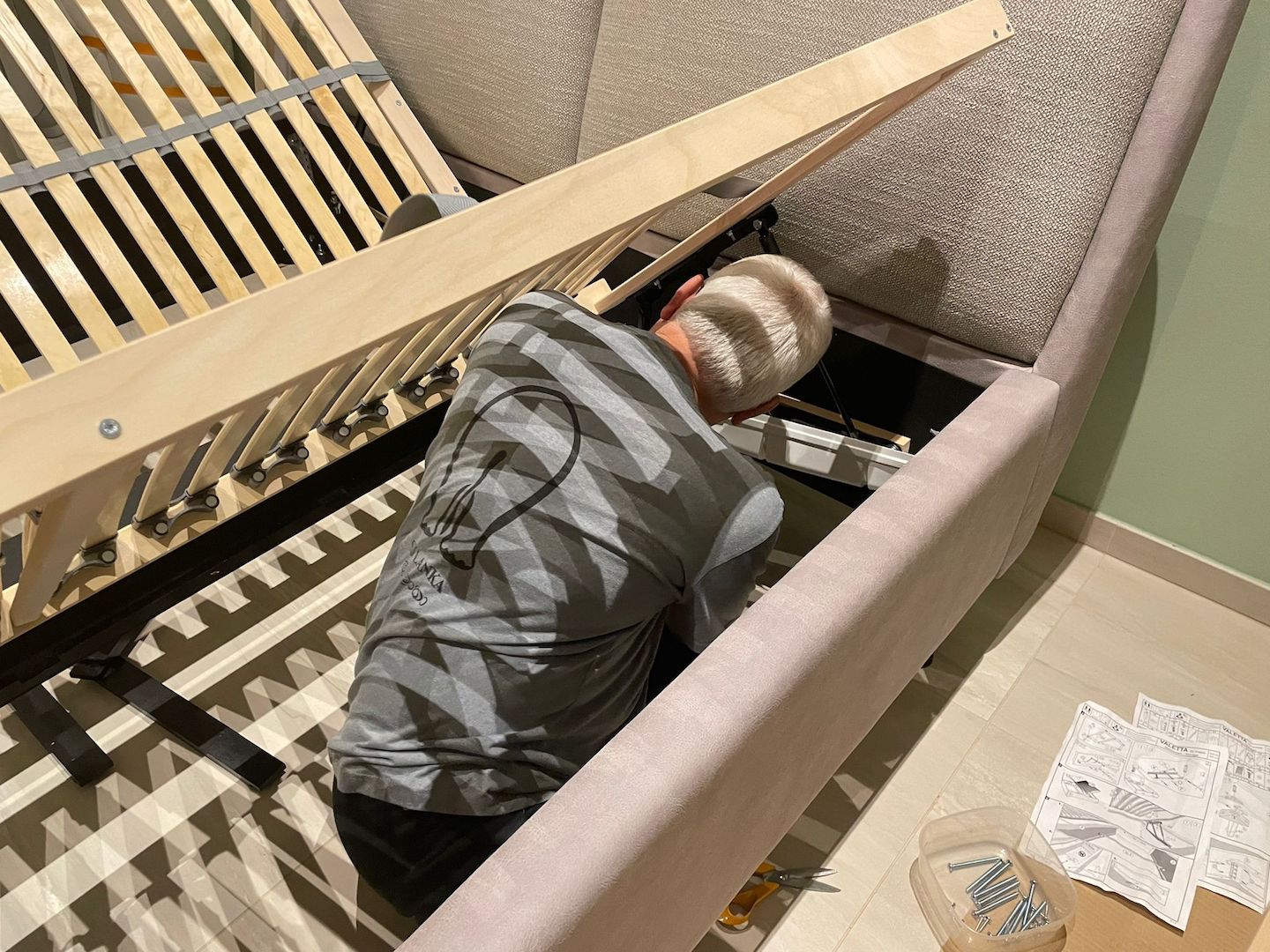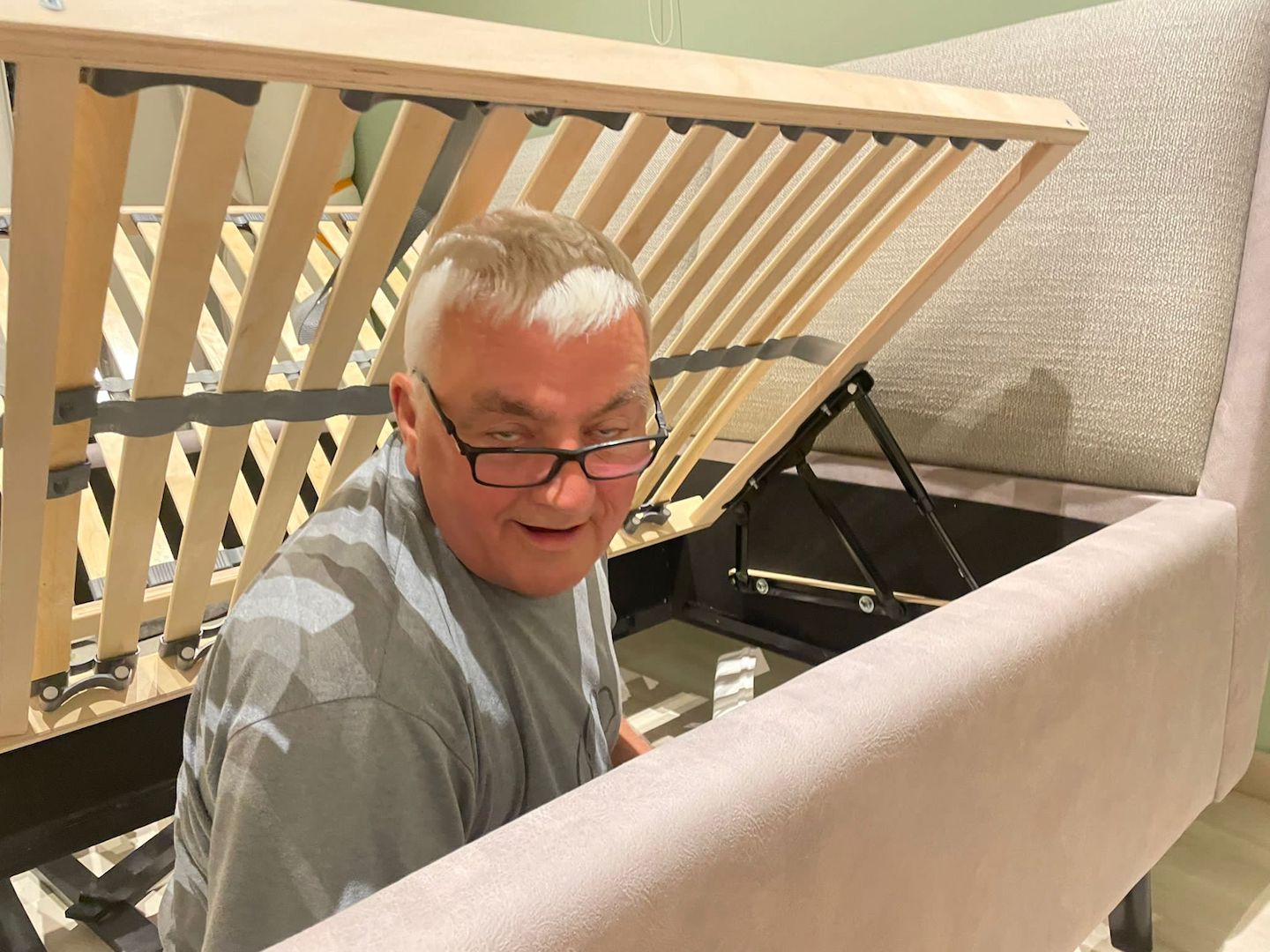 Samstag…lag so im Bett und dachte…der Mist im Wohnzimmer muss weg…Also raus aus den alten Federn…das alte Bett demontiert 🙁 was für eine Plackerei…wusste ja noch nichts vom Neuen…alles geschafft…Antje hat die Reste unterm Bett beseitigt…ein ganz schön dolles Flusenmeer schafft so ein Boxspringbett mit kaum Abstand zum Boden..Antje war Tapfer und alles sauber..nun gings los..zuerst der Rahmen .. war OK..auch alle Schrauben waren da :-)…die Härte warwn die hydraulischen Heber der Roste 3x Angebaut dann war alles richtig :-)… der Schutz der Teile …war der Hammer Plastikschalen nur Anzuschrauben als Fakier mit Jogalizenz…seht sebst