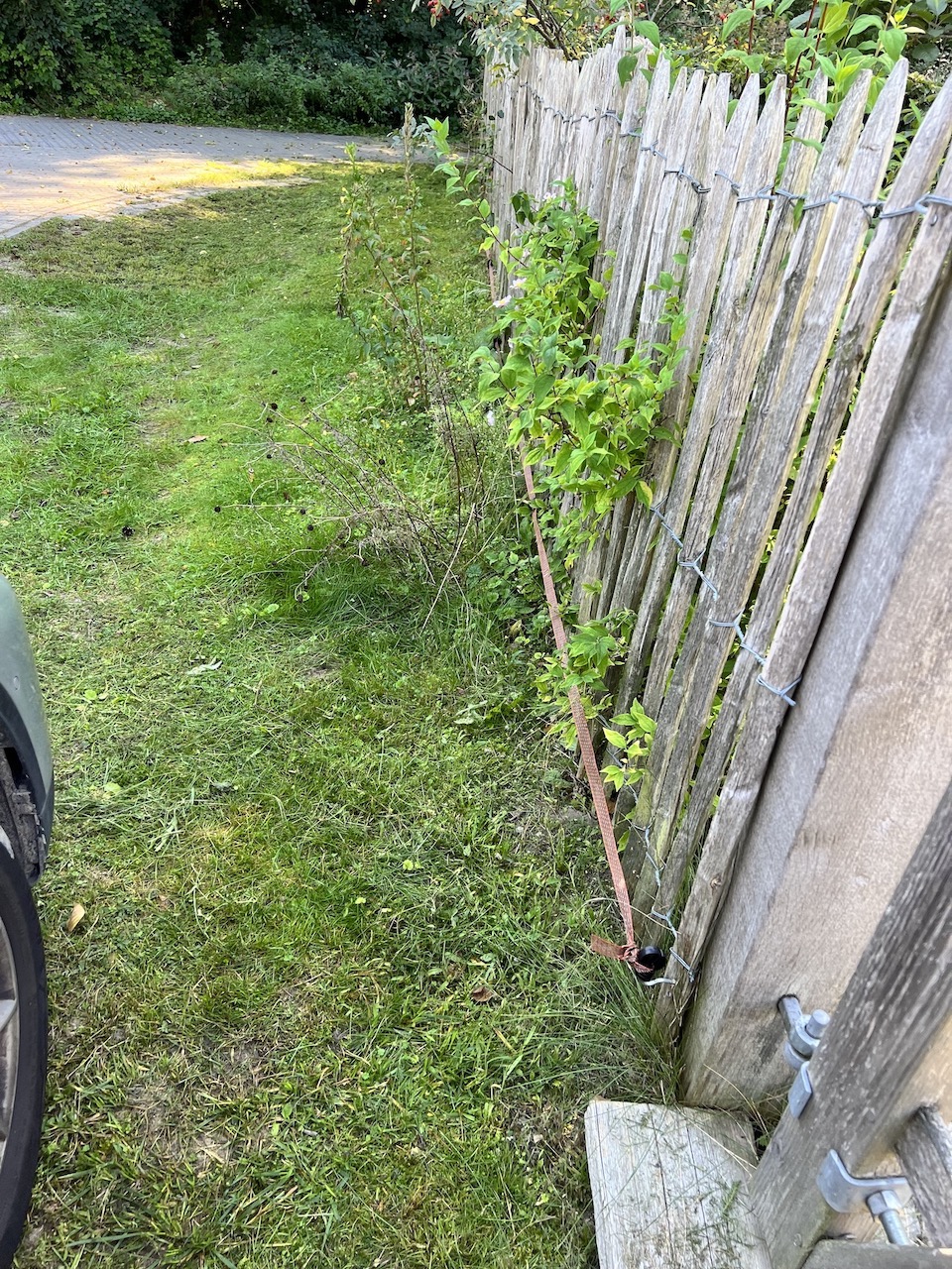 leider hat sich die Idee – das Weidegerät an den Zaundraht anzuschließen als nicht funktionsfähig gezeigt – deshalb nun ein Band 🙂 wie auf einer Pferdekoppel – das Gerät arbeiten von 18:00 uhr bis 6:00 Uhr – mit nur 4000V 🙂