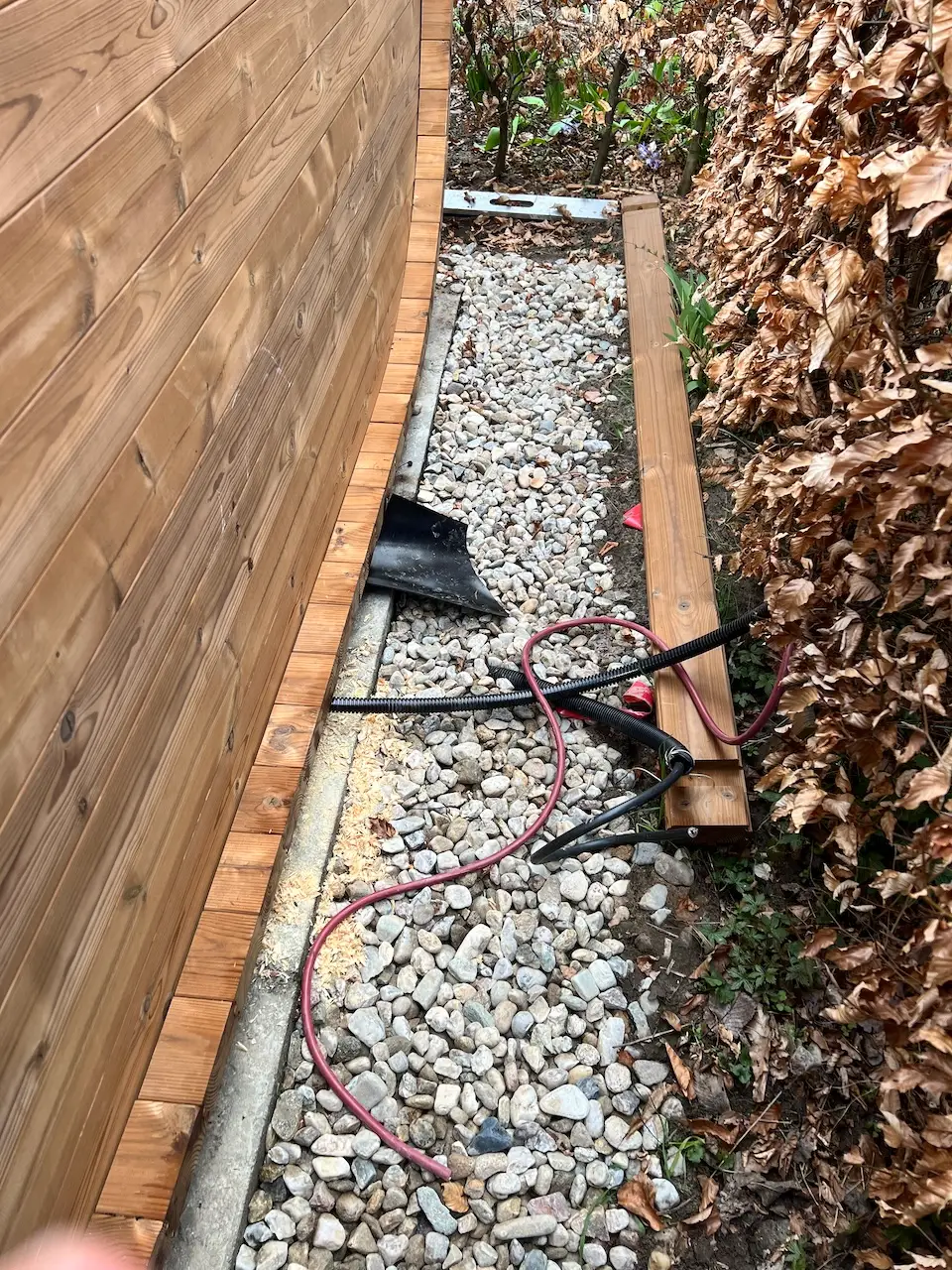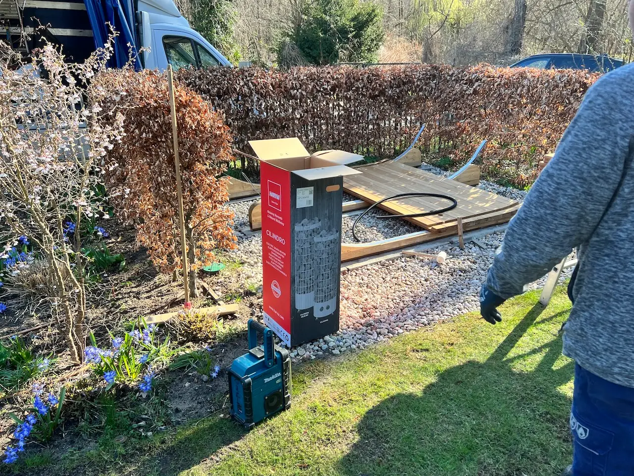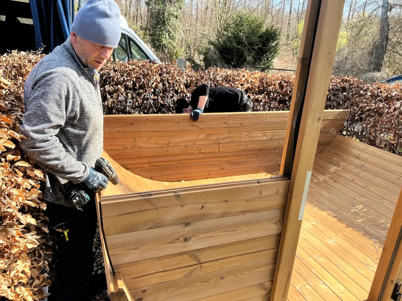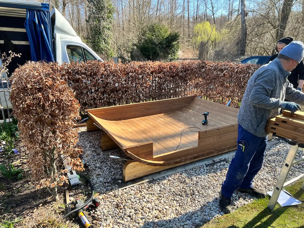 Pünklich zum Termin, kamen heute die Saunabauer. Ein Albaner und ein Pole, beide super nett und schaffig. Erste Feststellung das Fundament passt prima, Gott sei Dank !