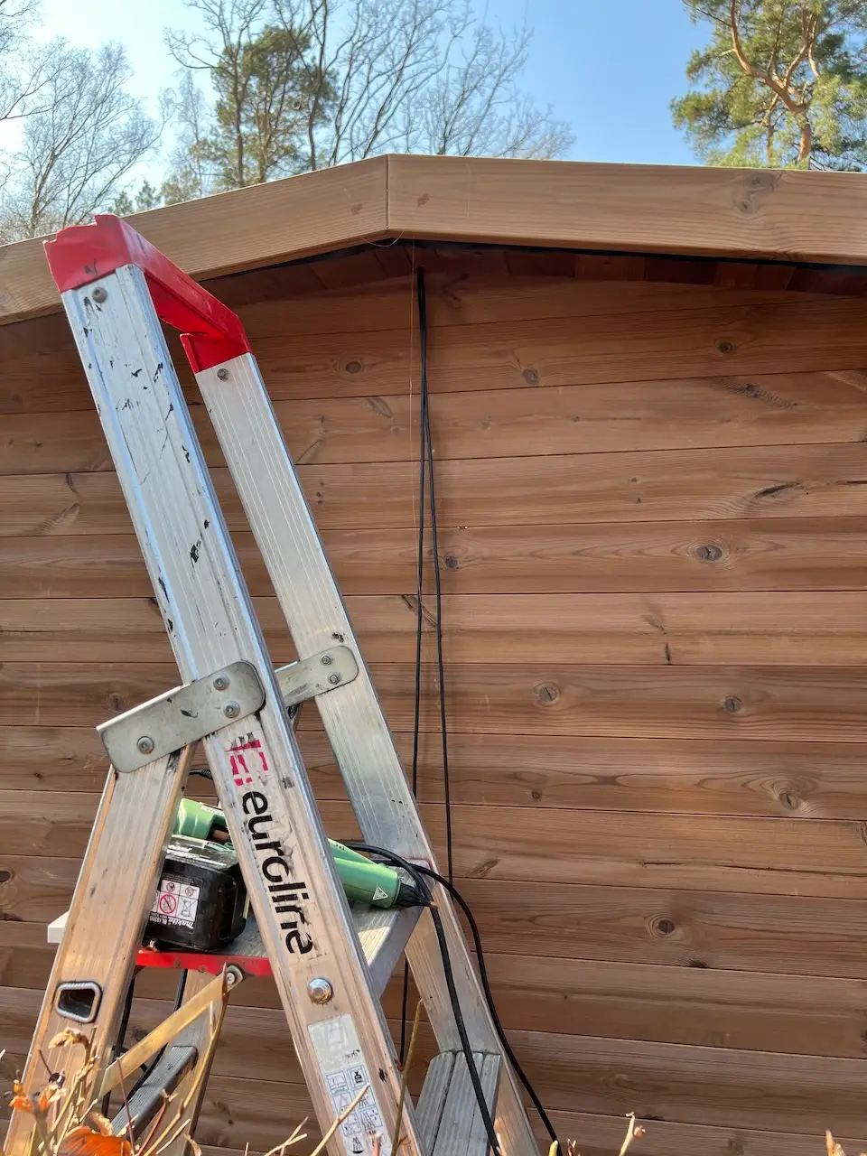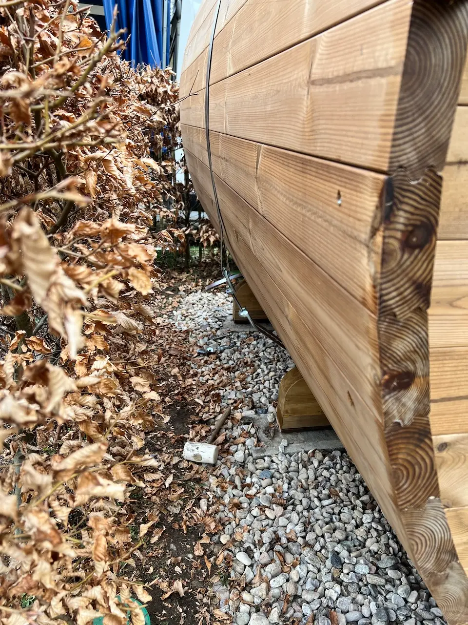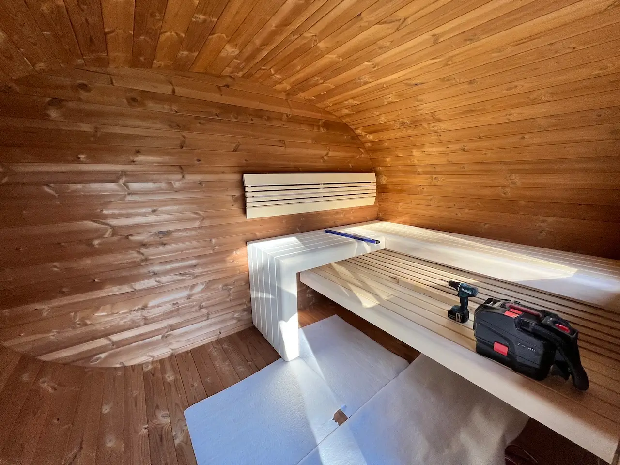 die Zwischenwand und rückwärtige Kabelkanäle, Dach fertig und noch eine kleine Anpassung durch mich angegeben. Der Ofen bekam noch ein kleines Kabelfach direkt an der Außenwand, damit sind die Kabel vom Ofen schön versteckt. Die Vorraumbänke sind nun ebenfalls montiert. Wir haben das Richtfest mit Cremant und Gegrilltem gefeiert.
