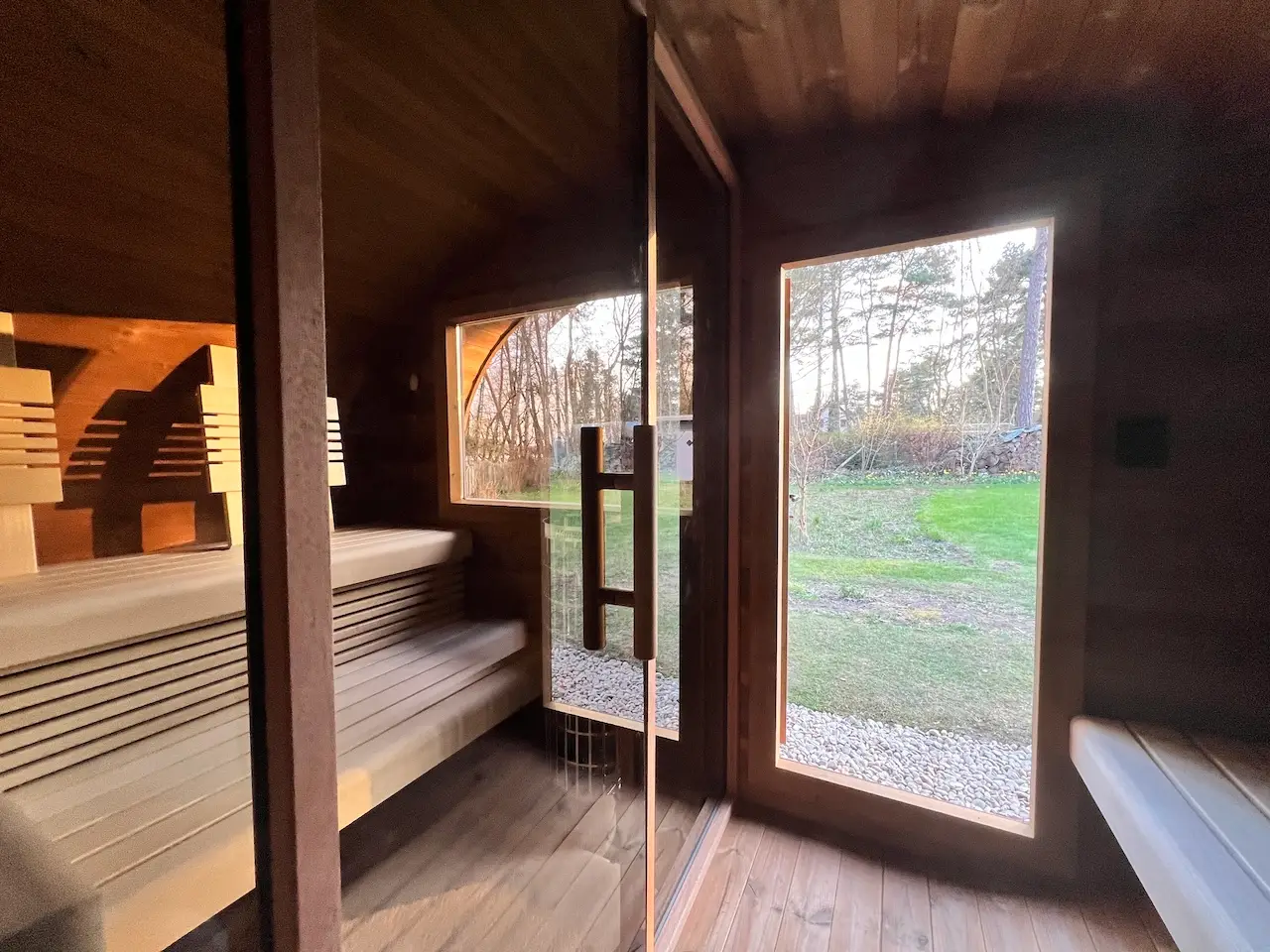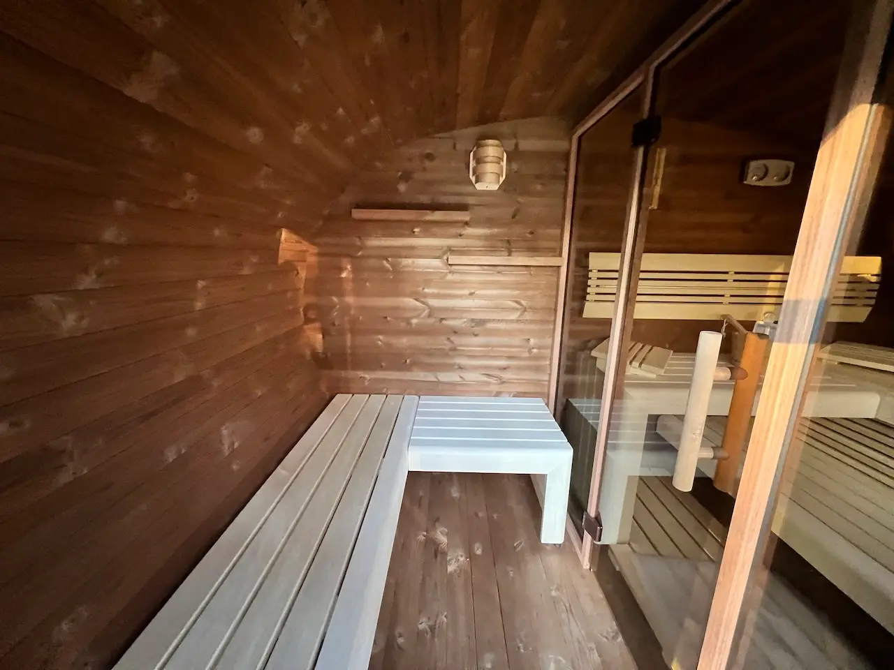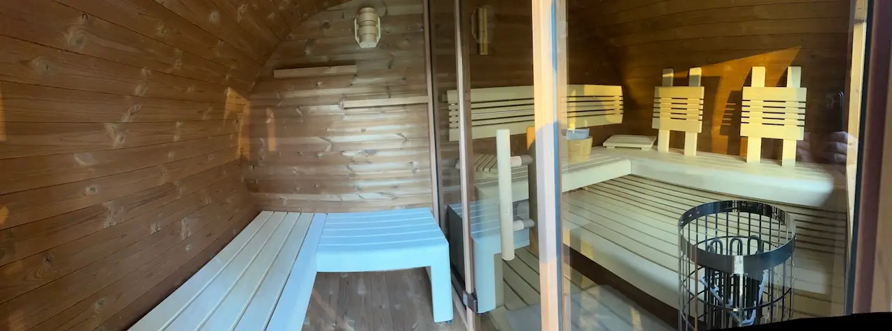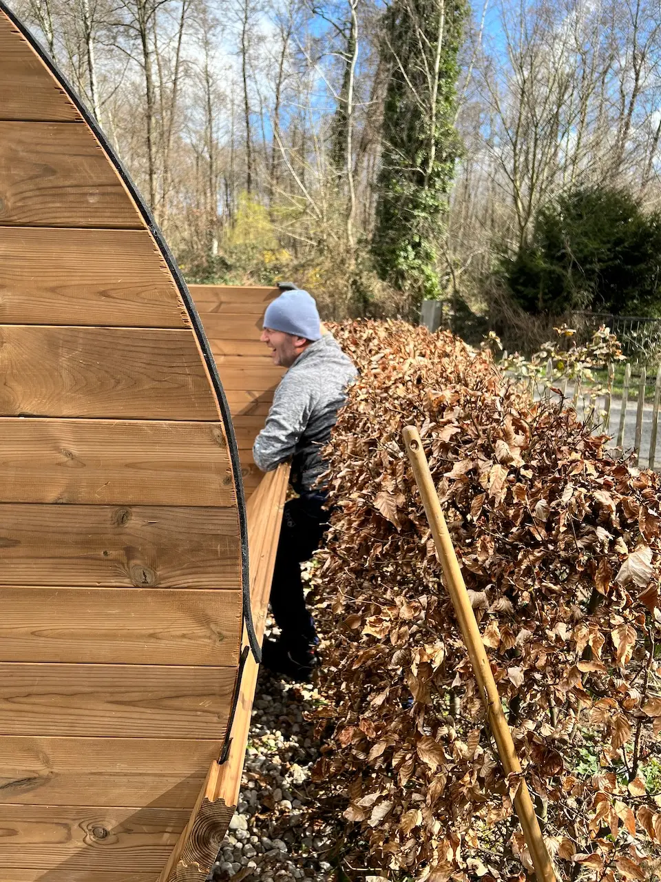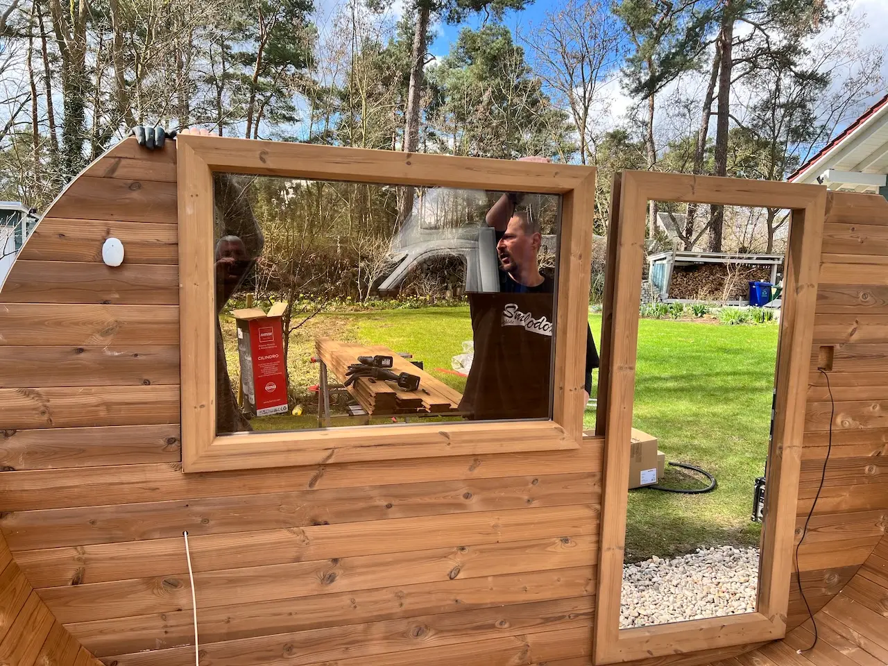 die Zwischenwand und rückwärtige Kabelkanäle, Dach fertig und noch eine kleine Anpassung durch mich angegeben. Der Ofen bekam noch ein kleines Kabelfach direkt an der Außenwand, damit sind die Kabel vom Ofen schön versteckt. Die Vorraumbänke sind nun ebenfalls montiert. Wir haben das Richtfest mit Cremant und Gegrilltem gefeiert.