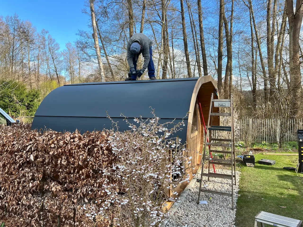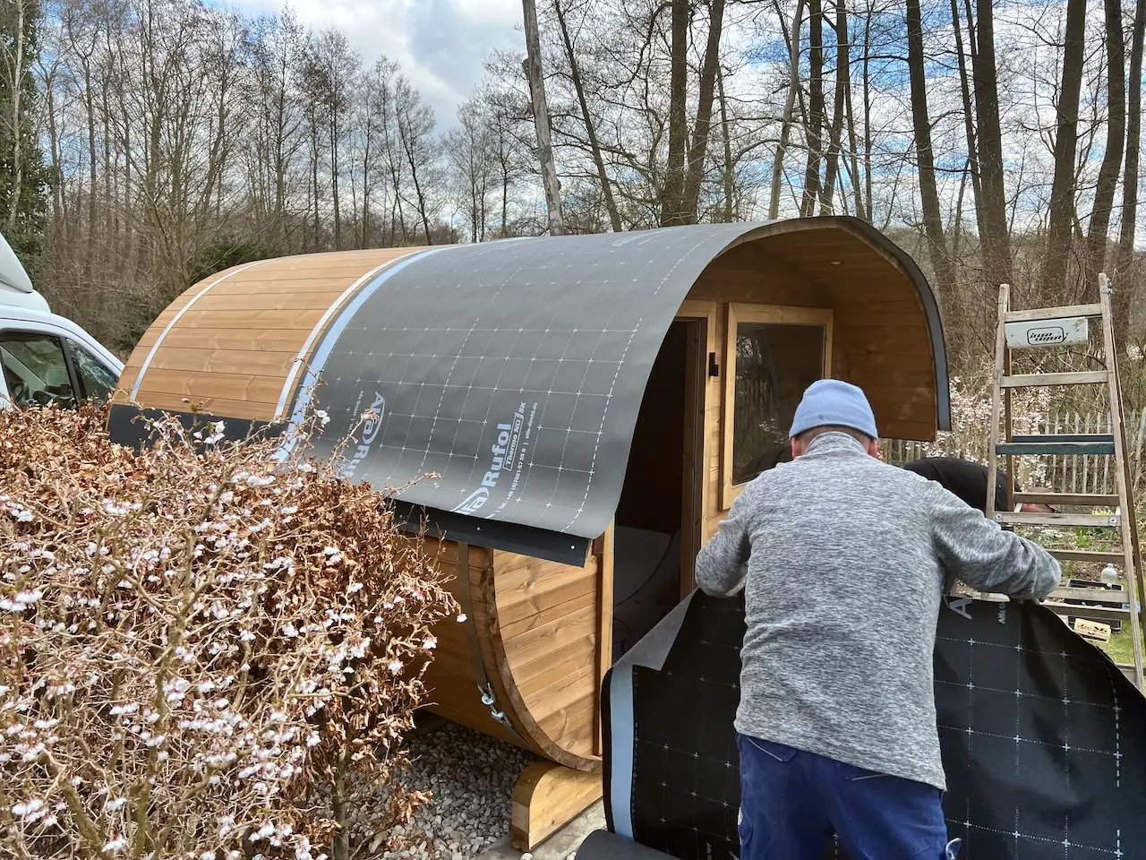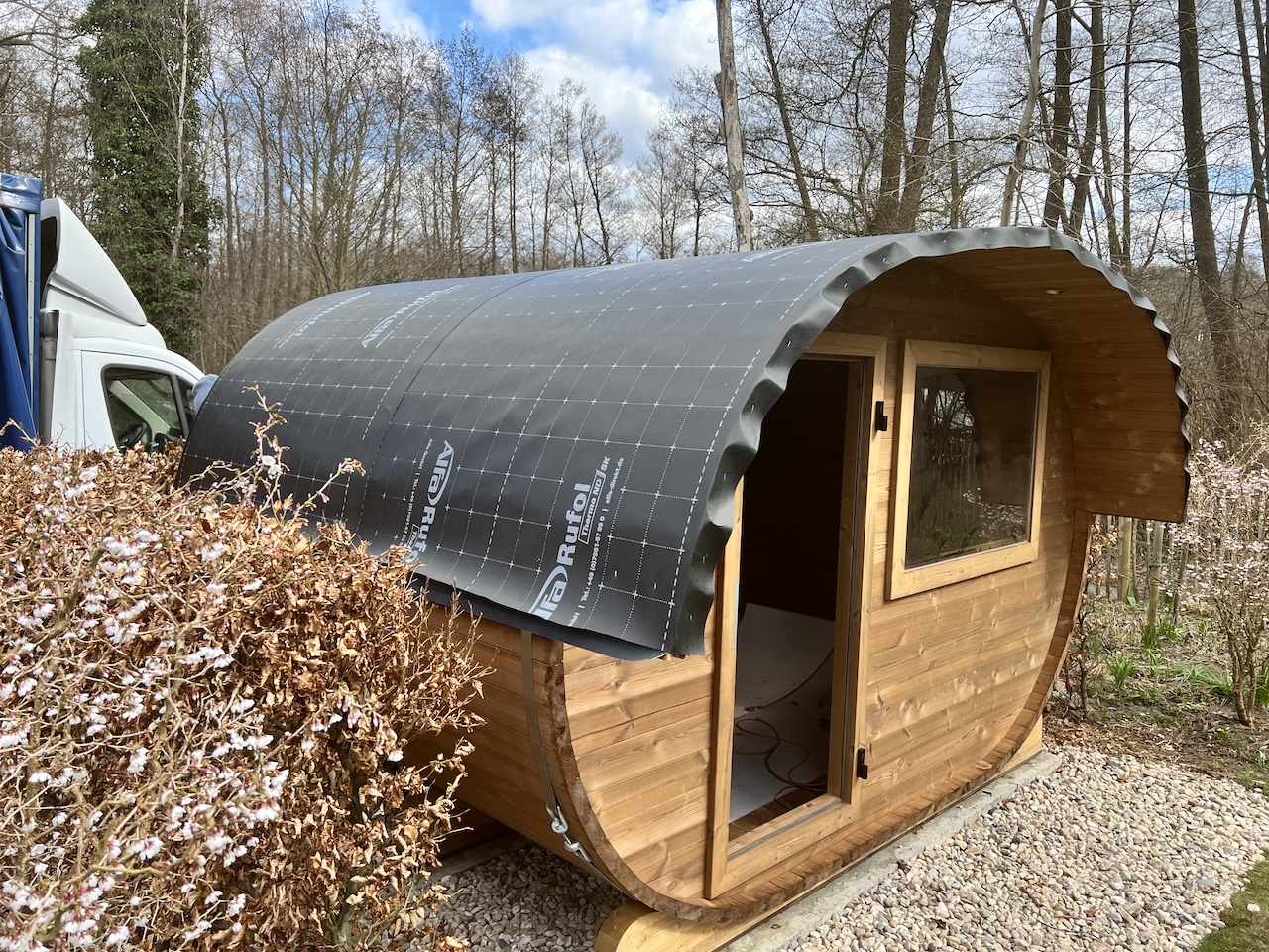 Zuerst wurden die Fundamentbohlen gesetzt, dann die Aussenwände hochgezogen. Fragte dann mal, wo kommt der Strom zum Ofen her ? Gute Frage – über ein Leerrohr durch die Fundamentbohlen – oh – man kam aber noch gut rand, trotzdem hätte man das vorbohren können – darüber waren wir uns schnell einig. Das Dach ist echt super hochwertig – zuerst eine Diffusionsbahn auf das Bohlenholz, dann noch ein Gittervlies um Dampf abzuleiten, darauf Alubleche super überlappend. In Summe ein tolles System und gut durchdacht – Bin Gottt froh nicht ein Billigprodukt im Internet gekauft zu haben. Die Jungs achten auf jedes Detail – war den ganzen Tag im Stand By – klasse Arbeit !