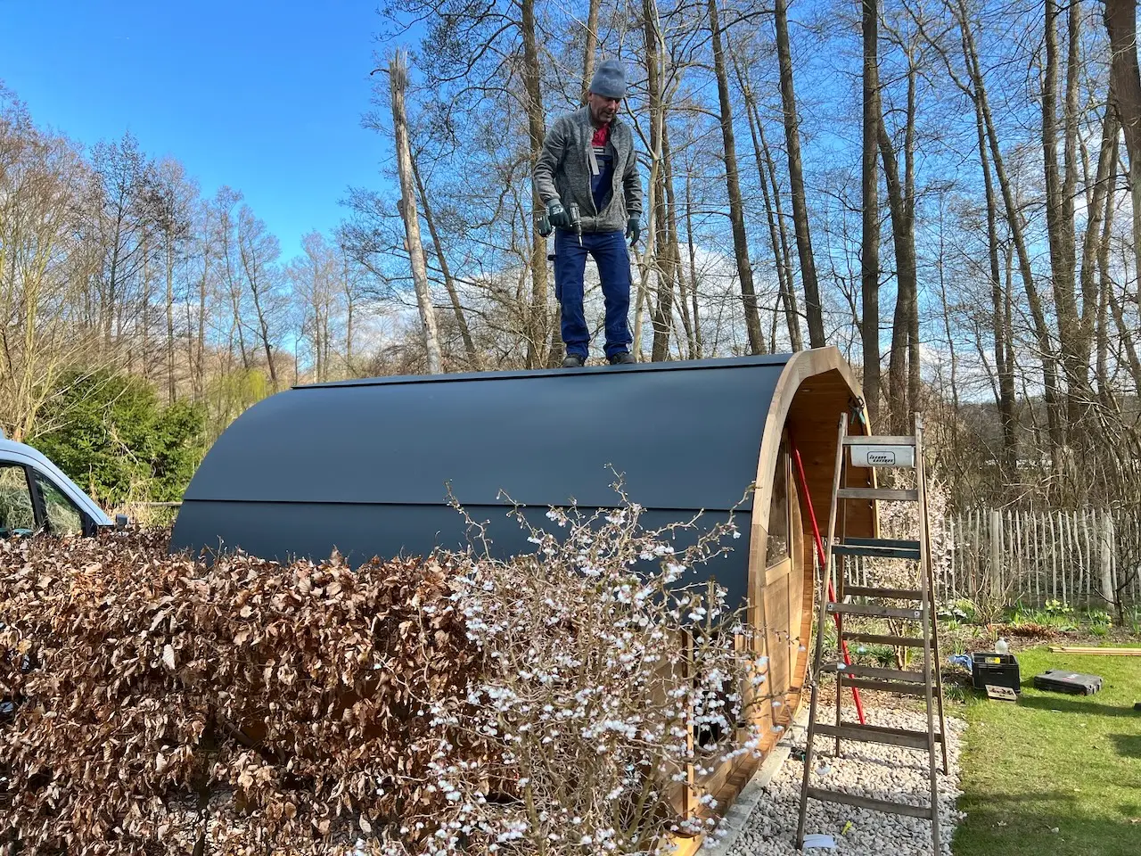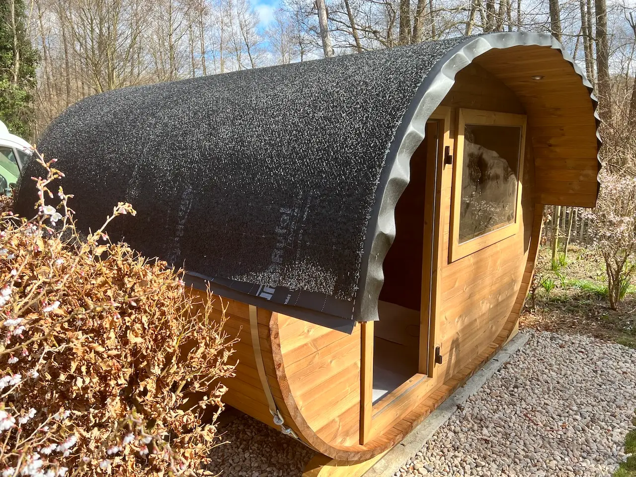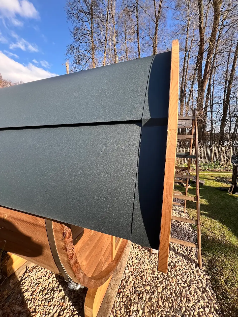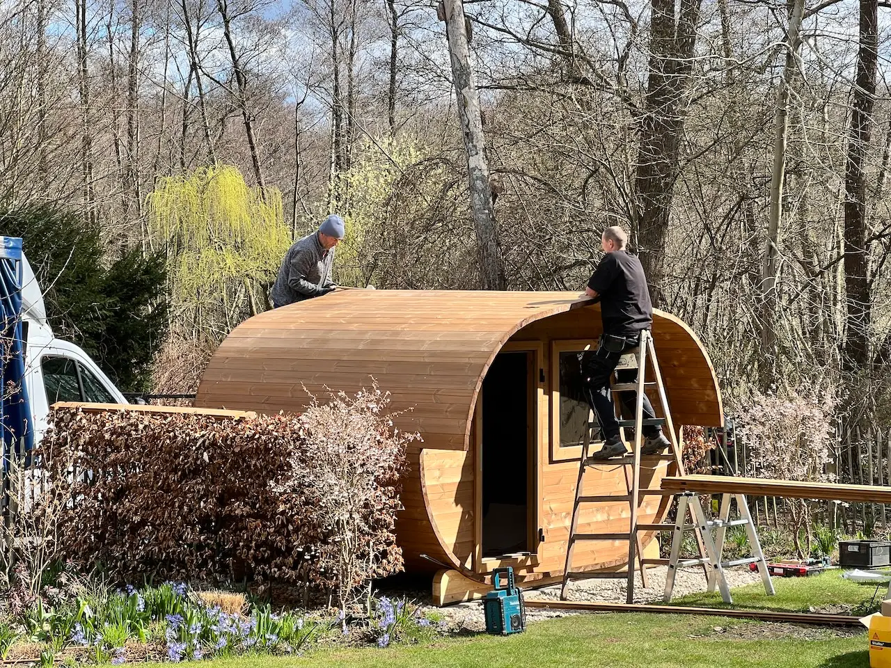 Zuerst wurden die Fundamentbohlen gesetzt, dann die Aussenwände hochgezogen. Fragte dann mal, wo kommt der Strom zum Ofen her ? Gute Frage – über ein Leerrohr durch die Fundamentbohlen – oh – man kam aber noch gut rand, trotzdem hätte man das vorbohren können – darüber waren wir uns schnell einig. Das Dach ist echt super hochwertig – zuerst eine Diffusionsbahn auf das Bohlenholz, dann noch ein Gittervlies um Dampf abzuleiten, darauf Alubleche super überlappend. In Summe ein tolles System und gut durchdacht – Bin Gottt froh nicht ein Billigprodukt im Internet gekauft zu haben. Die Jungs achten auf jedes Detail – war den ganzen Tag im Stand By – klasse Arbeit !