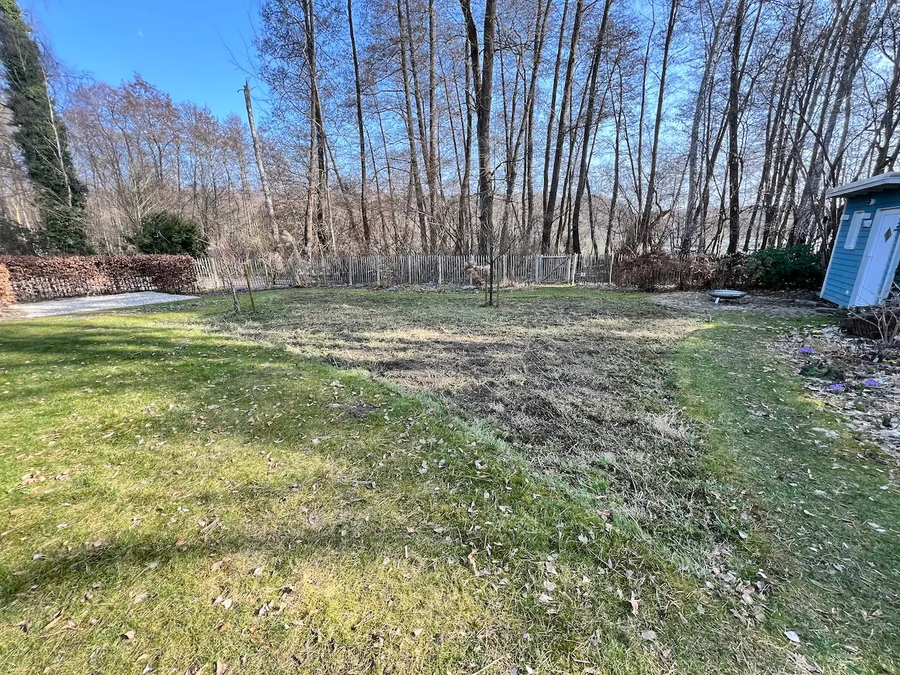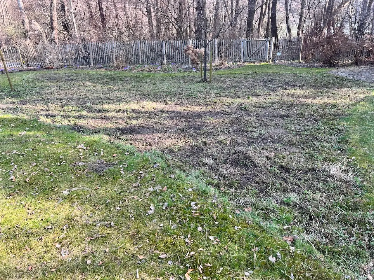 Also einmal mit Motorsense, immer wieder abrechen, Weiterschneiden, dann mit dem Rasenmäher und zum Schluss nochmals Abrechen wegen der Maulwurfshügel!