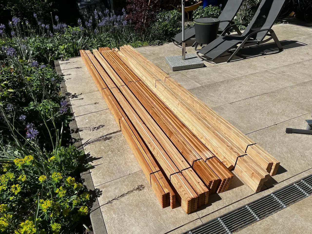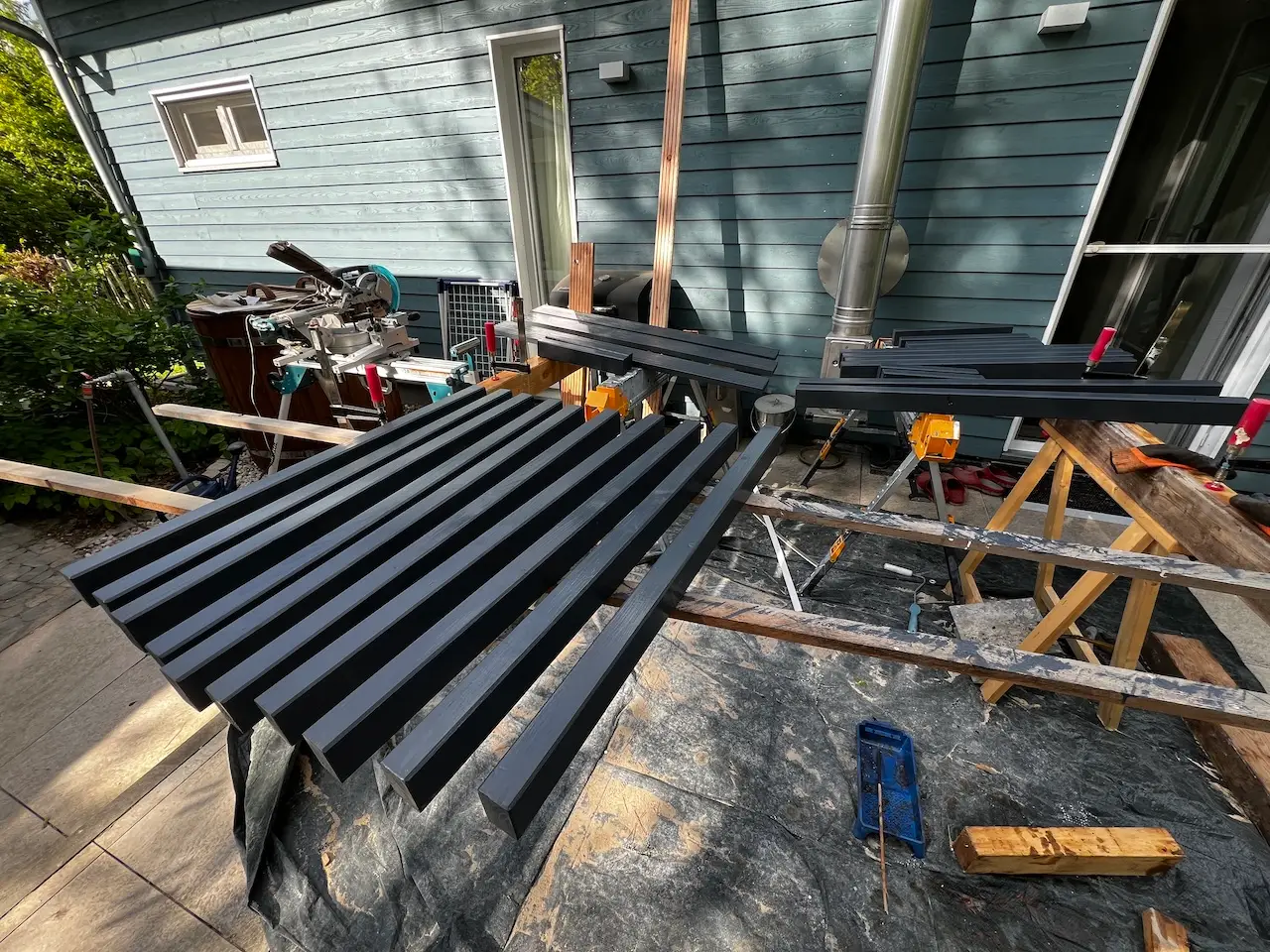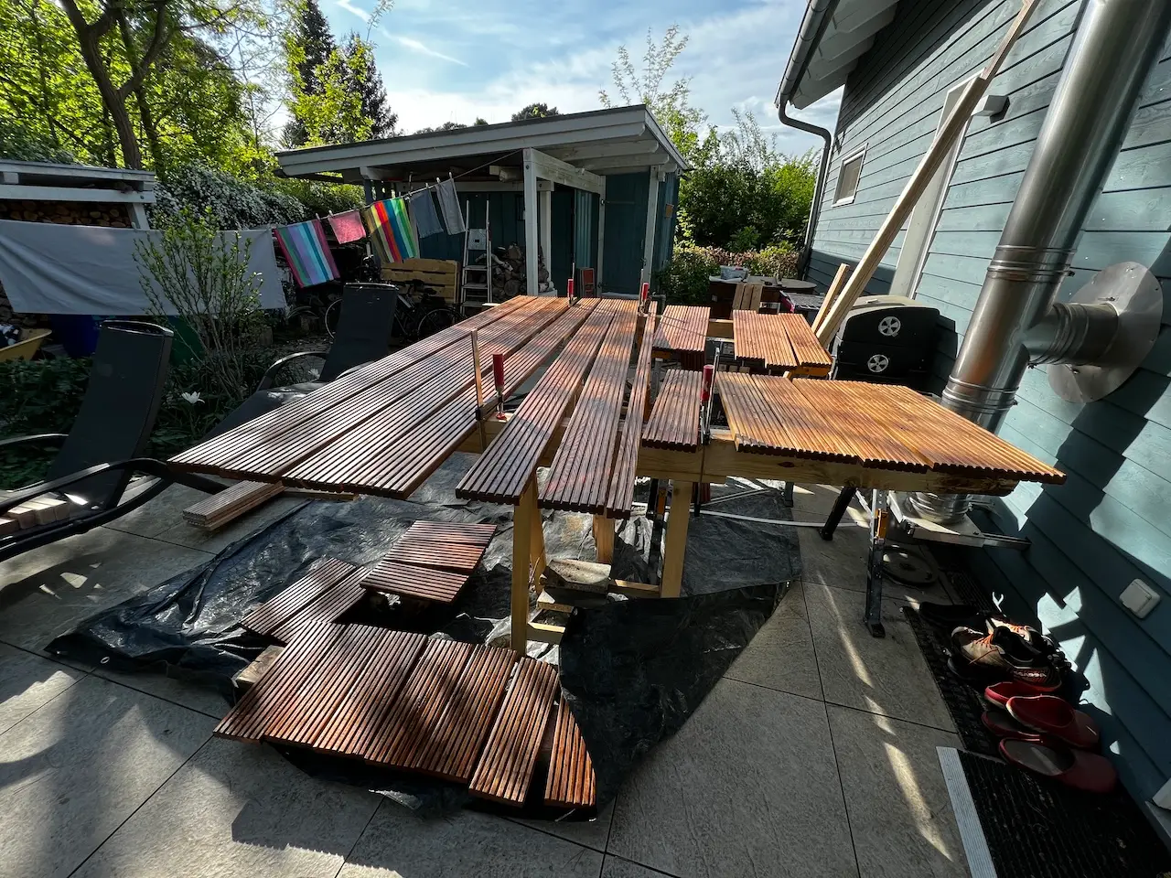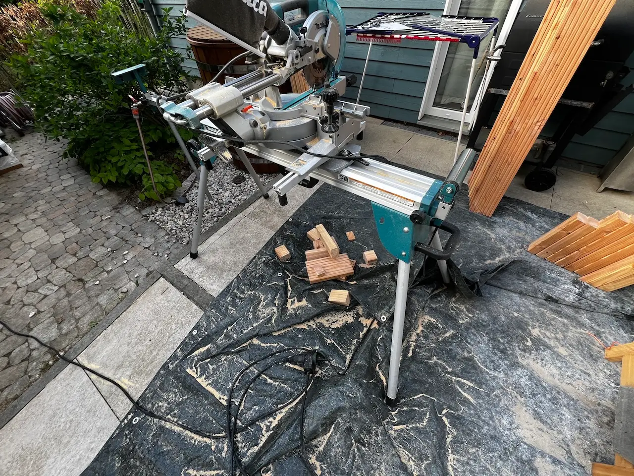 Dann Plane, Böcke und Kappsäge aufbauen und los ging es. Ersmal die 10 Lagerhölzer – etwas Überdimensioniert :-).