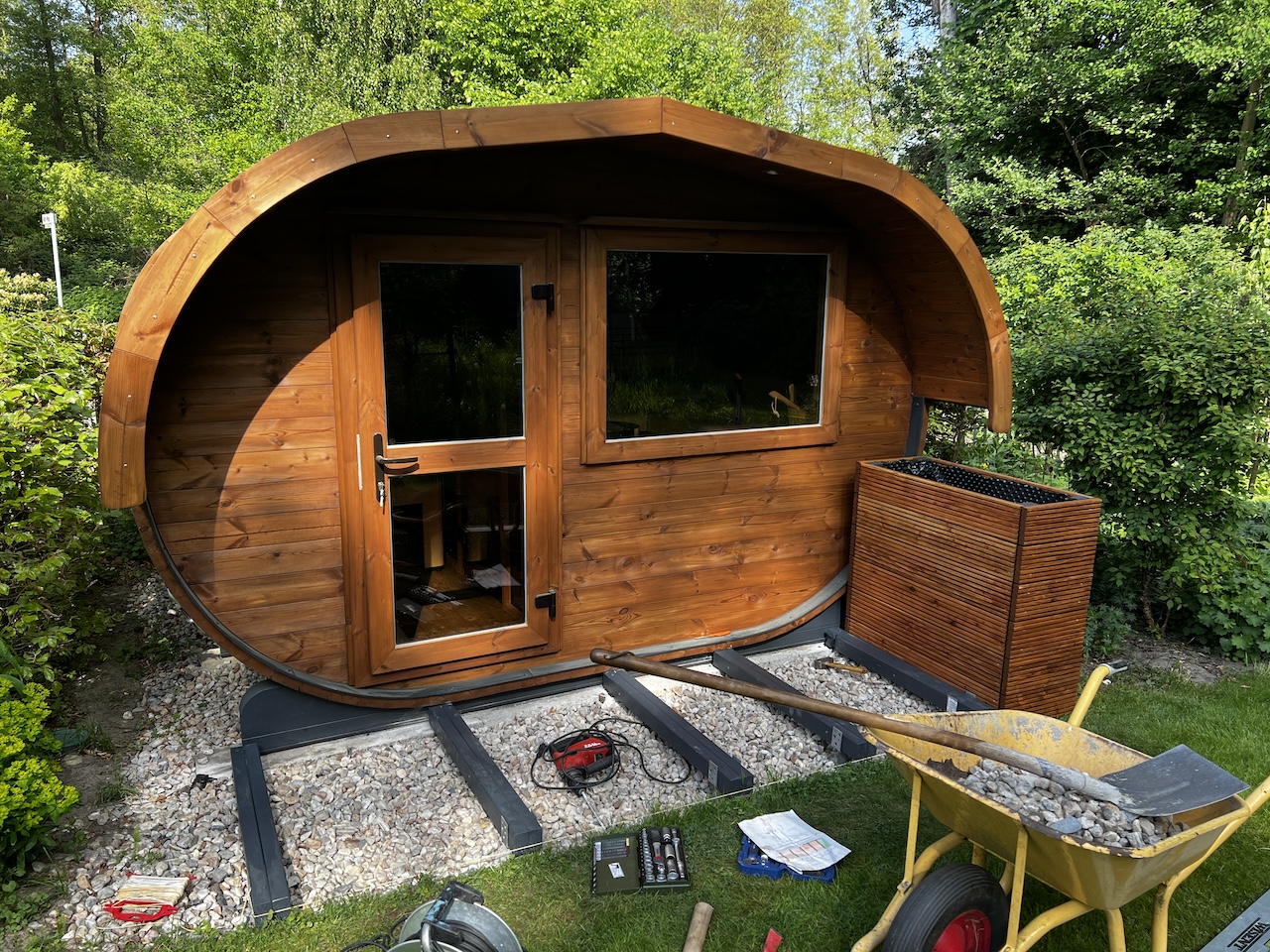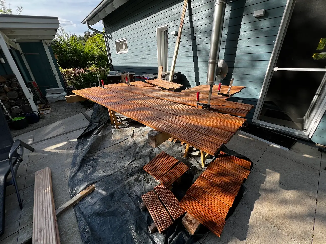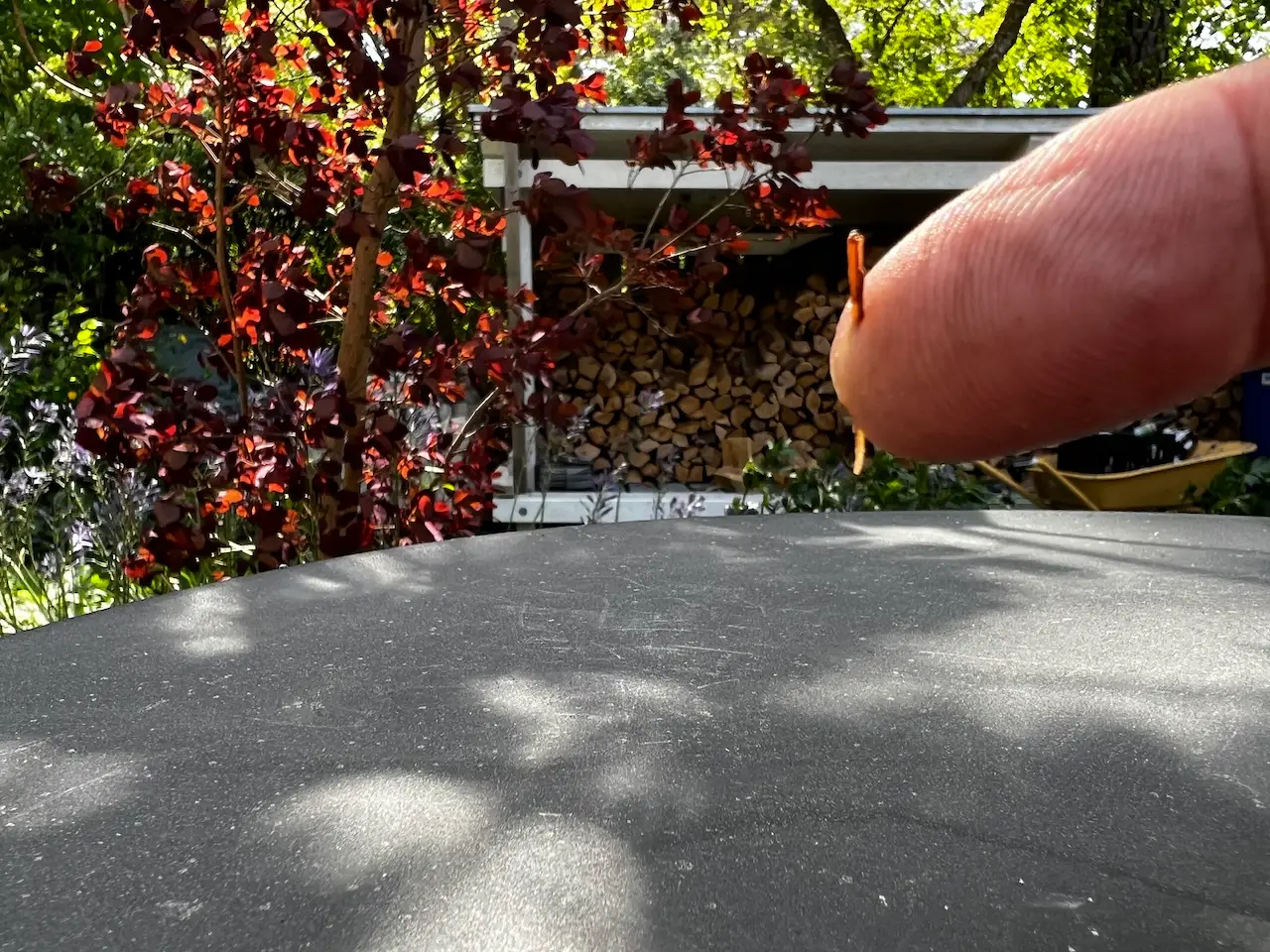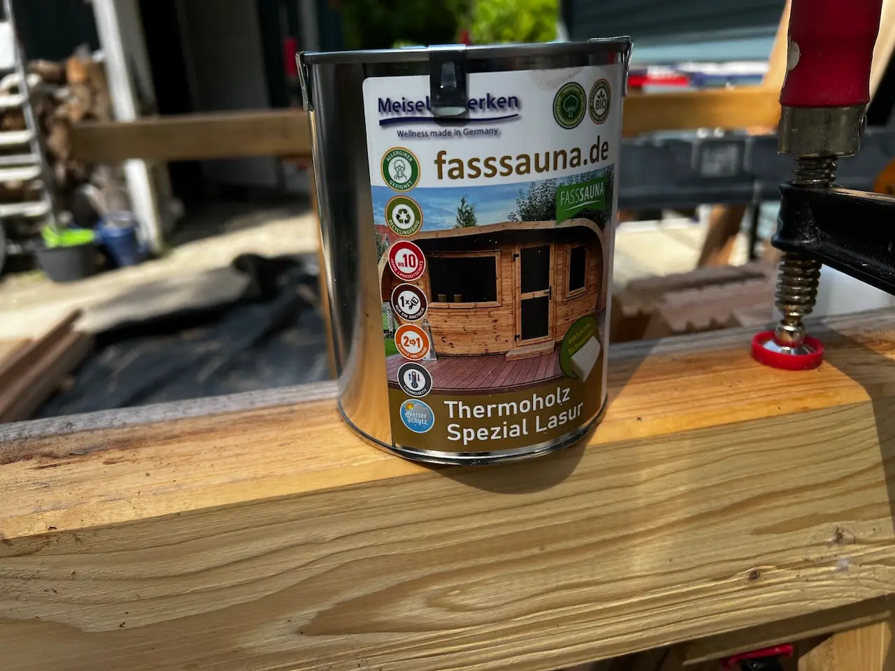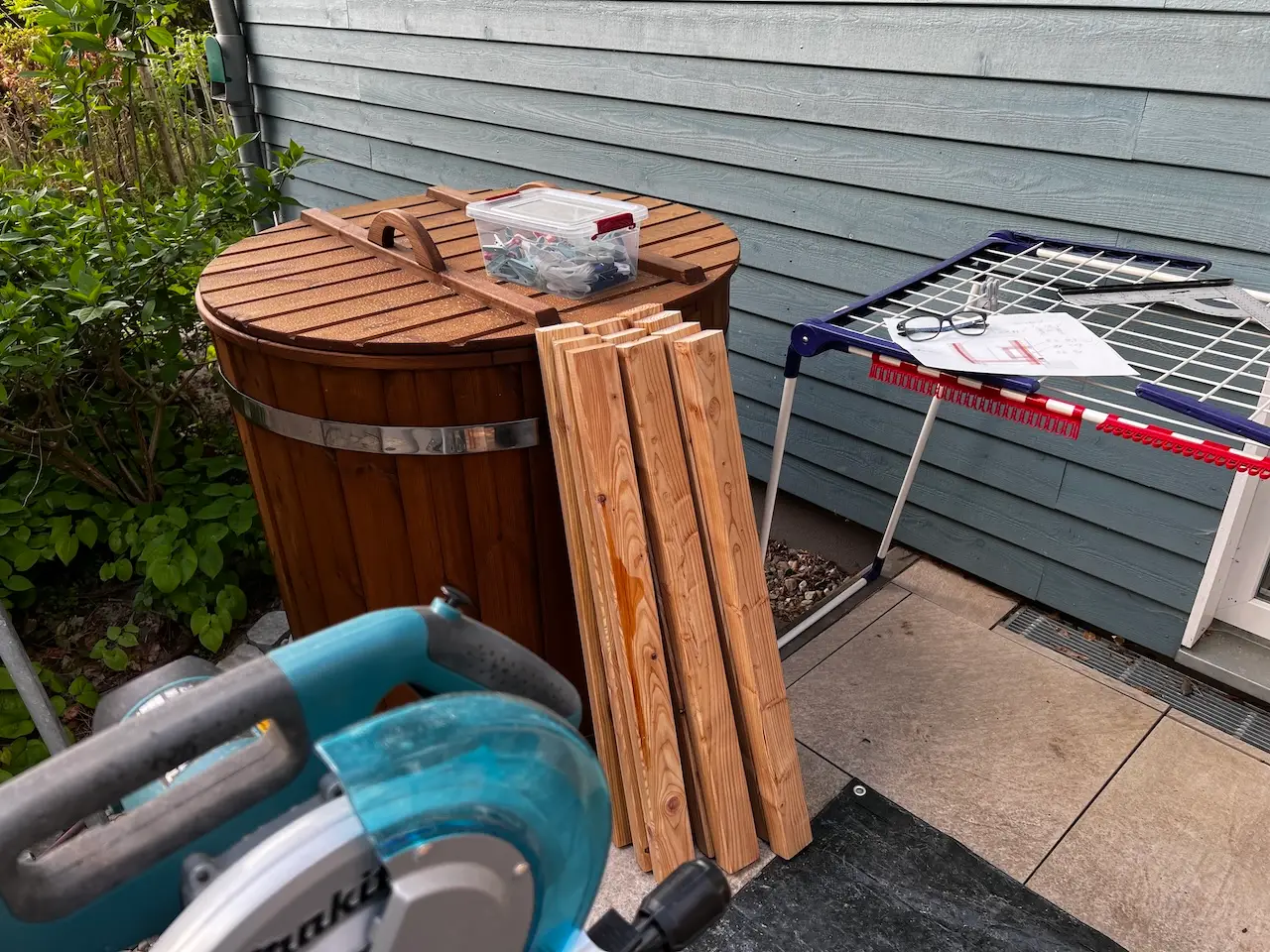 Die Dielen und Hochbeet hab ich mit der Saunalasur und Schwamm einmassiert 🙂 hab mir dabei einen Spreisel durch den Finger gezogen – Flachzange und raus 🙁