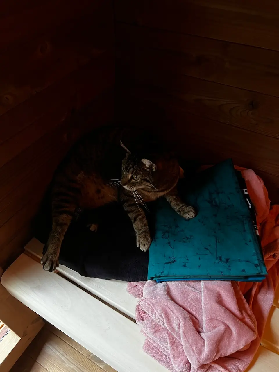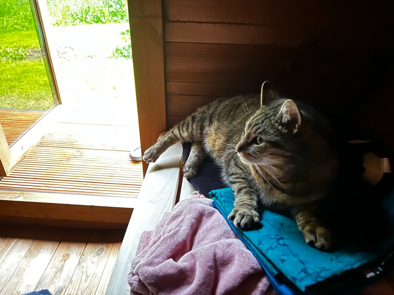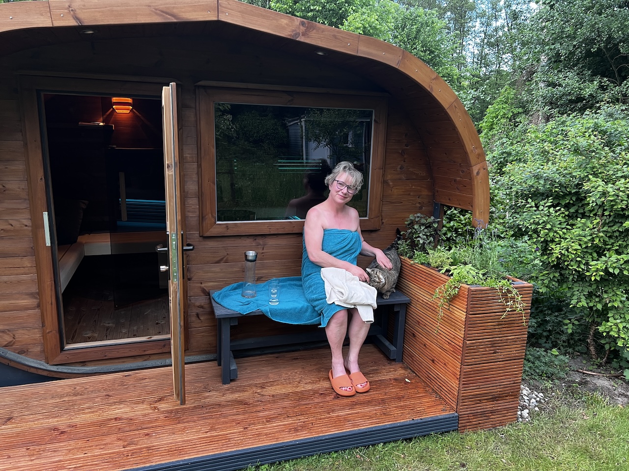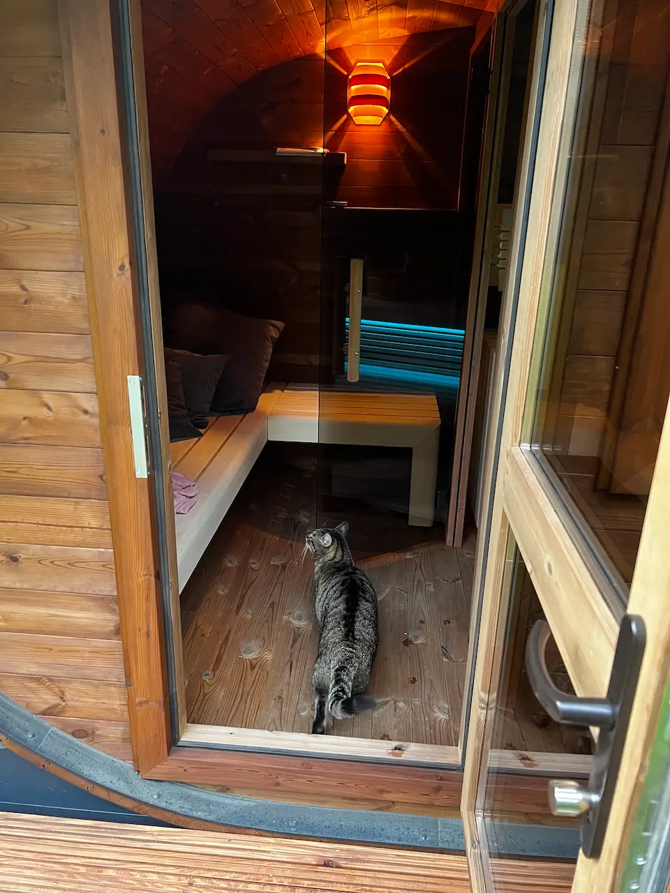 Abends dann in die Sauna – Mauzi saß auf der Bank und hat reingeschaut – und hat nach Abschluss cool die Sauna besichtigt – selbst im Saunainnenraum bei noch 50 Grad !