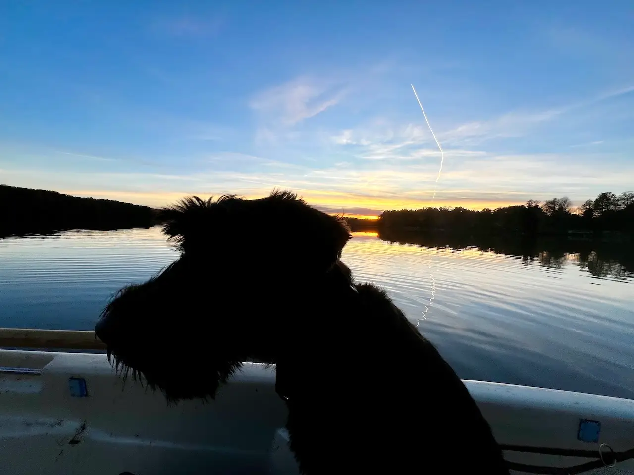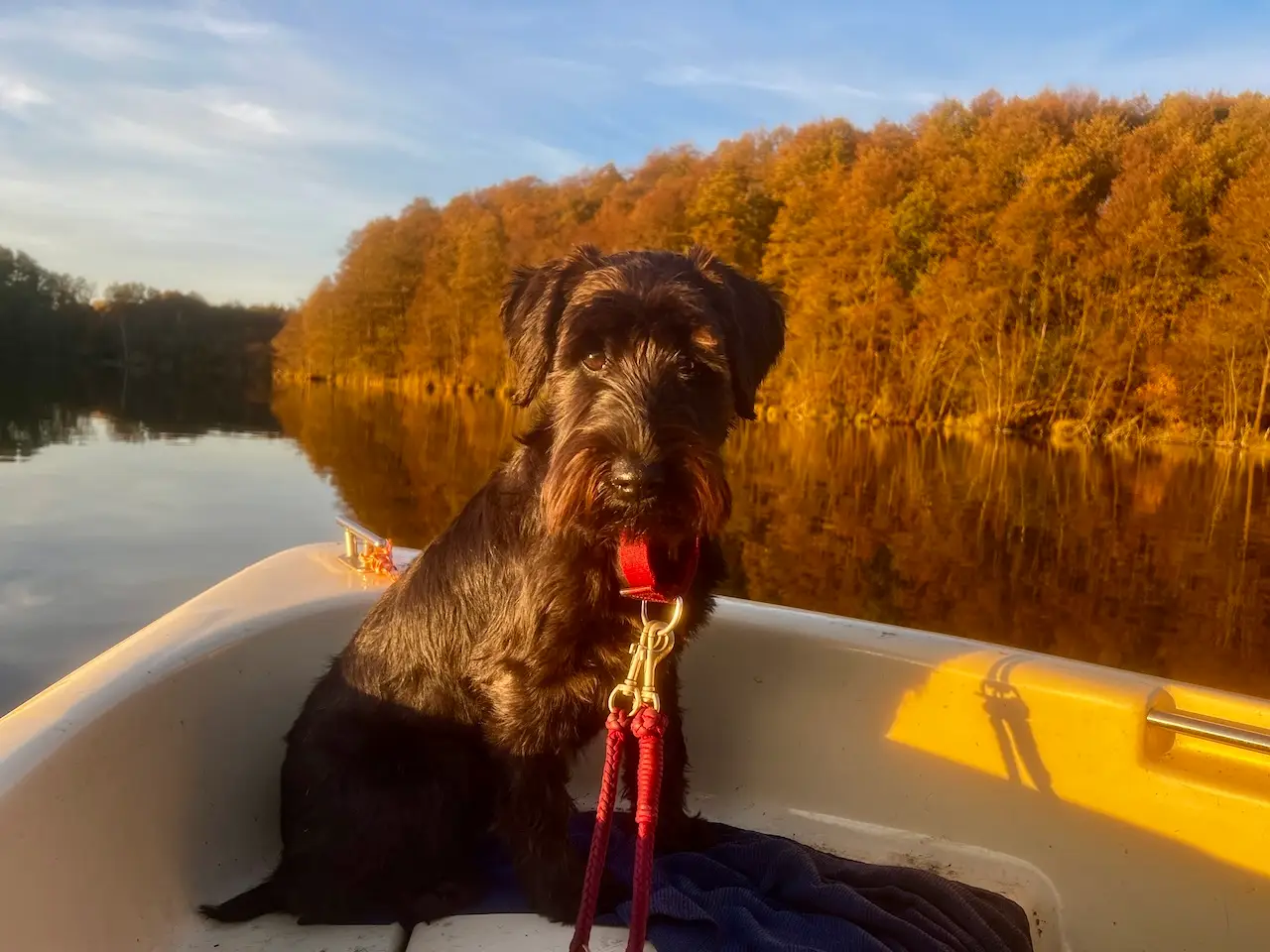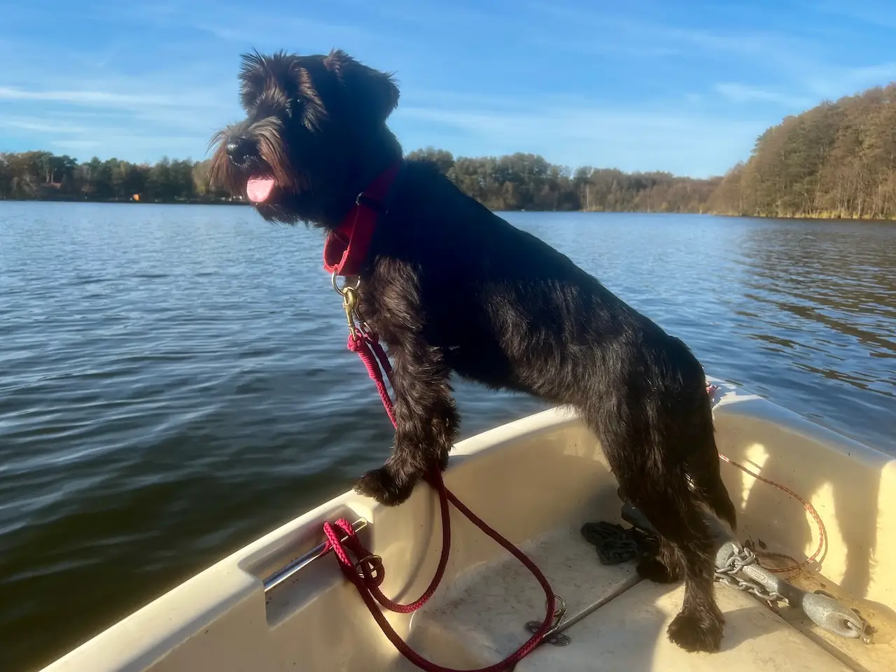 Kühne Aktion mit Paula zum ersten Mal auf See im Ruderboot – der Einstieg ging nur mit Handhilfe 🙂 Die Ruder fanden sofort ihre Begeisterung – was passiert da ? Nun wollte nicht gleich ganz weit rausfahren – nur bis zu Insel – Anker werfen und mit Gummifisch auf Hecht. Paula wollte unbedingt auf der Reling rumturnen und dann passierte es – Sie fiel ins Wasser :-/ – doch Alles halb so schlimm, schnell wieder rein dank Halsband und Hintern, doch dann war ihr kalt und es wurde oft geschüttelt – ich war nass – der Sitz usw. toll das die Sonne – Paula schnell wieder getrocknet hat – leider sind 4h an Bord zu lang ! Zu langweilig wie manchen Menschen 🙂