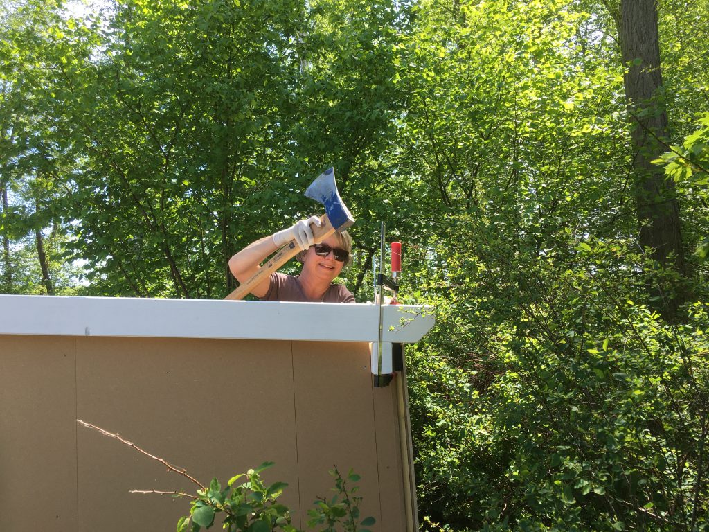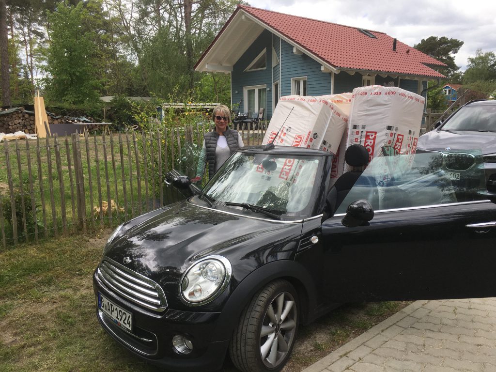 2020_07_25 Antje beim fröhliche Fugen- und Ritzen Verschließen… 2020_07_24 Am Freitag, war die Holzdecke aus weiss gestrichenem Rauspund eingebaut. 2020_07_25 So ging es am Samstag gleich mit dem Boden weiter und war dann auch Abends drin! Man beachte den besonderen Nagerschutz…aus verzinktem Vogeldraht…..“Patentiert von A.P.“ es musst nur noch Aufgeräumt werden !
