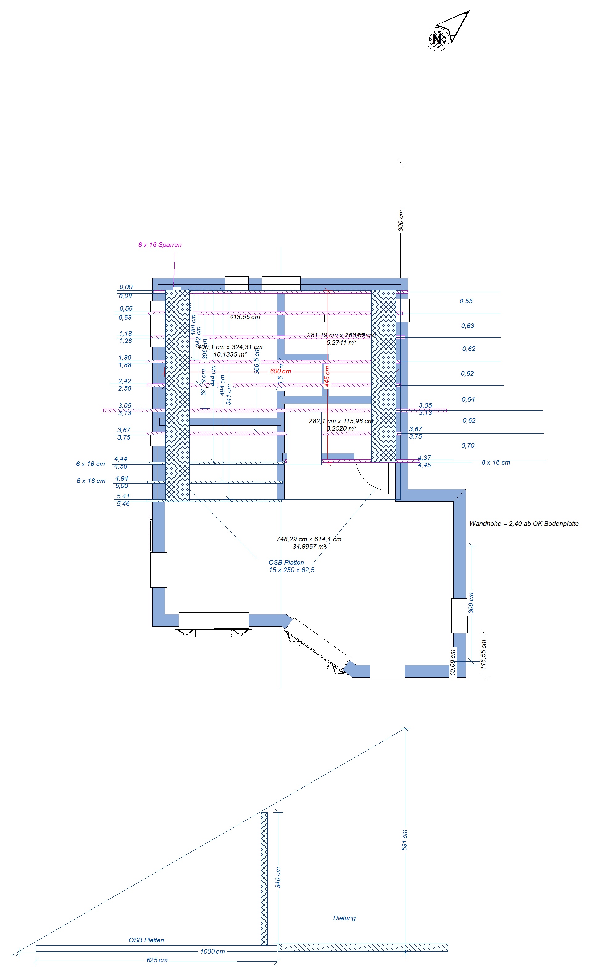 2016 – 11 – 18 Nachdem ich ja letztes Wochenende die Deckenbalken vermessen habe ergeben sich nun die Daten für die Dielenlänge im 1.OG….Da an den Seiten kaum Platz ist werden OSB-Platte eingebaut und mit der Teilung erst danach beginnen…siehe Schnitt unten