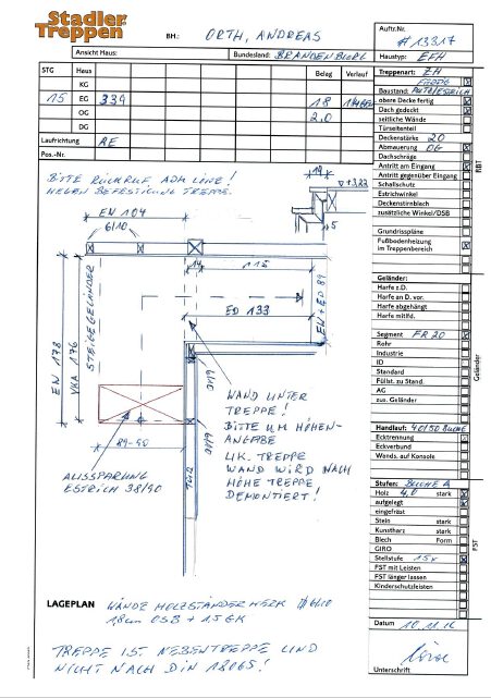 2016 – 11 -08 Genau um 12:00 Uhr habe ich mich heute am Dienstag mit Herrn Löwe von Stadler Treppen verabredet zum örtlichen Aufmaß…..hat sich Alles ganz schön hingezogen….also um 13:30Uhr waren wir uns einig….ich prüfe, ob man den zweiten Querbalken entfernen kann…sonst wird die Sache doch sehr steil !…Ach ja die Befestigung wird noch