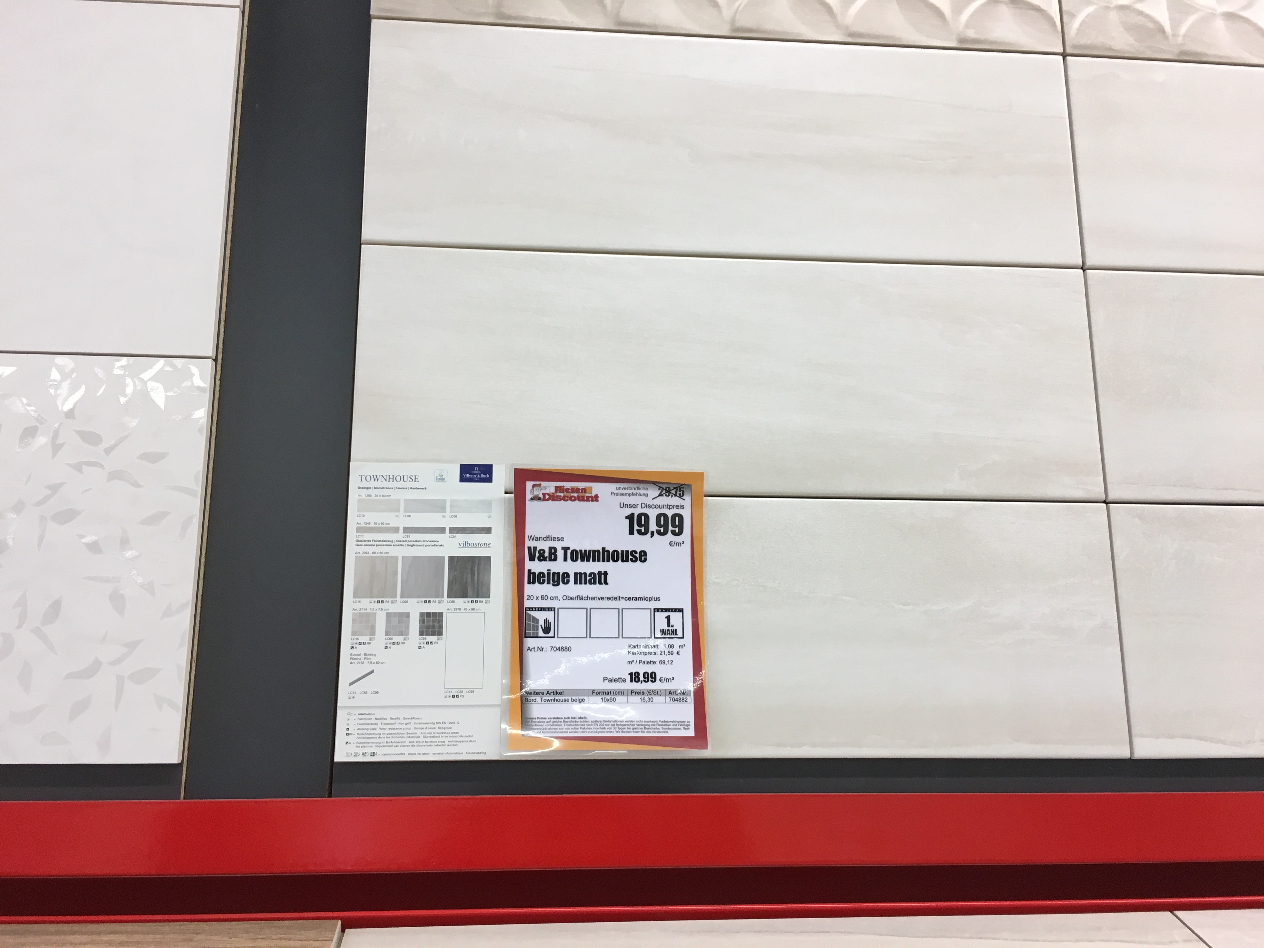 Heute am 31.10. also Reformationstag waren Marija und ich nochmals Fliesen gucken…Also hin zum „Fliesen Discount“ da waren wir vor ein paar Wochen schon einmal…doch diesmal mit der Fliese von ATALA im Gepäck…wir haben uns nun für die Villeroy und Boch Fliese „Townhouse beige matt“ entschieden (siehe Fassadenbild rechts)..durften eine umsonst mitnehmen…bei ATALA 17EUR bezahlt….und einen Fliesenleger getroffen, der evtl. im Januar arbeiten könnte.